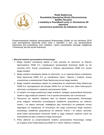 Rada Nadzorcza Suwalskiej Specjalnej Strefy Ekonomicznej Spółka Akcyjna z siedzibą w Suwałkach przy ul. Noniewicza 49 zaprasza uprawnione podmioty do składania ofert na: Przeprowadzenie badania sprawozdania finansowego Spółki za rok obrotowy 2015 oraz sporządzenie pisemnej opinii wraz z raportem o tym, czy sprawozdanie finansowe jest prawidłowe oraz rzetelnie i jasno przedstawia sytuację majątkową i finansową, jak też wynik finansowy. I. Warunki badania sprawozdania finansowego: 1. Biegły rewident obowiązany będzie w razie potrzeby do obecności na Walnym Zgromadzeniu SSSE S.A. rozpatrującym sprawozdanie finansowe Spółki za rok obrotowy 2015. Koszty uczestnictwa w Walnym Zgromadzeniu SSSE S.A. ponosi biegły rewident. 2. Biegły rewident obowiązany będzie do obecności, na co najmniej jednym posiedzeniu Rady Nadzorczej SSSE S.A. po przedłożeniu Opinii i Raportu z badania. Koszty uczestnictwa w posiedzeniach Rady Nadzorczej ponosi biegły rewident. 3. Biegły rewident obowiązany będzie do przekazania do wiadomości Rady Nadzorczej SSSE S.A. sporządzanych dla Zarządu SSSE S.A. (w formie tzw. listów intencyjnych) informacji o problemach w systemie rachunkowości Spółki. 4. W badaniu nie mogą uczestniczyć biegli rewidenci, badający sprawozdanie finansowe Spółki w ciągu kolejnych ostatnich 3 lat w sposób samodzielny lub w konsorcjum. 5. Dopuszcza się wspólne składanie ofert na badanie sprawozdania finansowego przez biegłych rewidentów prowadzących działalność gospodarczą we własnym imieniu i na własny rachunek, działających jako konsorcjum na podstawie umowy regulującej ich współpracę. W konsorcjum nie mogą uczestniczyć biegli rewidenci prowadzący działalność gospodarczą we własnym imieniu i na własny rachunek, jeżeli badali sprawozdanie finansowe Spółki w ciągu kolejnych ostatnich trzech lat samodzielnie lub jako uczestnicy innego konsorcjum. 6. Pełna płatność za przeprowadzenie badania sprawozdania finansowego nastąpi po przyjęciu przez Radę Nadzorczą SSSE S.A. Opinii i Raportu z badania. 7. Ostateczny termin przekazania Opinii i Raportu: 30 marca 2016 r. Pisemne oferty należy składać w zamkniętej kopercie oznaczonej napisem „Oferta na badanie sprawozdania finansowego SSSE S.A. za 2015 r.” w siedzibie Spółki w Suwałkach ul. Noniewicza 49 lub przesłać na adres Spółki w terminie do dnia 15.10. 2015 r. do godziny 15.00. II. Oferta powinna zawierać: 1. Informacje o oferencie, w tym o formie prowadzenia działalności gospodarczej, aktualnym wpisie do rejestru biegłych rewidentów z podaniem numeru i daty wpisu, wpisie oferenta na listę podmiotów uprawnionych do badania sprawozdań finansowych z podaniem numeru i daty wpisu, o liczbie zatrudnionych biegłych rewidentów. 2. Oświadczenie o spełnieniu przez biegłego rewidenta ustawowo określonych warunków do wyrażenia bezstronnej i niezależnej opinii o badanym sprawozdaniu finansowym. 3. Cenę za badanie sprawozdania finansowego oraz sporządzenie pisemnej opinii o badanym sprawozdaniu finansowym, wraz z raportem z badania tego sprawozdania. Cena winna uwzględniać wszelkie koszty związane z przeprowadzeniem badania. 4. Określenie składu zespołu przeprowadzającego badanie oraz zobowiązanie się do przeprowadzenia badania wyłącznie przez osoby posiadające uprawnienia biegłego rewidenta. 5. Wskazanie metod i terminów badania sprawozdania finansowego. 6. Opis doświadczenia w badaniu sprawozdań spółek i podmiotów o podobnej skali działalności. 7. Informację czy oferent prowadzi doradztwo prawne i podatkowe. 8. Oświadczenie o przyjęciu zobowiązania konieczności uczestnictwa na Walnym Zgromadzeniu SSSE S.A. oraz na posiedzeniach Rady Nadzorczej SSSE S.A. na warunkach określonych w ogłoszeniu. 9. Dokument stwierdzający posiadanie ubezpieczenia od odpowiedzialności cywilnej oferenta. 10. Projekt umowy o badanie sprawozdania finansowego. III. Rada Nadzorcza Suwalskiej Specjalnej Strefy Ekonomicznej S.A. zastrzega sobie prawo swobodnego wyboru oferty oraz odstąpienia od wyboru oferty, bez podania przyczyny i ponoszenia jakichkolwiek skutków prawnych i finansowych. IV. Otwarcie ofert i wybór biegłego rewidenta do badania sprawozdania finansowego nastąpi 23.10.2015 r. w siedzibie Spółki, przy ul. Noniewicza 49 w Suwałkach. Wszelkie informacje dotyczące badania sprawozdania można uzyskać w siedzibie Spółki – 16-400 Suwałki, ul. Noniewicza 49, drogą elektroniczną: [email protected] lub pisemnie w terminie 7 dni od daty ukazania się niniejszego ogłoszenia. Zgłoszenia niespełniające nie będą rozpatrywane. powyższych wymagań lub złożone po terminie,