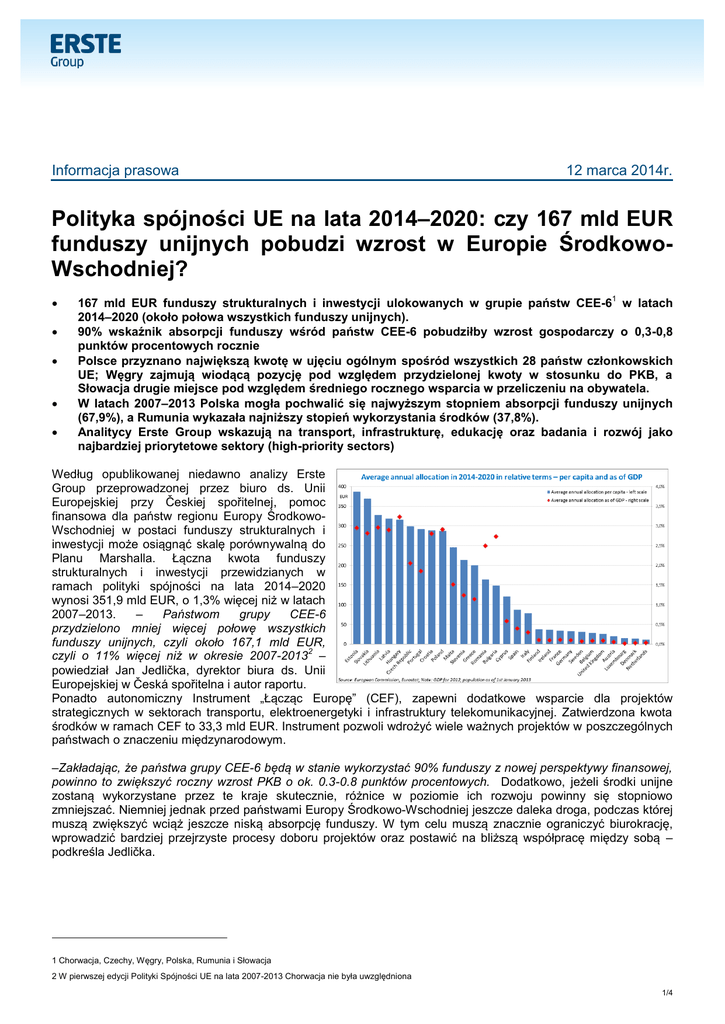 Informacja prasowa 12 marca 2014r. Polityka spójności UE na lata 2014–2020: czy 167 mld EUR funduszy unijnych pobudzi wzrost w Europie ŚrodkowoWschodniej? 1 167 mld EUR funduszy strukturalnych i inwestycji ulokowanych w grupie państw CEE-6 w latach 2014–2020 (około połowa wszystkich funduszy unijnych). 90% wskaźnik absorpcji funduszy wśród państw CEE-6 pobudziłby wzrost gospodarczy o 0,3-0,8 punktów procentowych rocznie Polsce przyznano największą kwotę w ujęciu ogólnym spośród wszystkich 28 państw członkowskich UE; Węgry zajmują wiodącą pozycję pod względem przydzielonej kwoty w stosunku do PKB, a Słowacja drugie miejsce pod względem średniego rocznego wsparcia w przeliczeniu na obywatela. W latach 2007–2013 Polska mogła pochwalić się najwyższym stopniem absorpcji funduszy unijnych (67,9%), a Rumunia wykazała najniższy stopień wykorzystania środków (37,8%). Analitycy Erste Group wskazują na transport, infrastrukturę, edukację oraz badania i rozwój jako najbardziej priorytetowe sektory (high-priority sectors) Według opublikowanej niedawno analizy Erste Group przeprowadzonej przez biuro ds. Unii Europejskiej przy Českiej spořitelnej, pomoc finansowa dla państw regionu Europy ŚrodkowoWschodniej w postaci funduszy strukturalnych i inwestycji może osiągnąć skalę porównywalną do Planu Marshalla. Łączna kwota funduszy strukturalnych i inwestycji przewidzianych w ramach polityki spójności na lata 2014–2020 wynosi 351,9 mld EUR, o 1,3% więcej niż w latach 2007–2013. – Państwom grupy CEE-6 przydzielono mniej więcej połowę wszystkich funduszy unijnych, czyli około 167,1 mld EUR, 2 czyli o 11% więcej niż w okresie 2007-2013 – powiedział Jan Jedlička, dyrektor biura ds. Unii Europejskiej w Česká spořitelna i autor raportu. Ponadto autonomiczny Instrument „Łącząc Europę” (CEF), zapewni dodatkowe wsparcie dla projektów strategicznych w sektorach transportu, elektroenergetyki i infrastruktury telekomunikacyjnej. Zatwierdzona kwota środków w ramach CEF to 33,3 mld EUR. Instrument pozwoli wdrożyć wiele ważnych projektów w poszczególnych państwach o znaczeniu międzynarodowym. –Zakładając, że państwa grupy CEE-6 będą w stanie wykorzystać 90% funduszy z nowej perspektywy finansowej, powinno to zwiększyć roczny wzrost PKB o ok. 0.3-0.8 punktów procentowych. Dodatkowo, jeżeli środki unijne zostaną wykorzystane przez te kraje skutecznie, różnice w poziomie ich rozwoju powinny się stopniowo zmniejszać. Niemniej jednak przed państwami Europy Środkowo-Wschodniej jeszcze daleka droga, podczas której muszą zwiększyć wciąż jeszcze niską absorpcję funduszy. W tym celu muszą znacznie ograniczyć biurokrację, wprowadzić bardziej przejrzyste procesy doboru projektów oraz postawić na bliższą współpracę między sobą – podkreśla Jedlička. 1 Chorwacja, Czechy, Węgry, Polska, Rumunia i Słowacja 2 W pierwszej edycji Polityki Spójności UE na lata 2007-2013 Chorwacja nie była uwzględniona 1/4 Polska z tarczą wychodzi z trudnych negocjacji o miliardy euro środków unijnych. Największa gospodarka Europy Środkowo-Wschodniej otrzyma 77,6 mld EUR, co stanowi około połowę wszystkich funduszy dla państw CEE-6, a zarazem najwięcej spośród wszystkich państw członkowskich UE. Ponadto Polska jest jednym z niewielu państw, które otrzymają więcej w ramach europejskiej polityki spójności w porównaniu z latami 2007– 2013. Pod względem rocznej kwoty na obywatela, która jest wskaźnikiem bardziej miarodajnym, grupie przewodzi Estonia z około 387 EUR na obywatela rocznie, a tuż za nią plasuje się Słowacja z 369 EUR. Pod względem stosunku średniorocznego wsparcia do PKB największa kwota środków unijnych trafi na Węgry (rocznie 3,2% PKB), które pod tym względem wyprzedzają kraje bałtyckie (2,9%-3,0% PKB). Złota zasada: im wyższy rozwój, tym mniej funduszy W ujęciu ogólnym, im państwo jest bardziej rozwinięte pod względem gospodarczym, tym mniej pieniędzy z unijnych funduszy strukturalnych i inwestycji otrzyma. Rumunia i Bułgaria, będące najsłabiej rozwiniętymi państwami UE, otrzymają mniej środków niż teoretycznie powinny. Z tego względu oba państwa otrzymają również wsparcie finansowe z innych programów europejskich, np. w ramach wspólnej polityki rolnej. Dzięki połączeniu polityk, dotacje dla tych państw powinny być wystarczające. Duży potencjał zwiększenia stopnia absorpcji – nadmierna biurokracja poważną przeszkodą W grupie państw CEE-6 tylko Polsce udało się wykorzystać dwie trzecie (67,9%) środków unijnych w latach 2007– 3 2013, według danych na koniec 2013 roku. . Środki unijne najskuteczniej wydają państwa bałtyckie. Węgry (59,3%), Słowacja (52,6%), a także Czechy (51,1%) udało się wykorzystać ponad połowę przydzielonych środków. W tyle pozostaje Rumunia, w przypadku której absorpcja wyniosła 37,8%. Jest to jednak stosunkowo nowe państwo członkowskie, które do Unii Europejskiej wstąpiło dopiero w 2007 roku. – Niezadowalająca absorpcja środków w Rumunii może wynikać z braku doświadczenia i niskiej skuteczności administracji publicznej. Rumunia będzie miała jeszcze okazję popracować nad skutecznością absorpcji dzięki regule N+3, w myśl której państwa otrzymują dodatkowe trzy lata na wydanie pieniędzy przydzielonych w poprzednim okresie – dodaje Jedlička. Komisja Europejska powinna regularnie ujawniać postępy w absorpcji środków Aby zachęcić państwa regionu do jak najskuteczniejszego wykorzystania środków unijnych w latach 2014–2020, Komisja Europejska powinna przyjąć bardziej „rozliczeniowe” podejście. Mimo że Komisja zbiera wszelkie niezbędne informacje o stopniu absorpcji w poszczególnych państwach członkowskich, nie publikuje ich regularnie. Biuro ds. Unii Europejskiej Erste Group uważa, że regularne i częste publikacje mogłyby z