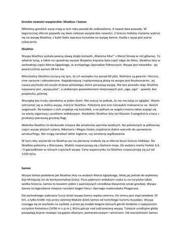 Greckie nowości wyspiarskie: Skiathos i Samos Miłośnicy greckich wysp mają w tym roku powód do zadowolenia. A nawet dwa powody. W tegorocznej ofercie pojawiły się dwie ciekawe wyspiarskie nowości. Z Grecos Holiday możemy wybrać się na wyspę Skiathos, z kolei Itaka zaprasza turystów na wyspę Samos. Każda z wysp jest warta zobaczenia. Skiathos Wyspa Skiathos zyskała pewną sławę dzięki komedii „Mamma Mia!” z Meryl Streep w roli głównej. To właśnie tutaj, a także na sąsiedniej wyspie Skopelos kręcona była część zdjęć do filmu. Skiathos leży w zachodniej części Morza Egejskiego, w archipelagu Sporadów Północnych. Wyspa jest niewielka - jej powierzchnia wynosi 48 km kw. Mieszkańcy Skiathos szczycą się tym, że ich wysepka ma ponad 60 plaż. Niektóre są gwarne i tłoczne, inne zaciszne i odosobnione. Najpiękniejszą i najsłynniejszą plażą na wyspie jest Koukounaries. Jej nazwa pochodzi od szyszki drzewa piniowego, które porastają wyspę. Nie bez powodu więc Skiathos nazywana jest „wyspą plaż”, a ulubionym powiedzeniem miejscowych jest „siga, siga” - powoli, bez pośpiechu, później. Wysepkę bez trudu zwiedzimy w jeden dzień. Nie znaczy to jednak, że nie ma tutaj co oglądać. Warto zatrzymać się w stolicy wyspy, mieście Skiathos. Położone jest ono niezwykle malowniczo na dwóch wzgórzach. Na każdym z nich znajduje się kościółek, a na jednym ze wzgórz można także wspiąć się na wieżę zegarową z punktem widokowym. Niedaleko Skiathos leży też Klasztor Evangelistria znany z produkcji pierwszej greckiej flagi. Maleńka Skiathos to doskonałe miejsce dla amatorów sportów wodnych. Na położonych w północnej części wyspy plażach Lalaria, Nikotsara i Megas Gialos znajdziecie dobre warunki do uprawiania windsurfingu. Nie mogą narzekać także żeglarze, czy amatorzy wędkowania. W tym roku wycieczki na Skiathos po raz pierwszy znalazły się w ofercie biura Grecos Holidays. Na Skiathos polecimy z Warszawy. Wyloty rozpoczynają się z końcem maja. Do wyboru mamy hotele 3,4, i 5-gwiazdkowe w różnych częściach wyspy. Ceny wypoczynku na Skiathos rozpoczynają się już od 1220 zł/os. Samos Wyspa Samos podobnie jak Skiathos leży na wodach Morza Egejskiego, bliżej jej jednak do wybrzeży Azji Mniejszej niż do kontynentalnej Grecji. Poza pięknymi widokami czeka tu na turystów także wielka historia. Samos to bowiem jeden z ważniejszych ośrodków klasycznej sztuki greckiej. Wyspa Samos to legendarne miejsce narodzin bogini Hery i słynnego matematyka Pitagorasa. Od zachodniego wybrzeża Turcji dzieli wyspę Samos wąska cieśnina. Do Izmiru jest stąd zaledwie 70 km, a tylko krótki rejs przez cieśninę Mykale dzieli Samos od tureckiego kurortu Kusadasi. Wyspa rozciąga się ze wschodu na zachód, a przez jej środek biegnie łańcuch górski Ambelos z najwyższym szczytem Kerketeus (1436 m n.p.m.), który góruje nad zadrzewioną wyspą. Tutejsze urodzajne gleby pozwalają bujnie rozwijać się gajom oliwnym, pomarańczowym i winnicom. Od starożytności Samos słynęła z doskonałego drewna konstrukcyjnego, z którego zbudowana jest większość tutejszych domów oraz obfitości gliny, z której wytwarzano znaną czerwoną dachówkę. Wiele na Samos malowniczych zakątków ze stolicą wyspy Samos Town (Vathi) na czele. Miasto leży we wschodniej części wyspy. Znajduje się tutaj Muzeum Archeologiczne z ciekawymi zbiorami. Żeby zasmakować klimatu wyspy warto wybrać się do dzielnicy Ano Vathi, w której podziwiać możemy tradycyjne domy i urokliwe kościółki. Mnóstwo rybackich wiosek na wyspie dzisiaj zmieniło się w modne kurorty. Choć przybyło w nich hoteli i pojawiła infrastruktura mająca przyciągnąć turystów, to nie straciły one swojego wyjątkowego klimatu. Samos nie byłoby grecką wyspą, gdyby nie słynęło z przepysznych lokalnych potraw. Dlatego wypoczywając na wyspie koniecznie trzeba skosztować lokalnych produktów m.in. słodkiego wina Moschato Aspro, aromatycznych miodów, tradycyjnie wyrabianych serów i słodkich, pełnych słońca pomarańczy. Samos to nowość w ofercie Itaki. Dostępne są wyloty z Warszawy i Katowic. Standard hoteli i warianty wyżywienia zróżnicowane, a ceny rozpoczynają się od nieco ponad 1700 zł/os.