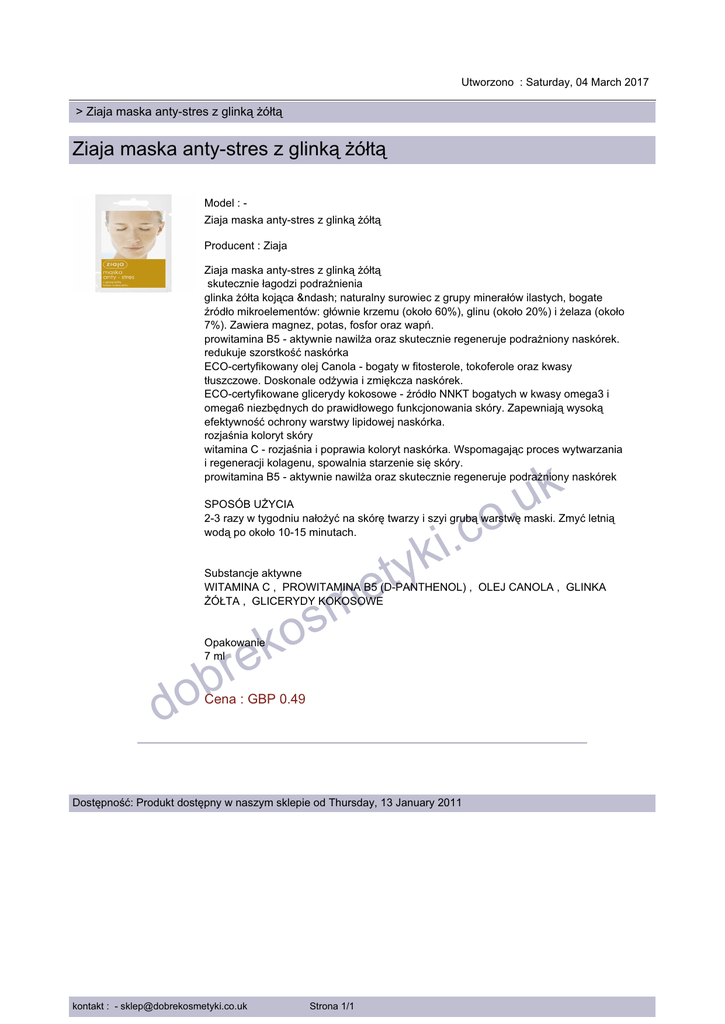 Utworzono : Saturday, 04 March 2017 > Ziaja maska anty-stres z glinką żółtą Ziaja maska anty-stres z glinką żółtą Model : Ziaja maska anty-stres z glinką żółtą Producent : Ziaja Ziaja maska anty-stres z glinką żółtą skutecznie łagodzi podrażnienia glinka żółta kojąca – naturalny surowiec z grupy minerałów ilastych, bogate źródło mikroelementów: głównie krzemu (około 60%), glinu (około 20%) i żelaza (około 7%). Zawiera magnez, potas, fosfor oraz wapń. prowitamina B5 - aktywnie nawilża oraz skutecznie regeneruje podrażniony naskórek. redukuje szorstkość naskórka ECO-certyfikowany olej Canola - bogaty w fitosterole, tokoferole oraz kwasy tłuszczowe. Doskonale odżywia i zmiękcza naskórek. ECO-certyfikowane glicerydy kokosowe - źródło NNKT bogatych w kwasy omega3 i omega6 niezbędnych do prawidłowego funkcjonowania skóry. Zapewniają wysoką efektywność ochrony warstwy lipidowej naskórka. rozjaśnia koloryt skóry witamina C - rozjaśnia i poprawia koloryt naskórka. Wspomagając proces wytwarzania i regeneracji kolagenu, spowalnia starzenie się skóry. prowitamina B5 - aktywnie nawilża oraz skutecznie regeneruje podrażniony naskórek k u . o c . i k SPOSÓB UŻYCIA 2-3 razy w tygodniu nałożyć na skórę twarzy i szyi grubą warstwę maski. Zmyć letnią wodą po około 10-15 minutach. y t e Substancje aktywne WITAMINA C , PROWITAMINA B5 (D-PANTHENOL) , OLEJ CANOLA , GLINKA ŻÓŁTA , GLICERYDY KOKOSOWE m s o k e br Opakowanie 7 ml do Cena : GBP 0.49 Dostępność: Produkt dostępny w naszym sklepie od Thursday, 13 January 2011 kontakt : - [email protected] Strona 1/1