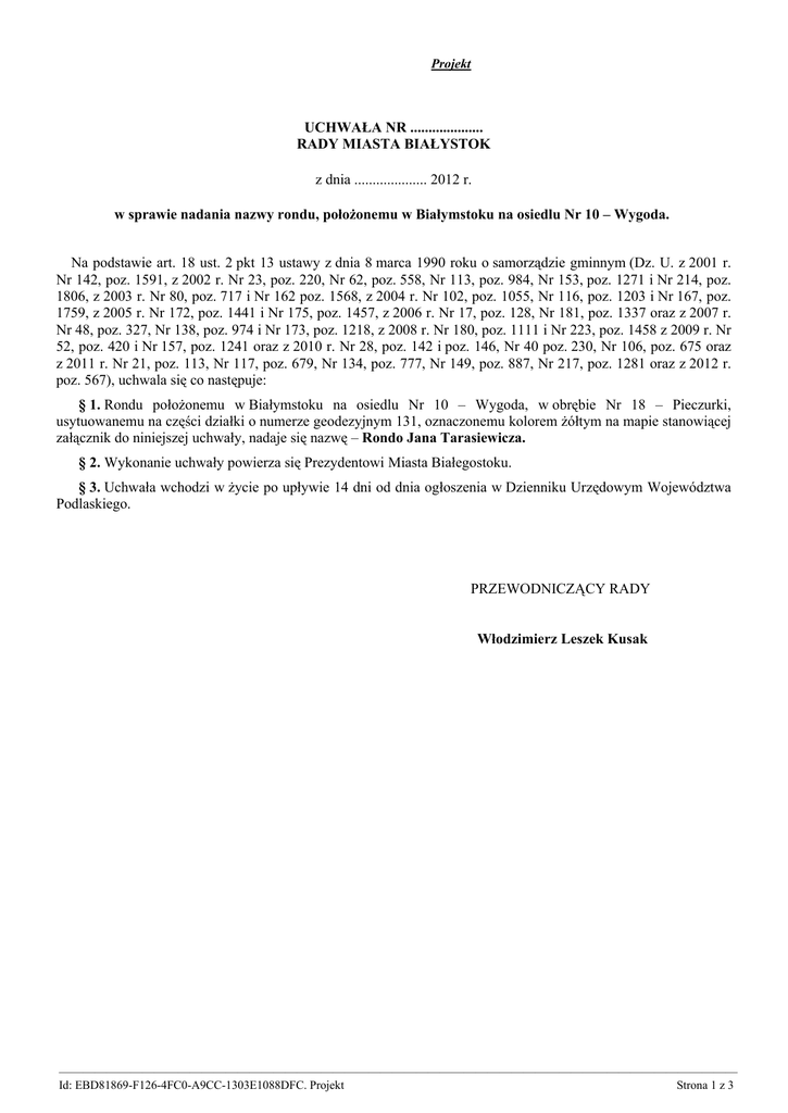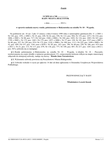 Projekt UCHWAŁA NR .................... RADY MIASTA BIAŁYSTOK z dnia .................... 2012 r. w sprawie nadania nazwy rondu, położonemu w Białymstoku na osiedlu Nr 10 – Wygoda. Na podstawie art. 18 ust. 2 pkt 13 ustawy z dnia 8 marca 1990 roku o samorządzie gminnym (Dz. U. z 2001 r. Nr 142, poz. 1591, z 2002 r. Nr 23, poz. 220, Nr 62, poz. 558, Nr 113, poz. 984, Nr 153, poz. 1271 i Nr 214, poz. 1806, z 2003 r. Nr 80, poz. 717 i Nr 162 poz. 1568, z 2004 r. Nr 102, poz. 1055, Nr 116, poz. 1203 i Nr 167, poz. 1759, z 2005 r. Nr 172, poz. 1441 i Nr 175, poz. 1457, z 2006 r. Nr 17, poz. 128, Nr 181, poz. 1337 oraz z 2007 r. Nr 48, poz. 327, Nr 138, poz. 974 i Nr 173, poz. 1218, z 2008 r. Nr 180, poz. 1111 i Nr 223, poz. 1458 z 2009 r. Nr 52, poz. 420 i Nr 157, poz. 1241 oraz z 2010 r. Nr 28, poz. 142 i poz. 146, Nr 40 poz. 230, Nr 106, poz. 675 oraz z 2011 r. Nr 21, poz. 113, Nr 117, poz. 679, Nr 134, poz. 777, Nr 149, poz. 887, Nr 217, poz. 1281 oraz z 2012 r. poz. 567), uchwala się co następuje: § 1. Rondu położonemu w Białymstoku na osiedlu Nr 10 – Wygoda, w obrębie Nr 18 – Pieczurki, usytuowanemu na części działki o numerze geodezyjnym 131, oznaczonemu kolorem żółtym na mapie stanowiącej załącznik do niniejszej uchwały, nadaje się nazwę – Rondo Jana Tarasiewicza. § 2. Wykonanie uchwały powierza się Prezydentowi Miasta Białegostoku. § 3. Uchwała wchodzi w życie po upływie 14 dni od dnia ogłoszenia w Dzienniku Urzędowym Województwa Podlaskiego. PRZEWODNICZĄCY RADY Włodzimierz Leszek Kusak ————————————————————————————————————————————————————————— Id: EBD81869-F126-4FC0-A9CC-1303E1088DFC. Projekt Strona 1 z 3 Załącznik do Uchwały Nr .................... Rady Miasta Białystok z dnia....................2012 r. ————————————————————————————————————————————————————————— Id: EBD81869-F126-4FC0-A9CC-1303E1088DFC. Projekt Strona 2 z 3 Uzasadnienie Jan Tarasiewicz (1893 – 1961) kompozytor, pianista, pedagog. Był twórcą stu kilkudziesięciu utworów: koncertów fortepianowych, kompozycji fortepianowo - instrumentalnych, wokalnych i utworów chóralnych. Romantyk i ekspresjonista wyrażał przestrzeń kultury Wielkiego Księstwa Litewskiego łącząc klasykę i regionalizm. Mimo, że los kompozytora był tragiczny, jego muzyka wyraża radość życia, promieniuje światłem, jest harmoniczna w treści i formie. W sprzyjającym mu czasie miałby szansę na błyskotliwą karierę oraz sławę. Jego uczniowie porównywali go z Chopinem, Rachmaninowem. Sam Tarasiewicz podkreślał, że źródłem jego natchnienia była pieśń białoruska i klasyka światowa. Urodził się 23 września 1893 w Sokółce w rodzinie Marii i Aleksego Tarasiewiczów. Ojciec był podpułkownikiem armii carskiej, a matka wywodziła się ze starego szlacheckiego rodu Koszelów, o którym wspomina Henryk Sienkiewicz w „ Ogniem i Mieczem”. W 1900 roku zostaje osierocony i wraz z trójką rodzeństwa adoptowany przez Leokadię i Nikifora Ułozowskich z majątku Szyndziel koło Sokółki. Od wczesnych lat uczy się gry na pianinie, próbuje komponować i już w wieku 9-10 lat koncertuje charytatywnie grając z pamięci Chopina i Liszta. W latach 1908 – 1915 studiuje w Konserwatorium w Petersburgu, będąc uczniem wybitnych profesorów M. Abramczewa, M. Bystrowa oraz J. Vitosa, w przyszłości twórcy łotewskiej muzyki narodowej. Po śmierci przybranych rodziców zostaje jedynym spadkobiercą majątku Szyndziel, do którego powraca w 1919 roku. W roku 1920 zgadza się przyjąć etat dziekana katedry na Uniwersytecie Mińskim, którego powstanie z przyczyn politycznych nie dochodzi do skutku, a władza radziecka programowo niszczy najwybitniejszych przedstawicieli nauki i kultury. Tarasiewicz ma dużo szczęścia, ponieważ przeżyje jako jeden z nielicznych z grona znakomitości i to dlatego, że jest obywatelem Polski i mieszka w majątku Szyndziel. Osoby które miały z nim styczność wspominają go jako wspaniałego człowieka - bardzo życzliwego i uczynnego. W tym czasie komponuje oraz uczy gry na pianinie w Grodnie, Sokółce i Białymstoku. Przed wkroczeniem Armii Radzieckiej wyjeżdża do Wilna, a następnie do Rygi, gdzie utrzymuje się z malowania portretów przechodniom. W roku 1941 wraca w rodzinne strony. Po wojnie majątek Szyndziel ulega parcelacji. Tarasiewicz przenosi się do Sokółki a następnie po otrzymaniu nakazu jej opuszczenia zamieszkuje w Białymstoku. Pochodzenie nie pozostaje bez wpływu na jego sytuację. Żyje w więcej niż skromnych warunkach, do których nie przywiązuje wagi, gdyż to muzyka jest jego życiem. Podejmuje pracę nauczyciela muzyki w Niższej i Średniej Szkole Muzycznej Heleny Frankiewicz w Białymstoku. Swym uczniom poświęca bez ograniczeń czas dosłownie o każdej porze. Tu po raz pierwszy styka się z nim przyszły światowej sławy dyrygent Jerzy Maksymiuk, który o Tarasiewiczu powiedział - „On spowodował, że jestem tym kim jestem. Jerzy Maksymiuk, którego znacie – to jego zasługa!”. Jego utwory to między innymi „Suita a 1”, „Preludia Toccata”, „Kujawiak na skrzypce, wiolonczele i fortepian”, „Tarantella”, „Serenada”, „Nokturn”, „Mroczny walc” czy też pieśni „Ziemia rodzinna”, „Kołysanka”, „Mazurek”.Umiera w Białymstoku 18 czerwca 1961 roku na atak serca. ————————————————————————————————————————————————————————— Id: EBD81869-F126-4FC0-A9CC-1303E1088DFC. Projekt Strona 3 z 3