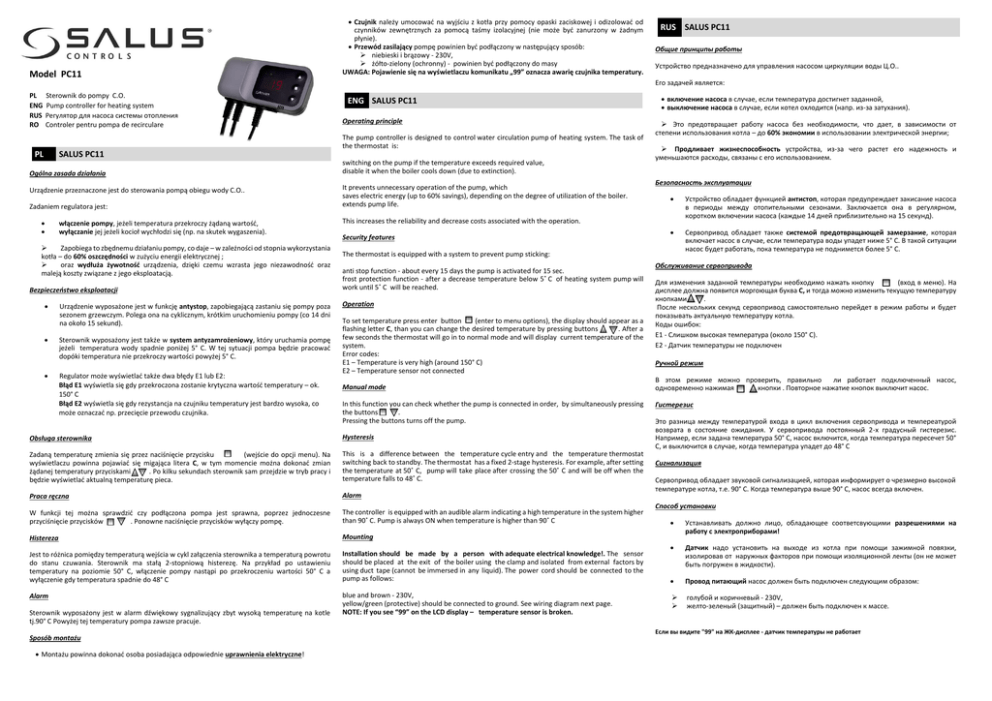 Model PC11 PL ENG RUS RO Sterownik do pompy C.O. Pump controller for heating system Регулятор для насоса системы отопления Controler pentru pompa de recirculare PL SALUS PC11 Ogólna zasada działania Urządzenie przeznaczone jest do sterowania pompą obiegu wody C.O.. Zadaniem regulatora jest: włączenie pompy, jeżeli temperatura przekroczy żądaną wartość, wyłączanie jej jeżeli kocioł wychłodzi się (np. na skutek wygaszenia). Zapobiega to zbędnemu działaniu pompy, co daje – w zależności od stopnia wykorzystania kotła – do 60% oszczędności w zużyciu energii elektrycznej ; oraz wydłuża żywotność urządzenia, dzięki czemu wzrasta jego niezawodność oraz maleją koszty związane z jego eksploatacją. Bezpieczeństwo eksploatacji Urządzenie wyposażone jest w funkcję antystop, zapobiegającą zastaniu się pompy poza sezonem grzewczym. Polega ona na cyklicznym, krótkim uruchomieniu pompy (co 14 dni na około 15 sekund). Sterownik wyposażony jest także w system antyzamrożeniowy, który uruchamia pompę jeżeli temperatura wody spadnie poniżej 5° C. W tej sytuacji pompa będzie pracować dopóki temperatura nie przekroczy wartości powyżej 5° C. Regulator może wyświetlać także dwa błędy E1 lub E2: Błąd E1 wyświetla się gdy przekroczona zostanie krytyczna wartość temperatury – ok. 150° C Błąd E2 wyświetla się gdy rezystancja na czujniku temperatury jest bardzo wysoka, co może oznaczać np. przecięcie przewodu czujnika. Czujnik należy umocować na wyjściu z kotła przy pomocy opaski zaciskowej i odizolować od czynników zewnętrznych za pomocą taśmy izolacyjnej (nie może być zanurzony w żadnym płynie). Przewód zasilający pompę powinien być podłączony w następujący sposób: niebieski i brązowy - 230V, żółto-zielony (ochronny) - powinien być podłączony do masy UWAGA: Pojawienie się na wyświetlaczu komunikatu „99” oznacza awarię czujnika temperatury. ENG SALUS PC11 Operating principle The pump controller is designed to control water circulation pump of heating system. The task of the thermostat is: switching on the pump if the temperature exceeds required value, disable it when the boiler cools down (due to extinction). It prevents unnecessary operation of the pump, which saves electric energy (up to 60% savings), depending on the degree of utilization of the boiler. extends pump life. Security features включение насоса в случае, если температура достигнет заданной, выключение насоса в случае, если котел охлодится (напр. из-за затухания). Это предотвращает работу насоса без необходимости, что дает, в зависимости от степени использования котла – до 60% экономии в использовании электрической энергии; Продливает жизнеспособность устройства, из-за чего растет его надежность и уменьшаются расходы, связаны с его использованием. Безопасность эксплуатации Устройство обладает функцией антистоп, которая предупреждает закисание насоса в периоды между отопительными сезонами. Заключается она в регулярном, коротком включении насоса (каждые 14 дней приблизительно на 15 секунд). Сервопривод обладает также системой предотвращающей замерзание, которая включает насос в случае, если температура воды упадет ниже 5° C. В такой ситуации насос будет работать, пока температура не поднимется более 5° C. The thermostat is equipped with a system to prevent pump sticking: anti stop function - about every 15 days the pump is activated for 15 sec. frost protection function - after a decrease temperature below 5˚ C of heating system pump will work until 5˚ C will be reached. Operation To set temperature press enter button (enter to menu options), the display should appear as a flashing letter C, than you can change the desired temperature by pressing buttons . After a few seconds the thermostat will go in to normal mode and will display current temperature of the system. Error codes: E1 – Temperature is very high (around 150° C) E2 – Temperature sensor not connected Manual mode In this function you can check whether the pump is connected in order, by simultaneously pressing the buttons . Pressing the buttons turns off the pump. Zadaną temperaturę zmienia się przez naciśnięcie przycisku (wejście do opcji menu). Na wyświetlaczu powinna pojawiać się migająca litera C, w tym momencie można dokonać zmian żądanej temperatury przyciskami . Po kilku sekundach sterownik sam przejdzie w tryb pracy i będzie wyświetlać aktualną temperaturę pieca. This is a difference between the temperature cycle entry and the temperature thermostat switching back to standby. The thermostat has a fixed 2-stage hysteresis. For example, after setting the temperature at 50˚ C, pump will take place after crossing the 50˚ C and will be off when the temperature falls to 48˚ C. Praca ręczna Alarm W funkcji tej można sprawdzić czy podłączona pompa jest sprawna, poprzez jednoczesne przyciśnięcie przycisków . Ponowne naciśnięcie przycisków wyłączy pompę. The controller is equipped with an audible alarm indicating a high temperature in the system higher than 90˚ C. Pump is always ON when temperature is higher than 90˚ C Histereza Mounting Jest to różnica pomiędzy temper