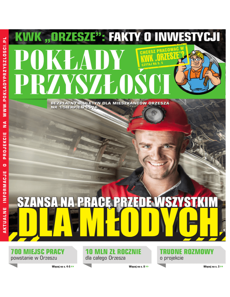 POKŁADY PRZYSZŁOŚCI RA CHCESZ P COWAĆ W ”? E Z S E K WK „ ORZ CZYTAJ NA S. 5 BEZPŁATNY BIULETYN DLA MIESZKAŃCÓW ORZESZA NR 1/SIERPIEŃ 2016 SZANSA NA PRACĘ PRZEDE WSZYSTKIM DLA MŁODYCH 700 MIEJSC PRACY powstanie w Orzeszu Więcej na s. 4-5 10 MLN ZŁ ROCZNIE dla całego Orzesza Więcej na s. 8 FOTOLIA AKTUALNE INFORMACJE O P R O J E KC I E NA W W W. P O K L A D Y P R Z Y S Z L O S C I . P L KWK „ORZESZE”: FAKTY O INWESTYCJI TRUDNE ROZMOWY o projekcie Więcej na s. 3 ROZMOWA z Jerzym Markowskim, // Złoże pozostaje własnością Państwa // Inwestor wyda 150 mln euro // Będzie 700 stałych miejsc pracy prezesem Silesian Coal SA Redakcja: Niedawno odbyło się spotkanie z samorządowcami Orzesza, na które przyszło wielu mieszkańców. Jak Pan je ocenia? Podstawowy problem protestujących to chyba niepełna wiedza na temat istoty projektu górniczego „Orzesze”? - Zgadza się, bo kopalnia w rozumieniu tradycyjnych obiektów na powierzchni w Orzeszu nigdy nie powstanie. Projekt polega na tym, żeby bez budowy nowej infrastruktury na powierzchni, wyłącznie za pomocą wyrobisk podziemnych łączących ten obszar z czynnymi kopalniami, eksploatować zasoby węgla, które znajdują się na obszarze Orzesza. Nie jest to więc klasyczna budowa kopalni, jaką pamiętam z „Budryka”, gdzie byłem dyrektorem kopalni, ale model znany z budowy kopalni „Szczygłowice”, w której byłem sztygarem, gdzie zasoby udostępniano z KWK „Knurów”. Trwa procedura dotycząca wydania środowiskowych uwarunkowań inwestycji. W jej ramach do Regionalnej Dyrekcji Ochrony Środowiska (RDOŚ) wpłynęło kilkaset opinii wyrażających w znakomitej części powtarzające się obawy. Jak się Pan do nich odniesie? - Tak jak stanowi prawo, czyli na piśmie. Bardzo dużo jest opinii merytorycznych, ale ubolewam, że ci, którzy przygotowywali te pisma i rozdawali je mieszkańcom do podpisu, wprowadzają ludzi w błąd. Na przykład prawie 30 procent pism domaga się prowadzenia wydobycia systemem podsadzkowym. Tymczasem przy wydobyciu 10-15 tys. ton węgla na dobę wymagałby on dostarczenia do kopalni ok. 10-15 tys. ton piasku na dobę. Ten piasek jakoś pod ziemię trzeba opuścić, więc trzeba byłoby wybudować szyb, przeciwko któremu przecież mieszkańcy protestują. Do tego doszłaby cała infrastruktura wyładowcza, tory kolejowe itp. To potężna infrastruktura, która bardzo zmieniłaby sytuację na powierzchni. Jedyną możliwością realizacji tego postulatu byłoby wydobywanie piasku na miejscu, w Orzeszu. Czyli trzeba byłoby zbudować kolejną kopalnię piasku, notabene na terenie parku krajobrazowego w Orzeszu. Kolejna grupa pytań dotyczy stabilności inwestora. Ludzie pytają: a co się stanie, jeśli inwestor po 2-3 latach porzuci inwestycję? Z perspektywy inwestora takie zachowanie byłoby zupełnie nieracjonalne. Wyda 150 mln euro i nie będzie chciał ich odzyskać? Na przykład fabrykę samochodów można zdemontować i wywieźć, ale z kopalnią tak się zrobić nie da. Wyrobisk podziemnych i chodników się nie wywiezie. Przecież zwrot nakładów nastąpi dopiero po 10-15 latach eksploatacji, więc jak można zwinąć interes wcześniej? Zresztą inwestor nie kupuje złoża ani zasobów, one pozostają własnością Państwa. Wśród tych listów do RDOŚ szczególnie należy zwrócić uwagę na takie, które straszą zagrożeniem zniszczenia złoża soli. Przecież takie złoże występuje 2 wydobycie BEZPIECZNE dla powierzchni Na przykład fabrykę samochodów można zdemontować i wywieźć, ale z kopalnią tak się zrobić nie da. Wyrobisk podziemnych i chodników się nie wywiezie. Inwestor nie kupuje złoża ani zasobów, one pozostają własnością Państwa. mówi Jerzy Markowski nad eksploatowanymi złożami czynnych kopalń, które w ogóle na nie nie oddziałują, a mają być zagrożone przez oddaloną od siebie o 3 km KWK „Orzesze”? Zresztą przesunęliśmy granicę obszaru koncesyjnego kopalni od złoża soli o ok. 3 km, zmniejszając nowy obszar z 32 do 17 km kw. A już zupełnie kuriozalnych jest kilkadziesiąt listów, których autorów – z całym szacunkiem – nie podejrzewam o znajomość teorii osiadań prof. Budryka i Knothego oraz zasad mechaniki górotworu. Ktoś im podsunął takie pytania i kompromituje ludzi, którzy się pod tym podpisali. Ze względu na szczególny stopień skomplikowania sprawy dyrektor RDOŚ wydłużył okres procedowania nad raportem do 30 września br. Na czym polega ten paradoks, że na Śląsku, który przez lata związany był z węglem, są teraz takie problemy z budową nowych kopalń? JOANNA NOWICKA Jerzy Markowski: - Wobec mnożących się pytań na temat projektu zależało mi, aby nareszcie doprowadzić do spotkania z ludźmi, którzy reprezentują samorząd. Bowiem wszystkie wcześniejsze rozmowy odbywały się bez mojego udziału. Nikt mnie na nie nie zapraszał, mimo że mówiono o mnie i o naszym projekcie. Dlatego poprosiłem Przewodniczącego Rady Miasta i Burmistrza Orzesza o zorganizowanie takiego spotkania. Jak się okazało, przyszła na nie też znaczna część mieszkańców. Widać chodziło o manifestację, skrupulatnie zresztą przygotowaną. Nie było szans na merytoryczną rozmowę, ale w sumie dobrze, że odbyło się to spotkanie, bo pokazało, jak wiele jest niedomówień, fałszywych informacji i niedorzeczności krążących wokół tego projektu. - Ja już to przeżywałem przy budowie kopalni „Budryk” w latach 1990-95. Też słyszałem, że domy się poprzewracają, pola i lasy będą zatopione, powstanie olbrzymia pustynia. Proszę dziś pojechać do Ornontowic oraz Chudowa i zobaczyć, jak tam wygląda. Przeciwnicy budowy kopalni w Orzeszu kierują się własnymi interesami i używają argumentacji nieprawdziwej. Gdyby tak było, jak piszą, Śląsk już by nie istniał, powinna tu być zalana wodą „Atlantyda”. Opowiadają o potężnych zalewiskach czy lejach 