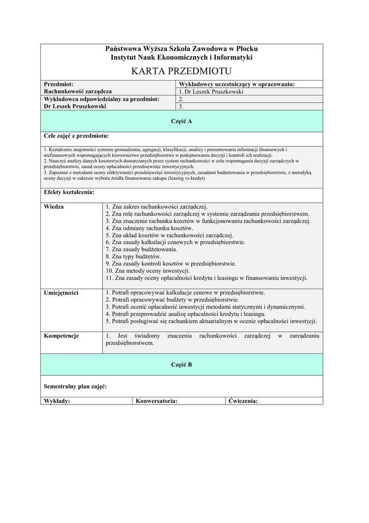 Państwowa Wyższa Szkoła Zawodowa w Płocku Instytut Nauk Ekonomicznych i Informatyki KARTA PRZEDMIOTU Przedmiot: Rachunkowość zarządcza Wykładowca odpowiedzialny za przedmiot: Dr Leszek Pruszkowski Wykładowcy uczestniczący w opracowaniu: 1. Dr Leszek Pruszkowski 2. 3. Część A Cele zajęć z przedmiotu: 1. Kształcenie znajomości systemu gromadzenia, agregacji, klasyfikacji, analizy i prezentowania informacji finansowych i niefinansowych wspomagających kierownictwo przedsiębiorstwa w podejmowaniu decyzji i kontroli ich realizacji. 2. Nauczyć analizy danych kosztowych dostarczanych przez system rachunkowości w celu wspomagania decyzji zarządczych w przedsiębiorstwie, zasad oceny opłacalności przedsięwzięć inwestycyjnych. 3. Zapoznać z metodami oceny efektywności przedsięwzięć inwestycyjnych, zasadami budżetowania w przedsiębiorstwie, z metodyką oceny decyzji w zakresie wyboru źródła finansowania zakupu (leasing vs kredyt) Efekty kształcenia: Wiedza 1. Zna zakres rachunkowości zarządczej. 2. Zna rolę rachunkowości zarządczej w systemie zarządzania przedsiębiorstwem. 3. Zna znaczenie rachunku kosztów w funkcjonowaniu rachunkowości zarządczej. 4. Zna odmiany rachunku kosztów. 5. Zna układ kosztów w rachunkowości zarządczej. 6. Zna zasady kalkulacji cenowych w przedsiębiorstwie. 7. Zna zasady budżetowania. 8. Zna typy budżetów. 9. Zna zasady kontroli kosztów w przedsiębiorstwie. 10. Zna metody oceny inwestycji. 11. Zna zasady oceny opłacalności kredytu i leasingu w finansowaniu inwestycji. Umiejętności 1. Potrafi opracowywać kalkulacje cenowe w przedsiębiorstwie. 2. Potrafi opracowywać budżety w przedsiębiorstwie. 3. Potrafi ocenić opłacalność inwestycji metodami statycznymi i dynamicznymi. 4. Potrafi przeprowadzić analizę opłacalności kredytu i leasingu. 5. Potrafi posługiwać się rachunkiem aktuarialnym w ocenie opłacalności inwestycji. Kompetencje 1. Jest świadomy przedsiębiorstwem. znaczenia rachunkowości zarządczej Część B Semestralny plan zajęć: Wykłady: Konwersatoria: Ćwiczenia: w zarządzaniu W1. Istota i zakres rachunkowości zarządczej W2. Rachunkowość zarządcza jako element systemu zarządzania finansami przedsiębiorstwa W3. Rachunek kosztów jako baza rachunkowości zarządczej W4. Odmiany rachunku kosztów W5. Układ kosztów w rachunkowości zarządczej W6. Kalkulacje cenowe przedsiębiorstwa W7. Kontrola kosztów w działalności przedsiębiorstwa W8. Struktura procesu budżetowania W9. Ocena efektywności inwes tycji W10. Analiza opłacalności leasingu vs kredytu C1. Istota i zakres rachunkowości zarządczej C2. Rachunkowość zarządcza jako element systemu zarządzania finansami przedsiębiorstwa C3. Rachunek kosztów jako baza rachunkowości zarządczej C4. Odmiany rachunku kosztów W5. Układ kosztów w rachunkowości zarządczej C6. Kalkulacje cenowe przedsiębiorstwa C7. Kontrola kosztów w działalności przedsiębiorstwa C8. Struktura procesu budżetowa nia C9. Ocena efektywności inwes tycji C10. Analiza opłacalności leasingu vs kredytu Literatura podstawowa: 1. K . Czubakowska, W Gabrusewicz, E. Nowak, Podstawy rachunkowości zarządczej, PWE, Warszawa 2007 2. W. Gabrusewicz, A. Kamela-Sowińska, Rachunkowość zarządcza, PWE, Warszawa 2000 3. T. Kiziukiewicz (red.), Rachunkowość zarządcza wyd. IV, Ekspert, Warszawa 2003 Literatura uzupełniająca: 1. I. Sobańska (red.), Rachunek kosztów i rachunkowość zarządcza, C.H. Beck, Warszawa 2006 2.A. Karmańska (red.) Rachunkowość zarządcza i rachunek kosztów w systemie informacyjnym przedsiębiorstwa, Difin, Warszawa 2006 3. M. Dobija, Rachunkowość zarządcza i controlling, PWN, Warszawa 2005 Część C Proponowane usytuowanie przedmiotu w planie studiów Rok studiów: III Semestr: VI Język prowadzenia zajęć: polski Status przedmiotu: obowiązkowy Studia: niestacjonarne Specjalność: Finanse i rachunkowość przedsiębiorstw Wymagania wstępne formalne: Bazuje na przedmiotach Rachunkowość Finansowa, Rachunek Kosztów, Ekonomia, Statystyka, Matematyka Część D Wymiar i forma zajęć (w godzinach) Wykład Metody oceny 20 Egzamin ustny Egzamin bazujący na przygotowanych projektach do rozwiązania w domu Ćwiczenia Konwersatorium 20 Egzamin testowy Egzamin ustny Prace kontrolne (kolokwia) Prace domowe, referaty Inne (jakie) Dwa kolokwia sprawdzające Proponowana liczba punktów ECTS za przedmiot: 7 Forma pracy studenta Wykłady Liczba punktów ECTS wynikająca z godzin kontaktowych z nauczycielem akademickim: Wykłady, konwersatoria, ćwiczenia Konsultacje Egzamin + egzamin poprawkowy Razem uzyskanych punktów ECTS w bezpośrednim kontakcie z nauczycielem akademickim Liczba punktów ECTS wynikająca z samodzielnej pracy studenta Przygotowanie się do zajęć w tym zapoznanie z literaturą Przygotowanie do egzaminu Przygotowanie do zaliczenia Przygotowanie do kolokwium Przygotowanie pracy (np. eseju lub prezentacji) Inne (wpisać jakie) Razem punktów ECTS wynikających z samodzielnej pracy studenta Liczba punktów ECTS za przedmiot Procent punktów ECTS uzyskanych w bezpośrednim kontakcie z nauczycielem akademickim Liczba punktów ECTS Ćwiczenia Konwersatoria 1 1 1 1 1 1 1 2 2 3 7 70% Część E Symbol Efekty kształcenia dla kierunku studiów K_W10 WIEDZA ma podstawową wiedzę na temat stosowania i interpretacji zasad rachunkowości, analizy finansowej przedsiębiorstw oraz instytucji finansowych Efekty kształcenia dla przedmiotu Sposób sprawdzani a efektów kształcenia Zna zakres rachunkowości zarządczej. Zna rolę rachunkowości zarządczej w systemie zarządzania przedsiębiorstwem. Zna znaczenie rachunku kosztów w funkcjonowaniu rachunkowości zarządczej. Egzamin ustny, Kolokwia sprawdzają ce Zna odmiany rachunku kosztów. Zna układ kosztów w rachunkowości zarządczej. Zna zasady kalkulacji cenowych w przedsiębiorstwie. Zna zasady budżetowania. Zna typy budżetów. Zna zasady kontroli kos