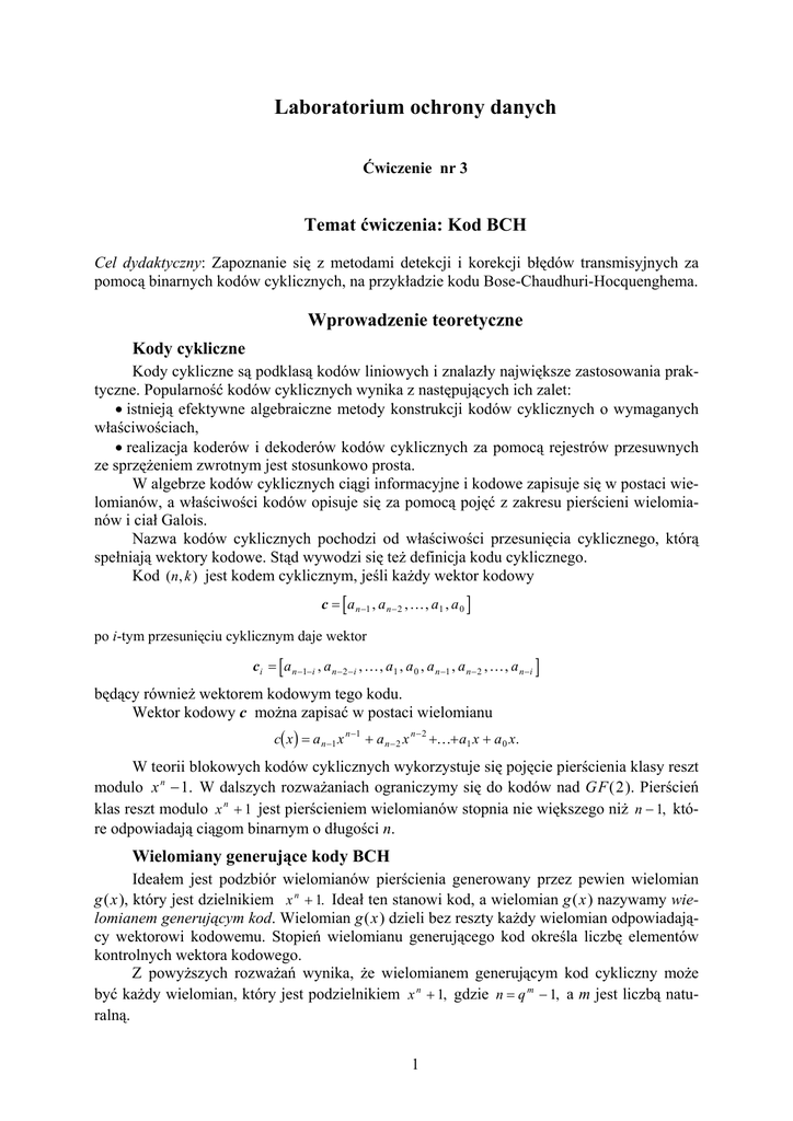 g(x), który jest dzielnikiem x n + 1. Ideał ten stanowi kod, a wielomian g(x) nazywamy wielomianem generującym kod. Wielomian g(x) dzieli bez reszty każdy wielomian odpowiadający wektorowi kodowemu. Stopień wielomianu generującego kod określa liczbę elementów