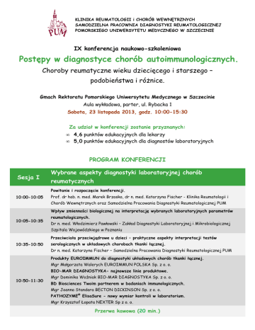 KLINIKA REUMATOLOGII i CHORÓB WEWNĘTRZNYCH SAMODZIELNA PRACOWNIA DIAGNOSTYKI REUMATOLOGICZNEJ POMORSKIEGO UNIWERSYTETU MEDYCZNEGO W SZCZECINIE IX konferencja naukowo-szkoleniowa Postępy w diagnostyce chorób autoimmunologicznych. Choroby reumatyczne wieku dziecięcego i starszego – podobieństwa i różnice. Gmach Rektoratu Pomorskiego Uniwersytetu Medycznego w Szczecinie Aula wykładowa, parter, ul. Rybacka 1 Sobota, 23 listopada 2013, godz. 10:00-15:30 Za udział w konferencji zostanie przyznanych: • • 4,6 punktów edukacyjnych dla lekarzy 5,0 punktów edukacyjnych dla diagnostów laboratoryjnych PROGRAM KONFERENCJI Sesja I Wybrane aspekty diagnostyki laboratoryjnej chorób reumatycznych Powitanie i rozpoczęcie konferencji. 10:00-10:05 Prof. dr hab. n. med. Marek Brzosko, dr n. med. Katarzyna Fischer - Klinika Reumatologii i Chorób Wewnętrznych oraz Samodzielna Pracowania Diagnostyki Reumatologicznej PUM Wpływ zmienności biologicznej na interpretację wybranych laboratoryjnych parametrów 10:05-10:35 reumatologicznych. Dr n. med. Włodzimierz Pawłowski – Zakład Diagnostyki Laboratoryjnej i Mikrobiologicznej Szpitala Wojewódzkiego w Poznaniu Przeciwciała przeciwjądrowe u dzieci – praktyczne aspekty interpretacji testów 10:35-10:50 serologicznych w układowych chorobach tkanki łącznej. Dr n. med. Katarzyna Fischer – Samodzielna Pracowania Diagnostyki Reumatologicznej PUM Produkty EUROIMMUN do diagnostyki układowych chorób tkanki łącznej. Mgr Małgorzata Walerych EUROIMMUN POLSKA Sp. z o. o. BIO-MAR DIAGNOSTYKA- najnowsze linie produktowe. 10:50-11:30 Mgr Dominika Woźniak BIO-MAR DIAGNOSTYKA Sp. z o. o. BD Biosciences Twoim partnerem w badaniach immunologicznych. Mgr Joanna Standara BECTON DICKINSON Sp. z o. o. PATHOZYME® ElisaSure - nowy wymiar kontroli w laboratorium. Mgr Krzysztof Łopata NEXTER Sp z o. o. Przerwa kawowa (20 min.) Sesja II Związek wieku z przebiegiem klinicznym wybranych chorób reumatycznych. Prezentacja przypadku Twardzina wieku rozwojowego. 11:50-12:10 Prof. dr hab. n. med. Lidia Rutkowska-Sak – Klinika i Poliklinika Reumatologii Wieku Rozwojowego Instytutu Reumatologii w Warszawie 12:10-12:30 Twardzina u osób dorosłych – postaci, występowanie i obraz kliniczny. Dr n. med. Beata Trzcińska-Butkiewicz – Klinika Reumatologii i Chorób Wewnętrznych PUM Seronegatywne spondyloartropatie zapalne u dzieci – doświadczenia własne. 12:30-12:50 Dr n. med. Zbigniew Żuber – Wojewódzki Specjalistyczny Szpital Dziecięcy im. św. Ludwika w Krakowie 12:50-13:05 13:05-13:25 13:25-13:45 13:45-13:55 Seronegatywne spondyloartropatie zapalne u dorosłych – patogeneza, obraz kliniczny i leczenie. Dr n. med. Hanna Przepiera-Będzak - Klinika Reumatologii i Chorób Wewnętrznych PUM Toczeń rumieniowaty układowy wieku dziecięcego i młodzieńczego. Dr hab. n. med. Elżbieta Smolewska – Klinika Kardiologii i Reumatologii Dziecięcej Uniwersytetu Medycznego w Łodzi Zróżnicowany obraz kliniczny tocznia rumieniowatego układowego w zależności od wieku – doświadczenia własne. Dr n. med. Lidia Ostanek - Klinika Reumatologii i Chorób Wewnętrznych PUM Choroba Kawasaki - opis przypadku. dr n. med. Paweł Dzieński – Oddział Pediatrii, Gastroenterologii i Reumatologii, Samodzielny Publiczny Zakład Opieki Zdrowotnej „Zdroje”, Szczecin Lunch (30 min.) Sesja III 14:25-14:55 Najnowsze spojrzenie na strategie terapeutyczne wybranych chorób autoimmunologicznych Wybrane aspekty terapii komórkowej. Prof. dr hab. n. med. Bogusław Machaliński – Zakład Patologii Ogólnej PUM Leki biologiczne w terapii reumatoidalnego zapalenia stawów i młodzieńczego idiopatycznego 14:55-15:25 zapalenia stawów – wykład wprowadzający i dyskusja okrągłego stołu. Moderator: Prof. dr hab. n. med. Marek Brzosko – Klinika Reumatologii i Chorób Wewnętrznych PUM Dyskusja i zakończenie konferencji