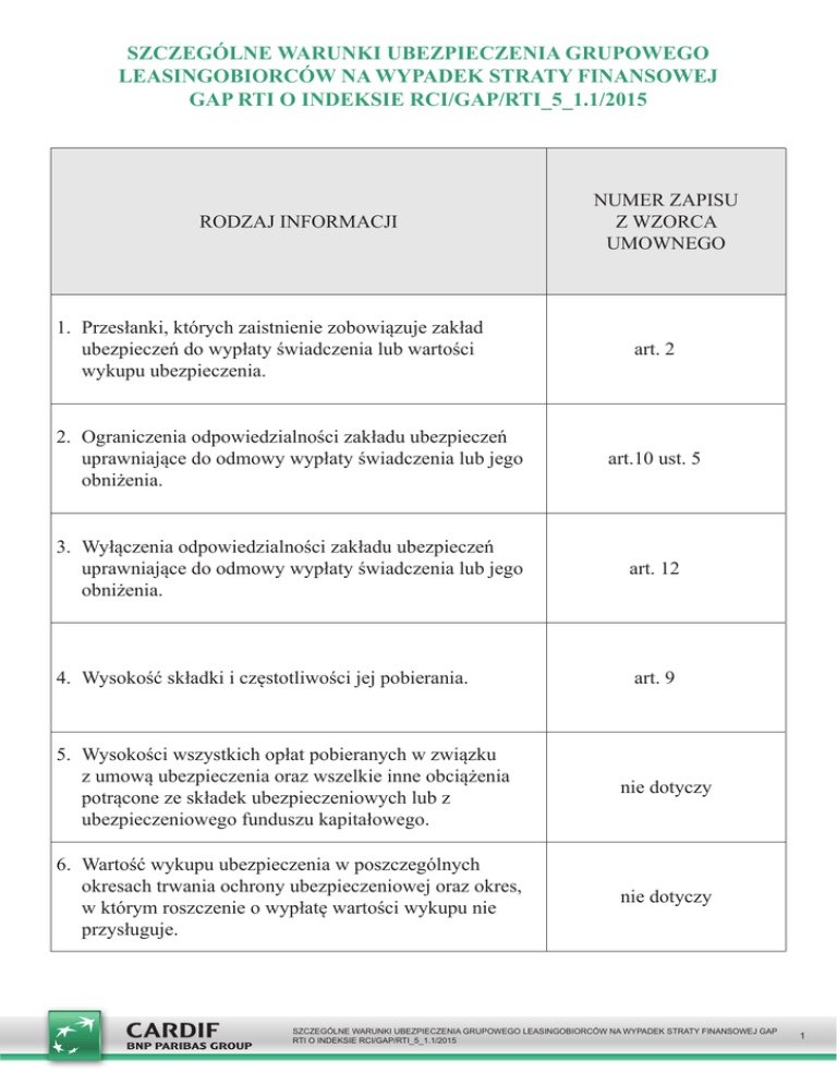SZCZEGÓLNE WARUNKI UBEZPIECZENIA GRUPOWEGO LEASINGOBIORCÓW NA WYPADEK STRATY FINANSOWEJ GAP RTI O INDEKSIE RCI/GAP/RTI_5_1.1/2015 RODZAJ INFORMACJI NUMER ZAPISU Z WZORCA UMOWNEGO 1. Przesłanki, których zaistnienie zobowiązuje zakład ubezpieczeń do wypłaty świadczenia lub wartości wykupu ubezpieczenia. 2. Ograniczenia odpowiedzialności zakładu ubezpieczeń uprawniające do odmowy wypłaty świadczenia lub jego obniżenia. 3. Wyłączenia odpowiedzialności zakładu ubezpieczeń uprawniające do odmowy wypłaty świadczenia lub jego obniżenia. art.12 4. Wysokość składki i częstotliwości jej pobierania. art.9 5. Wysokości wszystkich opłat pobieranych w związku z umową ubezpieczenia oraz wszelkie inne obciążenia potrącone ze składek ubezpieczeniowych lub z ubezpieczeniowego funduszu kapitałowego. nie dotyczy 6. Wartość wykupu ubezpieczenia w poszczególnych okresach trwania ochrony ubezpieczeniowej oraz okres, w którym roszczenie o wypłatę wartości wykupu nie przysługuje. nie dotyczy SZCZEGÓLNE WARUNKI UBEZPIECZENIA GRUPOWEGO LEASINGOBIORCÓW NA WYPADEK STRATY FINANSOWEJ GAP RTI O INDEKSIE RCI/GAP/RTI_5_1.1/2015 1 Niniejsze Szczególne Warunki Ubezpieczenia Grupowego Leasingobiorców na Wypadek Straty Finansowej GAP RTI o indeksie RCI/GAP/RTI_5_1.1/2015, (zwane dalej „SWU”) stanowią integralną część Umowy ubezpieczenia zawartej pomiędzy Cardif Assurances Risques Divers S.A. Oddział w Polsce a Ubezpieczającym. art. 1 a) DEFINICJE Użytym w SWU oraz pozostałych dokumentach dotyczących Umowy ubezpieczenia poniżej podanym terminom nadano następujące znaczenia: 1) Agent ubezpieczeniowy – RCI Banque Spółka Akcyjna z siedzibą w Noisy–Le–Grand (Francja) wpisana do Rejestru Handlowego i Spółek w Bobigny pod numerem RCS B 306 523 358, o kapitale akcyjnym 100.000.000,00 EUR w pełni wpłaconym, działająca poprzez RCI Banque Spółka Akcyjna Oddział w Polsce, ul. Marynarska 13, 02–674 Warszawa, wpisany przez Sąd Rejonowy dla m.st. Warszawy w Warszawie, XIII Wydział Gospodarczy Krajowego Rejestru Sądowego pod numer KRS 0000430770, wpisany do odpowiedniego rejestru pośredników ubezpieczeniowych we Francji; 2) Deklaracja zgody – wyrażone w formie pisemnej, pod rygorem nieważności, oświadczenie woli Leasingobiorcy na mocy którego wyraża on zgodę na objęcie Ochroną ubezpieczeniową; 3) Dzień rozpoczęcia Ochrony ubezpieczeniowej – dzień złożenia Ubezpieczającemu wypełnionej Deklaracji zgody przez Leasingobiorcę, przy czym nie wcześniej niż dzień uruchomienia leasingu; 4) Dzień zajścia Szkody całkowitej – dzień wystąpienia całkowitego zniszczenia lub utraty Pojazdu, w wyniku których w ramach ubezpieczenia AC lub OC sprawcy zostało wypłacone odszkodowanie z tytułu Szkody całkowitej; 5) Gwarantowana suma ubezpieczenia AC – opcja ubezpieczenia autocasco, gwarantująca utrzymanie sumy ubezpieczenia AC w wysokości równej Wartości początkowej Pojazdu z dnia zawarcia umowy ubezpieczenia AC. 6) Kierowca – każda osoba upoważniona przez właściciela pojazdu do użytkowania Pojazdu, uprawniona do kierowania pojazdem na podstawie przepisów prawa obowiązującego w kraju, w którym doszło do zdarzenia objętego ochroną na podstawie SWU; 7) Leasingobiorca (Korzystający) – osoba fizyczna, prawna lub jednostka organizacyjna niebędąca osobą prawną, a posiadająca zdolność prawną, mająca miejsce zamieszkania lub siedzibę na terytorium Rzeczpospolitej Polskiej, która zawarła Umowę leasingu; 8) Leasingodawca – RCI Leasing Polska Sp. z o.o., z siedzibą w Warszawie (kod pocztowy 02–674) przy ul. Marynarskiej 13; 9) Ochrona ubezpieczeniowa – ochrona udzielana przez Ubezpieczyciela na zasadach określonych w SWU; 10) Odszkodowanie AC/OC – kwota wypłacona z tytułu całkowitego zniszczenia lub utraty pojazdu w ramach Ubezpieczenia AC/OC, z uwzględnieniem Wartości pozostałości powypadkowych; 11) Odszkodowanie GAP – kwota wypłacana Uprawnionemu z tytułu Straty finansowej GAP RTI w przypadku zajścia Szkody całkowitej Pojazdu w Okresie ubezpieczenia, zgodnie z postanowieniami SWU; 12) Okres ubezpieczenia – czas trwania odpowiedzialności Ubezpieczyciela, na zasadach określonych w SWU, rozpoczynający się w Dniu rozpoczęcia Ochrony ubezpieczeniowej, równy okresowi, na jaki została zawarta Umowa leasingu, oraz wygasający zgodnie z Artykułem 4 ust. 3; 13) Osoba składająca Skargę – Ubezpieczający, Ubezpieczony lub Uprawniony z Umowy Ubezpieczenia; 14) Pojazd – pojazd samochodowy nowy albo używany (pojazd, co do którego minęło 6 miesięcy od daty jego pierwszej rejestracji) o dopuszczalnej masie całkowitej do 3,5 tony, zgłoszony do ubezpieczenia, objęty Ubezpieczeniem AC oraz wymieniony w katalogu EUROTAX GLASS’S (Informator Rynkowy) lub Info–Ekspert, oraz dopuszczony do ruchu drogowego, posiadający ważne badanie techniczne, zarejestrowany i oznakowany w zalegalizowane numery rejestracyjne, zgodnie z odpowiednimi przepisami prawa polskiego. Wyłączone są pojazdy specjalne, pojazdy używane do celów specjalnych, pojazdy uprzywilejowane, pojazdy zabytkowe, autobusy, taksówki, ciągniki rolnicze, motocykle, quady oraz pojazdy jednośladowe w rozumieniu odpowiednich przepisów prawa polskiego; 15) Skarga – wystąpienie Osoby składającej Skargę dotyczące jakości usług świadczonych przez Ubezpieczyciela, w tym zawarcia i realizacji Umowy Ubezpieczenia lub wykonywanej przez Ubezpieczyciela działalności. Przez Skargę należy również rozumieć reklamację, zażalenie lub odwołanie od decyzji Ubezpieczyciela; 16) Strata finansowa GAP RTI – kwota stanowiąca różnicę między Wartością początkową Pojazdu, a wyższą z kwot: 17) 18) 19) 20) 21) 22) 23) 24) 25) 26) 27) 28) 29) 30) 31) Odszkodowania AC/OC, określonej przez Ubezpieczyciela AC/OC sprawcy, b) Wartości rynkowej Pojazdu, ustalonej na podstawie opinii rzeczoznawcy powołanego przez U