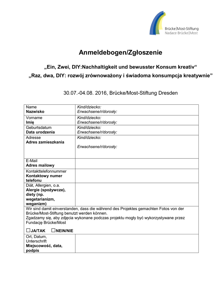 Anmeldebogen/Zgłoszenie „Ein, Zwei, DIY:Nachhaltigkeit und bewusster Konsum kreativ“ „Raz, dwa, DIY: rozwój zrównoważony i świadoma konsumpcja kreatywnie” 30.07.-04.08. 2016, Brücke/Most-Stiftung Dresden Name Nazwisko Kind/dziecko: Erwachsene/r/dorosły: Vorname Imię Geburtsdatum Data urodzenia Adresse Adres zamieszkania Kind/dziecko: Erwachsene/r/dorosły: Kind/dziecko: Erwachsene/r/dorosły: Kind/dziecko: Erwachsene/r/dorosły: E-Mail Adres mailowy Kontakttelefonnummer Kontaktowy numer telefonu Diät, Allergien, o.a. Alergie (spożywcze), diety (np. wegetarianizm, weganizm) Wir sind damit einverstanden, dass die während des Projektes gemachten Fotos von der Brücke/Most-Stiftung benutzt werden können. Zgadzamy się, aby zdjęcia wykonane podczas projektu mogły być wykorzystywane przez Fundację Brücke/Most □JA/TAK □NEIN/NIE Ort, Datum, Unterschrift Miejscowość, data, podpis