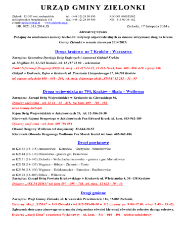 URZĄD GMINY ZIELONKI Zielonki 32-087 woj. małopolskie tel. (+48 12) 28 50 850 ul.Krakowskie Przedmieście 116 fax. (+48 12) 28 50 950 e-mail: [email protected] www.zielonki.ug.pl REGON 000552082 NIP 513-00-38-162 DK.7021.315.2014.JS Zielonki, 17 listopada 2014 r. Adresat wg wykazu Podajmy do wiadomości numery telefonów instytucji odpowiedzialnych za zimowe utrzymanie dróg na terenie Gminy Zielonki w sezonie zimowym 2014/2015: Droga krajowa nr 7 Kraków - Warszawa Zarządca: Generalna Dyrekcja Dróg Krajowych i Autostrad Oddział Kraków ul. Mogilska 25, 31-542 Kraków, tel. 12 417 25 00 - sekretariat Punkt Informacji Drogowej (PID) tel. stacj. - 12 417-14-22, 12 412-16-44, kom. 600 - 800 -610 czynny 24h Oddział w Krakowie, Rejon w Krakowie ul. Powstania Listopadowego 67, 30-298 Kraków tel. czynny całą dobę 608 – 648 - 204, tel. stacj. dyżurnego akcji „ZIMA” 12 285 – 51 - 95 Droga wojewódzka nr 794, Kraków - Skała – Wolbrom Zarządca: Zarząd Dróg Wojewódzkich w Krakowie ul. Głowackiego 56, Dyżurny akcji zima – tel. 12 44 – 65 – 855, tel. kom. 609 – 703 - 392 teren Gminy Zielonki Rejon Dróg Wojewódzkich w Jakubowicach 75, tel. 12-386-38-30 Kierownik Rejonu Drogowego w Jakubowicach Pan Edward Krzek tel. kom. 603-962-189 Dyżurny akcji zima – tel. kom. 609 704 884 Obwód Drogowy Wolbrom tel stacjonarny 32-644-20-53 Kierownik Obwodu Drogowego Wolbrom Pan Marek Kozioł tel. kom. 603-962-186 Drogi powiatowe nr K2133 (18-115) Januszowice – Korzkiew – Grębynice - Smardzowice nr K2144 (18-138) Brzozówka - granice gm. Iwanowice nr K2151 (18-145) Zielonki – Wola Zachariaszowska - granica z gm. Michałowice nr K2158 (18-153) Węgrzce – Bibice – Zielonki – Tonie nr K2156 (18-154) Węgrzce – Dziekanowice – Batowice - Raciborowice nr K2193 (18-309) Bibice – Witkowice Zarządca: Zarząd Dróg Powiatu Krakowskiego w Krakowie ul. Włościańska 4, 30 -138 Kraków Dyżurny „AKCJA ZIMA” tel. kom 507 – 098 – 708, tel. stacj. 12 622 – 10 – 30 Drogi gminne Zarządca: Wójt Gminy Zielonki, ul. Krakowskie Przedmieście 116, 32-087 Zielonki, Dyżurny Akcji „ZIMA” w UG Zielonki - tel. 012-285-08-50 w 113 (czynny pn. 9:00–17:00, wt–pt 7:45 – 15:45). Zgłoszenia dotyczące zimowego utrzymania dróg można również kierować również do sołtysów danego sołectwa. Dyżurny „Akcji Zima” z ramienia Wykonawcy - tel. kom. – 511 – 010 – 491 – telefon całodobowy