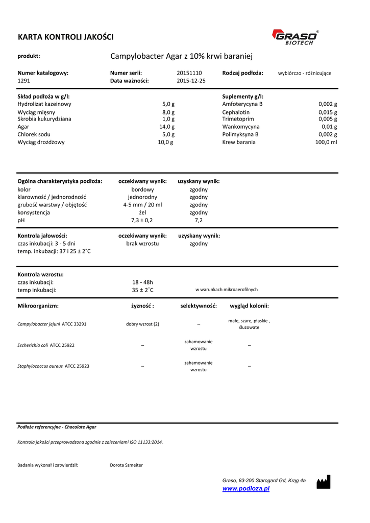 KARTA KONTROLI JAKOŚCI produkt: Campylobacter Agar z 10% krwi baraniej Numer katalogowy: 1291 Numer serii: Data ważności: Skład podłoża w g/l: Hydrolizat kazeinowy Wyciąg mięsny Skrobia kukurydziana Agar Chlorek sodu Wyciąg drożdżowy 20151110 2015-12-25 Rodzaj podłoża: Suplementy g/l: Amfoterycyna B Cephalotin Trimetoprim Wankomycyna Polimyksyna B Krew barania 5,0 g 8,0 g 1,0 g 14,0 g 5,0 g 10,0 g Ogólna charakterystyka podłoża: kolor klarowność / jednorodność grubość warstwy / objętość konsystencja pH oczekiwany wynik: bordowy jednorodny 4-5 mm / 20 ml żel 7,3 ± 0,2 uzyskany wynik: zgodny zgodny zgodny zgodny 7,2 Kontrola jałowości: czas inkubacji: 3 - 5 dni temp. inkubacji: 37 i 25 ± 2˚C oczekiwany wynik: brak wzrostu uzyskany wynik: zgodny Kontrola wzrostu: czas inkubacji: temp inkubacji: 18 - 48h 35 ± 2˚C Mikroorganizm: żyzność : selektywność: wygląd kolonii: dobry wzrost (2) – małe, szare, płaskie , śluzowate Escherichia coli ATCC 25922 – zahamowanie wzrostu – Staphylococcus aureus ATCC 25923 – zahamowanie wzrostu – Campylobacter jejuni ATCC 33291 wybiórczo - różnicujące w warunkach mikroaerofilnych Podłoże referencyjne - Chocolate Agar Kontrola jakości przeprowadzona zgodnie z zaleceniami ISO 11133:2014. Badania wykonał i zatwierdził: Dorota Szmeiter Graso, 83-200 Starogard Gd, Krąg 4a www.podloza.pl 0,002 g 0,015 g 0,005 g 0,01 g 0,002 g 100,0 ml