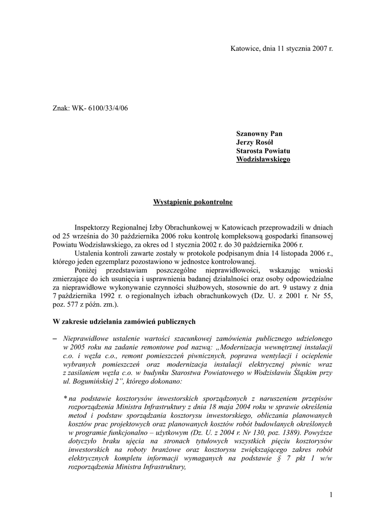 Katowice, dnia 11 stycznia 2007 r. Znak: WK- 6100/33/4/06 Szanowny Pan Jerzy Rosół Starosta Powiatu Wodzisławskiego Wystąpienie pokontrolne Inspektorzy Regionalnej Izby Obrachunkowej w Katowicach przeprowadzili w dniach od 25 września do 30 października 2006 roku kontrolę kompleksową gospodarki finansowej Powiatu Wodzisławskiego, za okres od 1 stycznia 2002 r. do 30 października 2006 r. Ustalenia kontroli zawarte zostały w protokole podpisanym dnia 14 listopada 2006 r., którego jeden egzemplarz pozostawiono w jednostce kontrolowanej. Poniżej przedstawiam poszczególne nieprawidłowości, wskazując wnioski zmierzające do ich usunięcia i usprawnienia badanej działalności oraz osoby odpowiedzialne za nieprawidłowe wykonywanie czynności służbowych, stosownie do art. 9 ustawy z dnia 7 października 1992 r. o regionalnych izbach obrachunkowych (Dz. U. z 2001 r. Nr 55, poz. 577 z późn. zm.). W zakresie udzielania zamówień publicznych – Nieprawidłowe ustalenie wartości szacunkowej zamówienia publicznego udzielonego w 2005 roku na zadanie remontowe pod nazwą: „Modernizacja wewnętrznej instalacji c.o. i węzła c.o., remont pomieszczeń piwnicznych, poprawa wentylacji i ocieplenie wybranych pomieszczeń oraz modernizacja instalacji elektrycznej piwnic wraz z zasilaniem węzła c.o. w budynku Starostwa Powiatowego w Wodzisławiu Śląskim przy ul. Bogumińskiej 2”, którego dokonano: * na podstawie kosztorysów inwestorskich sporządzonych z naruszeniem przepisów rozporządzenia Ministra Infrastruktury z dnia 18 maja 2004 roku w sprawie określenia metod i podstaw sporządzania kosztorysu inwestorskiego, obliczania planowanych kosztów prac projektowych oraz planowanych kosztów robót budowlanych określonych w programie funkcjonalno – użytkowym (Dz. U. z 2004 r. Nr 130, poz. 1389). Powyższe dotyczyło braku ujęcia na stronach tytułowych wszystkich pięciu kosztorysów inwestorskich na roboty branżowe oraz kosztorysu zwiększającego zakres robót elektrycznych kompletu informacji wymaganych na podstawie § 7 pkt 1 w/w rozporządzenia Ministra Infrastruktury, 1 * z pominięciem kwoty 892,42 zł tj. wartości robót dotyczących remontu instalacji elektrycznej, wynikających z kosztorysu inwestorskiego obejmującego 5 pozycji przedmiarowych, o które faktycznie zwiększono zakres robót – o czym poinformowano wykonawców pismem z dnia 6 czerwca 2005 r. W rezultacie udzielono zamówienia publicznego w trybie przetargu nieograniczonego o uproszczonej procedurze, w sytuacji gdy prawidłowo obliczona wartość szacunkowa zamówienia przekraczała w złotych równowartość kwoty 60.000 euro, czym naruszono postanowienia art. 32 ust. 1 i ust. 2 w związku z art. 33 ust. 1 pkt 1 ustawy z dnia 29 stycznia 2004 roku – Prawo zamówień publicznych (Dz. U. z 2004 r. Nr 19, poz. 177 z późn. zm.). Stosownie do powyższych przepisów, podstawą ustalenia wartości zamówienia jest całkowite szacunkowe wynagrodzenie wykonawcy, bez podatku od towarów i usług, ustalone przez zamawiającego z należytą starannością. Skutkiem powyższego nie dopełniono obowiązku przekazania ogłoszenia o zamówieniu publicznym Prezesowi Urzędu Zamówień Publicznych – co jest wymagane na podstawie art. 40 ust. 2 ustawy – Prawo zamówień publicznych – a także nie zamieszczono ogłoszenia w Biuletynie Zamówień Publicznych, ograniczając tym samym potencjalny krąg podmiotów mogących przystąpić do postępowania o zamówienie publiczne, co naruszało przepis art. 7 ust. 1 ustawy – Prawo zamówień publicznych. Ponadto nie zachowano terminu składania ofert określonego w art. 43 ust. 2 ustawy – Prawo zamówień publicznych (w brzmieniu obowiązującym do dnia 25 maja 2006 roku). Przyczyną nieprawidłowości był brak dochowania należytej staranności przy ustalaniu wartości szacunkowej zamówienia, za co odpowiedzialność ponosi Naczelnik Wydziału Infrastruktury Technicznej – na podstawie uchwały nr 35/2004 Zarządu Powiatu Wodzisławskiego z dnia 10 marca 2004 roku w sprawie: „ustalenia instrukcji dotyczącej trybu postępowania w zakresie ustawy z dnia 29 stycznia 2004 roku – Prawo zamówień publicznych (Dz.U. Nr 19, poz. 177) do stosowania w Wydziałach Starostwa Powiatowego w Wodzisławiu Śląskim”. Ponadto odpowiedzialność ponoszą również: - p. Józef Żywina – Wicestarosta Powiatu Wodzisławskiego, który zatwierdził specyfikację istotnych warunków zamówienia oraz wraz z p. Andrzejem Kania – Członkiem Zarządu, podpisał umowę nr 8/IT/2005 z dnia 30.06.05 r. na roboty budowlane w budynku Starostwa Powiatowego w Wodzisławiu Śląskim, z wykonawcą wybranym z naruszeniem Prawa zamówień publicznych. Wniosek nr 1 Wzmocnić nadzór nad pracownikami Wydziału Infrastruktury Technicznej Starostwa Powiatowego w Wodzisławiu Śląskim w zakresie ustalania wartości szacunkowej zamówień publicznych oraz przygotowywania kosztorysów inwestorskich, stosownie do treści art. 32 ust. 1 art. 33 ust. 1 pkt 1 ustawy z dnia 29 stycznia 2004 roku - Prawo zamówień publicznych (Dz.U. z 2006 r. Nr 164, poz. 1163 z późn. zm.), mając na uwadze przepisy art. 47 ustawy z dnia 30 czerwca 2005 r. o finansach publicznych (Dz.U. Nr 249, poz. 2104 z późn. zm.). 2 W zakresie udzielania dotacji – Zawarcie z Miastem Wodzisław Śląski w dniu 1 czerwca 2005 r. umowy nr 5/2005DOTACJE oraz przekazanie na jej podstawie kwoty 5.000 zł na realizację zadania publicznego w dziedzinie kultury pn. „V Międzynarodowy Festiwal - Folklor Bez Granic”, pomimo że konkurs na realizację w/w zadania, przeprowadzony w dniach od 1 do 4 lutego 2005 roku, przez Powiat Wodzisławski na podstawie przepisów ustawy z dnia 24 kwietnia 2003 r. o działalności pożytku publicznego i wolontariacie (Dz.U. z 2003 r. Nr 96, poz. 873 z późn. zm.), wygrał Miejski Ośrodek Kultury „Centrum” z siedzibą w Wodzisławiu Śląskim, działający jako samorządowa ins