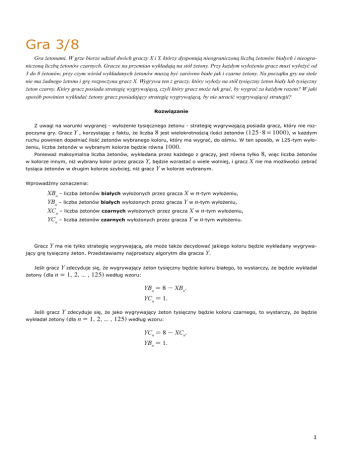 Gra 3/8 Gra żetonami. W grze bierze udział dwóch graczy X i Y, którzy dysponują nieograniczoną liczbą żetonów białych i nieograniczoną liczbą żetonów czarnych. Gracze na przemian wykładają na stół żetony. Przy każdym wyłożeniu gracz musi wyłożyć od 3 do 8 żetonów, przy czym wśród wykładanych żetonów muszą być zarówno białe jak i czarne żetony. Na początku gry na stole nie ma żadnego żetonu i grę rozpoczyna gracz X. Wygrywa ten z graczy, który wyłoży na stół tysięczny żeton biały lub tysięczny żeton czarny. Który gracz posiada strategię wygrywającą, czyli który gracz może tak grać, by wygrać za każdym razem? W jaki sposób powinien wykładać żetony gracz posiadający strategię wygrywającą, by nie utracić wygrywającej strategii? Rozwiązanie Z uwagi na warunki wygranej - wyłożenie tysięcznego żetonu - strategię wygrywającą posiada gracz, który nie rozpoczyna gry. Gracz Y , korzystając z faktu, że liczba 8 jest wielokrotnością ilości żetonów (125 . 8 = 1000), w każdym ruchu powinien dopełniać ilość żetonów wybranego koloru, który ma wygrać, do ośmiu. W ten sposób, w 125-tym wyłożeniu, liczba żetonów w wybranym kolorze będzie równa 1000. 8, więc liczba żetonów Y, będzie wzrastać o wiele wolniej, i gracz X nie ma możliwości zebrać tysiąca żetonów w drugim kolorze szybciej, niż gracz Y w kolorze wybranym. Ponieważ maksymalna liczba żetonów, wykładana przez każdego z graczy, jest równa tylko w kolorze innym, niż wybrany kolor przez gracza Wprowadźmy oznaczenia: XBn – liczba żetonów białych wyłożonych przez gracza X w n-tym wyłożeniu, YBn – liczba żetonów białych wyłożonych przez gracza Y w n-tym wyłożeniu, XCn – liczba żetonów czarnych wyłożonych przez gracza X w n-tym wyłożeniu, YCn – liczba żetonów czarnych wyłożonych przez gracza Y w n-tym wyłożeniu. Y ma nie tylko strategię wygrywającą, ale może także decydować jakiego koloru będzie wykładany wygrywający grę tysięczny żeton. Przedstawiamy najprostszy algorytm dla gracza Y. Gracz Y zdecyduje się, że wygrywający żeton tysięczny będzie koloru białego, to wystarczy, że będzie wykładał n = 1, 2, ... , 125) według wzoru: Jeśli gracz żetony (dla YBn = 8 - XBn. YCn = 1. Jeśli gracz Y zdecyduje się, że jako wygrywający żeton tysięczny będzie koloru czarnego, to wystarczy, że będzie wykładał żetony (dla n = 1, 2, ... , 125) według wzoru: YCn = 8 - XCn. YBn = 1. 1