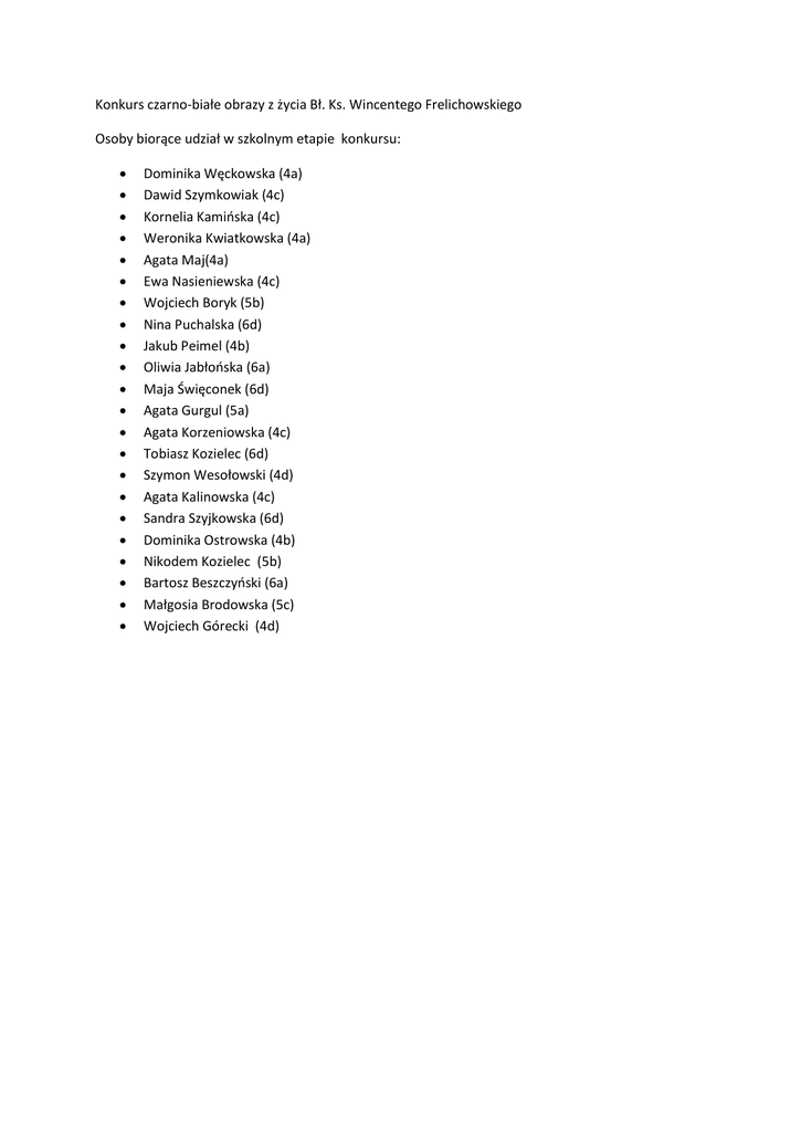 Konkurs czarno-białe obrazy z życia Bł. Ks. Wincentego Frelichowskiego Osoby biorące udział w szkolnym etapie konkursu: Dominika Węckowska (4a) Dawid Szymkowiak (4c) Kornelia Kamińska (4c) Weronika Kwiatkowska (4a) Agata Maj(4a) Ewa Nasieniewska (4c) Wojciech Boryk (5b) Nina Puchalska (6d) Jakub Peimel (4b) Oliwia Jabłońska (6a) Maja Święconek (6d) Agata Gurgul (5a) Agata Korzeniowska (4c) Tobiasz Kozielec (6d) Szymon Wesołowski (4d) Agata Kalinowska (4c) Sandra Szyjkowska (6d) Dominika Ostrowska (4b) Nikodem Kozielec (5b) Bartosz Beszczyński (6a) Małgosia Brodowska (5c) Wojciech Górecki (4d)