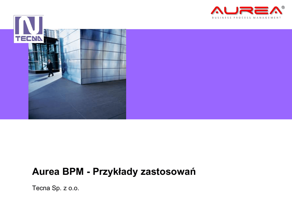 <Insert Picture Here> Aurea BPM - Przykłady zastosowań Tecna Sp. z o.o. Przykłady wykorzystania systemu Aurea BPM • Obsługa wniosku urlopowego • Obsługa sprawy urzędowej • Obsługa zgłoszenia serwisowego • Rozliczenie faktur kosztowych • Zawarcie umowy ubezpieczeniowej Tecna - Quality software solutions Obsługa wniosku urlopowego • Prosty obieg dokumentu • Wyznaczanie ścieżki akceptacji wniosku na podstawie złożonych reguł z uwzględnieniem struktury organizacyjnej przedsiębiorstwa Tecna - Quality software solutions Obsługa wniosku urlopowego Prezes Akceptacja przez bezpośredniego przełożonego Asystentka Prezesa Dyrektor Departamentu Oprogramowania Pracownik składa wniosek Akceptacja przez dyrektora departamentu Dyrektor Departamentu Projektów Starszy Specjalista Kierownik Projektu Specjalista Starszy Specjalista Dyrektor Finansowy Główny Księgowy Specjalista Value Based Hierarchy Ewidencja w kadrach i poinformowanie pracownika Tecna - Quality software solutions Obsługa sprawy urzędowej • Obsługa typowych spraw w urzędach • Obsługa spraw według predefiniowanych obiegów • Obsługa spraw według obiegów ad-hoc Tecna - Quality software solutions Obsługa sprawy urzędowej Przyjęcie pisma i przekazanie do działu [Kancelaria] Archiwizacja teczki [Sekretariat działu] Pismo przychodzące Przyjęcie pisma i przekazanie do pracownika [Sekretariat działu] Obsługa i zamknięcie sprawy [Pracownik] Przyjęcie pisma wychodzącego i wysłanie do Klienta [Sekretariat działu] Klient Tecna - Quality software solutions Obsługa zgłoszenia serwisowego • Uruchamianie procesu za pomocą portalu lub e-mail • Przebieg obsługi serwisowej kontrolowany przez proces biznesowy • Wyznaczanie wykonawców w trakcie realizacji procesu Tecna - Quality software solutions Obsługa zgłoszenia serwisowego Przyjęcie zgłoszenia i wyznaczenie wykonawcy Klient Zgłoszenie serwisowe za pomocą poczty e-mail lub ankiety na stronie www Realizacja zgłoszenia Klient Zatwierdzenie Powiadomienie o realizacji Tecna - Quality software solutions Rozliczenie faktur kosztowych • Obieg faktury kosztowej w organizacji • Reguły walidacji poprawności podziału kosztów • Przekazywanie danych do systemu zewnętrznego Tecna - Quality software solutions Rozliczenie faktur kosztowych Tecna - Quality software solutions Zawarcie umowy przez Agenta • Określona poprzez proces biznesowy sekwencja działań z klientem • Praca Offline • Generowanie dokumentów na podstawie danych procesu Tecna - Quality software solutions Zawarcie umowy przez Agenta Tecna - Quality software solutions Dane producenta Tecna - Quality software solutions
