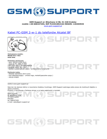 GSM-Support ul. Bitschana 2/38, 31-420 Kraków mobile +48 608107455, NIP PL9451852164 REGON: 120203925 www.gsm-support.pl Kabel PC-GSM 2-w-1 do telefonów Alcatel BF Obsługiwane modele: Alcael 311 i 511 oraz inne Parametry techniczne: - port: RS232 (COM-Port) - wtyk do PC: DB9 (9 PIN) - RS-232C oraz V.28 specyfikacja - długość kabla: ok. 1.2m - bardzo wysoka jakość złączy - profesjonalne wykonanie Możliwości kabla: - blokady operatora (Sim-Lock) - kod zabezpieczający - zmiana logo, melodii(specialne oprgr.) - edycja książki ©2012 www.gsm-support.pl Opis ten nie stanowi oferty w rozumieniu Kodeksu Cywilnego. GSM-Support zastrzega sobie prawo do możliwych błędów w opisie produktu. Prosimy o weryfikację z Państwa strony, a w razie wątpliwości o kontakt. GSM-Support ul. Bitschana 2/38 31-420 Kraków POLSKA tel. 608107455 e-mail: [email protected] Powered by TCPDF (www.tcpdf.org)