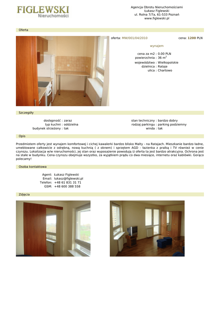 Agencja Obrotu Nieruchomościami Łukasz Figlewski ul. Rolna 7/7a, 61-533 Poznań www.figlewski.pl Oferta oferta: MW/001/04/2010 cena: 1200 PLN wynajem cena za m2 : 0.00 PLN powierzchnia : 36 m2 województwo : Wielkopolskie dzielnica : Rataje ulica : Chartowo Szczegóły dostępność : zaraz typ kuchni : oddzielna budynek strzeżony : tak stan techniczny : bardzo dobry rodzaj parkingu : parking podziemny winda : tak Opis Przedmiotem oferty jest wynajem komfortowej i cichej kawalerki bardzo blisko Malty - na Ratajach. Mieszkanie bardzo ładne, umeblowane całkowicie z odrębną, nową kuchnią ( z oknem) i sprzętem AGD - łazienka z pralką i TV również w cenie czynszu. Lokalizacja w/w nieruchomości, jej stan oraz wyposażenie powodują iż oferta ta jest bardzo atrakcyjna. Ochrona jest na stałe w budynku. Cena czynszu obejmuje wszystko, za wyjątkiem prądu co dwa miesiące, internetu oraz kablówki. Gorąco polecamy! Osoba kontaktowa Agent: Łukasz Figlewski Email: [email protected] Telefon: +48 61 831 31 71 GSM: +48 600 388 558 Zdjęcia