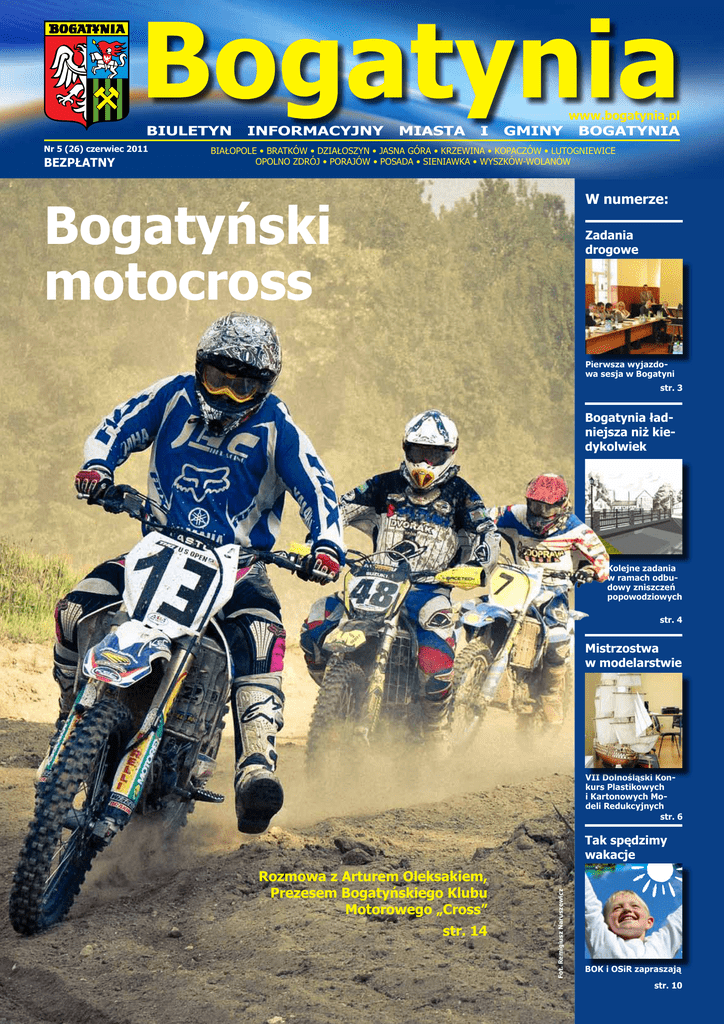 Bogatynia BIULETYN BEZPŁATNY MIASTA I GMINY BOGATYNIA BIAŁOPOLE • BRATKÓW • DZIAŁOSZYN • JASNA GÓRA • KRZEWINA • KOPACZÓW • LUTOGNIEWICE OPOLNO ZDRÓJ • PORAJÓW • POSADA • SIENIAWKA • WYSZKÓW-WOLANÓW Bogatyński motocross W numerze: Zadania drogowe Pierwsza wyjazdowa sesja w Bogatyni str. 3 Bogatynia ładniejsza niż kiedykolwiek Kolejne zadania w ramach odbudowy zniszczeń popowodziowych str. 4 Mistrzostwa w modelarstwie VII Dolnośląski Konkurs Plastikowych i Kartonowych Modeli Redukcyjnych str. 6 Tak spędzimy w aka i Rekreacji str. 14 IEC LIP Rozmowa z Arturem Oleksakiem, Prezesem Bogatyńskiego Klubu Motorowego „Cross”Ośrodek Sportu w Bogatyni Fot. Remigiusz Naruszewicz Tak spędzimy wakacje Serdecznie zapraszamy wszystkie dzieci od 7 roku życia na zajęcia sportowe i rekreacyjne. Zajęcia odbywają się w dniach od 4 do 29 lipca od poniedziałku do piątku 30 00 w godz. od 10 do 13 Zajęcia nieodpłatne Bogat Serdecznie z od 7 roku ży SIERPIEŃ Nr 5 (26) czerwiec 2011 INFORMACYJNY www.bogatynia.pl BOK i OSiR zapraszają str. 10 zajęcia dzien projekcje filmó warsztaty foto wycieczki piesz Zajęcia odbywa od 1 do 26 sier od poniedziałku 0 w godz. od 10 Zaję 10 zł/tydzie XV sesja rady Kierunki rozwoju bogatyńskiej oświaty 26 maja br. odbyła się XV sesja Rady Gminy i Miasta Bogatynia. Głównym tematem obrad było podjęcie uchwał w sprawie przyjęcia analizy stanu edukacji w gminie Bogatynia (lata 2006 – 2011) oraz przyjęcia strategii rozwoju oświaty w mieście i gminie Bogatynia na lata 2011 – 2017. Przedstawiony radnym raport zawierał zagadnienia dotyczące edukacji, budżetu i demografii. Na jego podstawie zostały szczegółowo określone słabe i mocne strony bogatyńskiej oświaty, co z kolei stanowiło podstawę do opracowania strategii oświaty na kolejne lata. Zastępca Burmistrza ds. Polityki Regionalnej - Jerzy Stachyra wyjaśnił, że w tworzeniu strategii brali udział dyrektorzy placówek oświatowych, związki zawodowe oraz radni. Zespół wskazał dziesięć obszarów, w których należy rozwijać oświatę: efektywne wykorzystanie bazy szkół, pozyskiwanie środków pozabudżetowych na działania edukacyjne, remonty i modernizacja bazy dydaktycznej obiektów oświatowych, upowszechnianie edukacji przedszkolnej, podnoszenie wyników egzaminów zewnętrznych, efektywne wykorzystanie środków publicznych na zadania oświatowe, działania proeuropejskie kształtujące umiejętność posługiwania się językami obcymi, wspieranie działań kształtujących umiejętność posługiwania się technologią informacyjną, zapewnienie optymalnego rozwoju dzieci i młodzieży ze specjalnymi potrzebami edukacyjnymi, współpraca z Powiatem Zgorzeleckim Sesja tematyczna Restrukturyzacja SP ZOZ 16 czerwca odbyła się sesja rady poświęcona sprawom funkcjonowania służby zdrowia na terenie gminy Bogatynia. Przed rozpoczęciem sesji burmistrz Andrzej Grzmielewicz, zastępca burmistrza – Jerzy Stachyra oraz Sekretarz Związku Kombatantów i Byłych Więźniów Politycznych w Bogatyni – Pan Józef Frankiewicz odebrali, przyznane na wniosek Zarządu Związku Inwalidów Wojennych w Jeleniej Górze, podziękowania i odznaczenia z rąk Pana Wojciecha Olenderka – Prezesa Zarządu Okręgu Inwalidów Wojennych we Wrocławiu. Podczas sesji, temat funkcjonowania służby zdrowia w Bogatyni prezentował dyrektor SP ZOZ Roman Kulczycki. Przedstawione radzie sprawozdanie, poza częścią finansową, zawierało: realizację umów z Narodowym Funduszem Zdrowia, wykonanie programów zdrowotnych, wysokość zatrudnienia w poszczególnych placówkach. Według dyrektora, od początku funkcjonowania SP ZOZ, wynik finansowy zakładu, pomimo dotacji z gminy (poza jednym rokiem) był ujemny. Jest to problem złożony, na który składają się m.in. polityka prowadzona przez NFZ, brak zapłaty za wypracowane nadwykonania, niewystarczające kontrakty na wykonywanie usług medycznych. Dyrektor przedstawił również propozycje kierunków restrukturyzacji SP ZOZ, przygotował dokument, w którym zawarł program naprawy finansów zakładu i zmniejszenie kosztów jego funkcjonowania. Następnie pracę poszczególnych oddziałów szpitala oraz poradni SP ZOZ zaprezentowali: Zastępca Dyrektora ds. Lecznictwa – lek. med. Magdalena Załucka – Seweryn oraz ordynatorzy oddziałów. W trakcie dyskusji burmistrz Andrzej Grzmielewicz stwierdził, że próby zmian strukturalnych w SP ZOZ są niepożądane i na to samorząd nie może pozwolić. Dodał, że jako burmistrz jest zobligowany do szukania środków finansowych na funkcjonowanie szpitala, na niezbędne remonty, na zaspokajanie potrzeb, które służą mieszkańcom. Tym bardziej, że zwiększa się liczba osób, które zapisują się do lekarzy POZ, ponieważ rośnie jakość oferowanych usług i zaufanie do personelu. Wszelkie próby restrukturyzacji SP ZOZ w zakresie własnościo- w celu poprawienia dostępności i efektywności oferty pomocy psychologiczno – pedagogicznej dla uczniów, rodziców i wychowawców. Podczas sesji radni podjęli również uchwały w sprawie przystąpienia Gminy Bogatynia do Stowarzyszenia Południowo – Zachodnie Forum Samorządu Terytorialnego „Pogranicze”, a także do Stowarzyszenia Gmin Przyjaznych Energii Odnawialnej. Radni zdecydowali również o przystąpieniu do sporządzenia miejscowego planu zagospodarowania przestrzennego pod lokalizację szklarni w obrębie Zatonia i Trzcińca. Stowarzyszenie Południowo – Zachodnie Forum Samorządu Terytorialnego „Pogranicze” jest jednym ze stowarzyszeń, które dużą wagę w swojej działalności poświęca zabudowie przysłupowej. W Bogatyni Stowym, czyli konsolidacja czy prywatyzacja, mogą doprowadzić do sytuacji, że Bogatynia nie będzie miała szpitala. Dodał, że taka struktura, w jakiej obecnie znajduje się szpital jest, jego zdaniem, najwłaściwsza. Dwa główne źródła finansowania SP ZOZ 