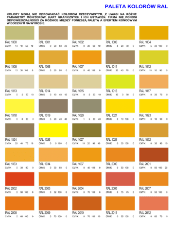 PALETA KOLORÓW RAL KOLORY MOG¥ NIE ODPOWIADAÆ KOLOROM RZECZYWISTYM, Z UWAGI NA RÓ¯NE PARAMETRY MONITORÓW, KART GRAFICZNYCH I ICH USTAWIEÑ. FIRMA NIE PONOSI ODPOWIEDZIALNOŒCI ZA RÓ¯NICE MIÊDZY PONI¯SZ¥ PALET¥ A EFEKTEM KOÑCOWYM WIDOCZNYM NA WYROBIE.