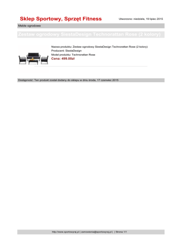 Sklep Sportowy, Sprzęt Fitness Utworzono: niedziela, 19 lipiec 2015 Meble ogrodowe Zestaw ogrodowy SiestaDesign Technorattan Rose (2 kolory) Nazwa produktu: Zestaw ogrodowy SiestaDesign Technorattan Rose (2 kolory) Producent: SiestaDesign Model produktu: Technorattan Rose Cena: 499.00zł Dostępność: Ten produkt został dodany do sklepu w dniu środa, 17 czerwiec 2015 http://www.sportowyraj.pl | [email protected] | | Strona 1/1