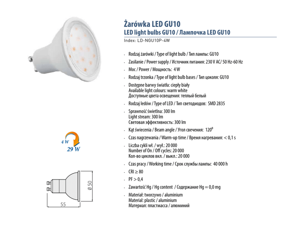 Żarówka LED GU10 LED light bulbs GU10 / Лампочка LED GU10 Index: LD-NGU10P-4W • • • • • • • • • 4W • 29 W • 50 • • • • 55 Rodzaj żarówki / Type of light bulb / Тип лампы: GU10 Zasilanie / Power supply / Источник питания: 230 V AC/ 50 Hz-60 Hz Moc / Power / Мощность: 4 W Rodzaj trzonka / Type of light bulb bases / Тип цоколя: GU10 Dostępne barwy światła: ciepły biały Available light colours: warm white Доступные цвета освещения: теплый белый Rodzaj ledów / Type of LED / Тип светодиодов: SMD 2835 Sprawność świetlna: 300 lm Light stream: 300 lm Световая эффективность: 300 lm Kąt świecenia / Beam angle / Угол свечения: 120⁰ Czas nagrzewania / Warm-up time / Время нагревания: < 0,1 s Liczba cykli wł. / wył.: 20 000 Number of On / Off cycles: 20 000 Кол-во циклов вкл. / выкл.: 20 000 Czas pracy / Working time / Срок службы лампы: 40 000 h CRI ≥ 80 PF > 0,4 Zawartość Hg / Hg content / Содержание Hg = 0,0 mg Materiał: tworzywo / aluminium Material: plastic / aluminium Материал: пластмасса / алюминий