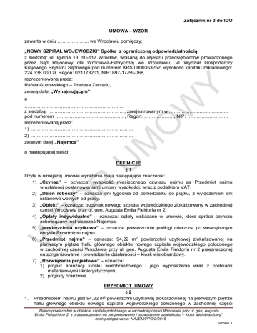 Załącznik nr 3 do IDO UMOWA – WZÓR zawarta w dniu ……………….. we Wrocławiu pomiędzy: „NOWY SZPITAL WOJEWÓDZKI” Spółka z ograniczoną odpowiedzialnością z siedzibą: ul. Igielna 13, 50-117 Wrocław, wpisaną do rejestru przedsiębiorców prowadzonego przez Sąd Rejonowy dla Wrocławia-Fabrycznej we Wrocławiu, VI Wydział Gospodarczy Krajowego Rejestru Sądowego pod numerem KRS 0000353252; wysokość kapitału zakładowego: 224 338 000 zł, Regon: 021173201, NIP: 897-17-59-068, reprezentowaną przez: Rafała Guzowskiego – Prezesa Zarządu, zwaną dalej „Wynajmującym” a ……………………………………………………… z siedzibą: …………………………………………, zarejestrowanym w ……………........................... pod numerem …………………………………….., Regon: ………………., NIP: …………………….. reprezentowaną przez: 1) ……………………………………………………….. 2) ……………………………………………………….. zwanym dalej „Najemcą” o następującej treści: DEFINICJE §1 Użyte w niniejszej umowie wyrażenia mają następujące znaczenie: 1) „Czynsz” – oznacza: wysokość miesięcznego czynszu najmu za Przedmiot najmu w ustalonej postanowieniami umowy wysokości, wraz z podatkiem VAT. 2) „Dzień roboczy” – oznacza dni tygodnia od poniedziałku do piątku, z wyłączeniem dni ustawowo wolnych od pracy. 3) „Obiekt” – oznacza: budynek nowego szpitala wojewódzkiego zlokalizowany w zachodniej części Wrocławia przy ul. gen. Augusta Emila Fieldorfa nr 2. 4) „Opłaty indywidualne” – oznacza: opłaty wskazane w umowie, które oprócz czynszu zobowiązany jest uiszczać Najemca. 5) „powierzchnia użytkowa” – oznacza: powierzchnię podłogi mierzoną po wewnętrznym obrysie Przedmiotu najmu. 6) „Przedmiot najmu” – oznacza: 94,22 m2 powierzchni użytkowej zlokalizowanej na pierwszym piętrze hallu głównego obiektu nowego szpitala wojewódzkiego położonego w zachodniej części Wrocławia przy ul. gen. Augusta Emila Fieldorfa nr 2 przeznaczonej na zorganizowanie i prowadzenie działalności – kiosk wielobranżowy. 7) „Rozwiązania projektowe” – oznacza: 1) projekt aranżacji kiosku wielobranżowego i jego wyposażenia wraz z próbkami materiałowymi i kolorystycznymi, 2) projekty branżowe. 1. PRZEDMIOT UMOWY §2 2 Przedmiotem najmu jest 94,22 m powierzchni użytkowej zlokalizowanej na pierwszym piętrze hallu głównego obiektu nowego szpitala wojewódzkiego położonego w zachodniej części „Najem powierzchni w obiekcie szpitala położonego w zachodniej części Wrocławia przy ul. gen. Augusta Emila Fieldorfa nr 2 z przeznaczeniem na zorganizowanie i prowadzenie działalności – kiosk wielobranżowy” – znak postępowania: NAJEM/PPO/2/2015 Strona 1 2. 3. 4. 5. 6. Wrocławia przy ul. gen. Augusta Emila Fieldorfa nr 2 przeznaczonej na zorganizowanie i prowadzenie działalności – kiosk wielobranżowy. Przedmiot najmu stanowi półotwarta przestrzeń do zabudowy w granicach oznaczonych na rzucie przedmiotu najmu. Rzut Przedmiotu najmu został zawarty w załączniku nr 2 do umowy. Wynajmujący oświadcza, że posiada zgodę uprawniającą do wynajęcia Przedmiotu najmu. Przedmiot najmu wyposażony jest w doprowadzoną: 1) instalację sanitarną (CO), 2) instalację elektryczną, 3) instalację wentylacyjną, 4) przyłącze internetowe, 5) instalacje p. poż. Dokumentacja projektowa instalacji dla Przedmiotu najmu została udostępniona na etapie postępowania o najem. Przedmiot najmu nie posiada doprowadzonej instalacji wodno-kanalizacyjnej. Wodę niezbędną do sprzedaży m.in. gorących napojów Najemca zobowiązany jest zapewnić sobie na własny koszt i własnym staraniem (np. przy użyciu butli/pojemników z wodą). Wydanie Przedmiotu najmu Najemcy oraz jego zwrot Wynajmującemu nastąpi na podstawie protokołu zdawczo-odbiorczego, który zostanie sporządzony przy udziale przedstawicieli obu Stron umowy. ZAKRES DZIAŁALNOŚCI §3 1. Na powierzchni objętej Przedmiotem najmu Najemca uprawniony jest do prowadzenia działalności handlowej – kiosk wielobranżowy. 2. Najemca zobowiązany jest do sprzedaży artykułów w sposób zapewniający sprawną, rzetelną i kulturalną obsługę klientów. 3. Najemca ponosi odpowiedzialność za sprzedawane artykuły oraz za przestrzeganie obowiązujących przepisów prawa w szczególności w zakresie przepisów sanitarnoepidemiologicznych oraz sprzedaży artykułów w jednostkach służby zdrowia. 4. Wymaga uprzedniego uzyskania pozytywnej pisemnej zgody Wynajmującego, pod rygorem wypowiedzenia umowy z winy Najemcy i bez zachowania terminów wypowiedzenia: 1) rozszerzenie prowadzonej działalności poza zakres określony w ust. 1 niniejszego paragrafu umowy, 2) zmiana określonego w § 4 umowy zakresu funkcjonowania kiosku wielobranżowego. 5. W przypadku wskazanego w ust. 4 niniejszego paragrafu umowy rozszerzenia lub zmiany, w szczególności zmieniających warunki bezpieczeństwa pożarowego, pracy, epidemiologiczno-sanitarne lub ochrony środowiska, po stronie Najemcy (i na jego koszt) leży uzyskanie wszystkich wymaganych obowiązującymi przepisami prawa pozwoleń i opinii. 1. Zakres funkcjonowania kiosku wielobranżowego §4 Najemca w swojej ofercie winien uwzględnić w codziennej obsłudze: 1) prasę, książki oraz artykuły papiernicze (np. długopisy, ołówki, kredki, bruliony). 2) artykuły higieniczne, kosmetyki i akcesoria higieniczne, np.: a) szczoteczki i pasty do zębów, b) płyny do mycia, mydła, chusteczki i/lub płyny antybakteryjne i higieniczne, c) szampony do włosów, d) maszynki i kremy do golenia, e) podpaski, tampony, wkładki higieniczne, f) pieluszki jednorazowe dla dzieci i dorosłych, g) papier toaletowy h) kremy i balsamy do rąk i ciała, pomadki, antyprespiranty, „Najem powierzchni w obiekcie szpitala 