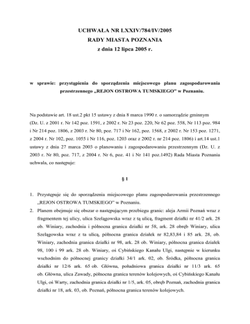 UCHWAŁA NR LXXIV/784/IV/2005 RADY MIASTA POZNANIA z dnia 12 lipca 2005 r. w sprawie: przystąpienia do sporządzenia miejscowego planu zagospodarowania przestrzennego „REJON OSTROWA TUMSKIEGO” w Poznaniu. Na podstawie art. 18 ust.2 pkt 15 ustawy z dnia 8 marca 1990 r. o samorządzie gminnym (Dz. U. z 2001 r. Nr 142 poz. 1591, z 2002 r. Nr 23 poz. 220, Nr 62 poz. 558, Nr 113 poz. 984 i Nr 214 poz. 1806, z 2003 r. Nr 80, poz. 717 i Nr 162, poz. 1568, z 2002 r. Nr 153 poz. 1271, z 2004 r. Nr 102, poz. 1055 i Nr 116, poz. 1203 oraz z 2002 r. nr 214 poz. 1806) i art.14 ust.1 ustawy z dnia 27 marca 2003 o planowaniu i zagospodarowaniu przestrzennym (Dz. U. z 2003 r. Nr 80, poz. 717, z 2004 r. Nr 6, poz. 41 i Nr 141 poz.1492) Rada Miasta Poznania uchwala, co następuje: §1 1. Przystępuje się do sporządzenia miejscowego planu zagospodarowania przestrzennego „REJON OSTROWA TUMSKIEGO” w Poznaniu. 2. Planem obejmuje się obszar o następującym przebiegu granic: aleja Armii Poznań wraz z fragmentem tej ulicy, ulica Szelągowska wraz z tą ulicą, fragment działki nr 41/2 ark. 28 ob. Winiary, zachodnia i północna granica działki nr 58, ark. 28 obręb Winiary, ulica Szelągowska wraz z ta ulicą, północna granica działek nr 82,83,84 i 85 ark. 28, ob. Winiary, zachodnia granica działki nr 98, ark. 28 ob. Winiary, północna granica działek 98, 100 i 99 ark. 28 ob. Winiary, oś Cybińskiego Kanału Ulgi, następnie w kierunku wschodnim do północnej granicy działki 34/1 ark. 02, ob. Śródka, północna granica działki nr 12/6 ark. 65 ob. Główna, południowa granica działki nr 11/3 ark. 65 ob. Główna, ulica Zawady, północna granica terenów kolejowych, oś Cybińskiego Kanału Ulgi, oś Warty, zachodnia granica działki nr 1/5, ark. 05, obręb Poznań, zachodnia granica działki nr 18, ark. 03, ob. Poznań, północna granica terenów kolejowych. 3. Granice obszaru objętego planem oznaczono na rysunku, stanowiącym załącznik graficzny do niniejszej uchwały. §2 Opracowanie obejmuje problematykę wskazaną w art. 15 ust. 2 i ust. 3, z uwzględnieniem art. 4 ust. 3 ustawy z dnia 27 marca 2003 r. o planowaniu i zagospodarowaniu przestrzennym. §3 Opracowywanie i uchwalanie miejscowego planu zagospodarowania przestrzennego „REJON OSTROWA TUMSKIEGO” w Poznaniu może następować odrębnie dla poszczególnych fragmentów tego obszaru. §4 1. Uchyla się, w granicach określonych w § 1, ust. 2 i 3, uchwałę nr XLIII/276/II/96 Rady Miejskiej Poznania z dnia 19 czerwca 1996 r. w sprawie przystąpienia do sporządzenia miejscowego planu zagospodarowania przestrzennego śródmieścia Poznania. 2. Uchyla się uchwałę nr XCVII/1109/III/2002 Rady Miasta Poznania z dnia 24 września 2002 r., w sprawie przystąpienia do sporządzenia miejscowego planu zagospodarowania przestrzennego gazociągu wysokiego ciśnienia DN 150 na odcinku od ul. Gdyńskiej do ZEP S.A. Garbary w Poznaniu. §5 Wykonanie uchwały powierza się Prezydentowi Miasta Poznania. §6 Uchwała wchodzi w życie z dniem podjęcia.