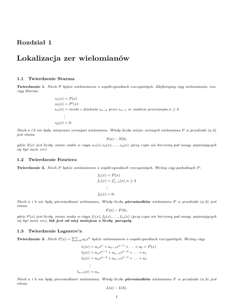 Rozdział 1 Lokalizacja zer wielomianów 1.1 Twierdzenie Sturma Twierdzenie 1. Niech P będzie wielomianem o współczynnikach rzeczywistych. Zdefiniujmy ciąg wielomianów, tzw. ciąg Sturma: s1 (x) = P (x) s2 (x) = P 0 (x) sn (x) = reszta z dzielenia sn−2 przez sn−1 ze znakiem przeciwnym, n ≥ 3 .. . sp (x) = 0. Niech a i b nie będą miejscami zerowymi wielomianu. Wtedy liczba miejsc zerowych wielomianu P w przedziale (a, b) jest równa S(a) − S(b), gdzie S(x) jest liczbą zmian znaku w ciągu s1 (x), s2 (x), . . . , sp (x) (przy czym nie bierzemy pod uwagę pojawiających się być może zer). 1.2 Twierdzenie Fouriera Twierdzenie 2. Niech P będzie wielomianem o współczynnikach rzeczywistych. Weźmy ciąg pochodnych P : f1 (x) = P (x) 0 fn (x) = fn−1 (x), n ≥ 2 .. . fp (x) = 0. Niech a i b nie będą pierwiastkami wielomianu. Wtedy liczba pierwiastków wielomianu P w przedziale (a, b) jest równa F (a) − F (b), gdzie F (x) jest liczbą zmian znaku w ciągu f1 (x), f2 (x), . . . , fm (x) (przy czym nie bierzemy pod uwagę pojawiających się być może zer), lub jest od niej mniejsza o liczbę parzystą. 1.3 Twierdzenie Laguerre’a Twierdzenie 3. Niech P (x) = Pn k=0 ak xk będzie wielomianem o współczynnikach rzeczywistych. Weźmy ciąg: l1 (x) = an xn + an−1 xn−1 + . . . + a0 = P (x) l2 (x) = an xn−1 + an−1 xn−2 + . . . + a1 l3 (x) = an xn−2 + an−1 xn−3 + . . . + a2 .. . ln+1 (x) = an . Niech a i b nie będą pierwiastkami wielomianu. Wtedy liczba pierwiastków wielomianu P w przedziale (a, b) jest równa L(a) − L(b), 1 ROZDZIAŁ 1. LOKALIZACJA ZER WIELOMIANÓW 2 gdzie L(x) jest liczbą zmian znaku w ciągu l1 (x), l2 (x), . . . , ln+1 (x) (przy czym nie bierzemy pod uwagę pojawiających się być może zer), lub jest od niej mniejsza o liczbę parzystą. Wniosek 4 (Reguła Kartezjusza). Niech P (0) 6= 0. Wtedy liczba pierwiastków dodatnich P jest równa liczbie zmian znaku w ciągu współczynników P lub jest od niej mniejsza o liczbę przystą (znowu zaniedbujemy ewentualne zera). 1.4 Zadania Zadanie 1. Określ lokalizację pierwiastków rzeczywistych następujących wielomianów (korzystając z dogodnej metody): a) x3 + x2 − x − 2 b) x3 − 5x2 − 5x + 5 c) x4 − 2x2 − 6x + 5 d) x5 + 4x4 − 3x3 + 5x2 + 3x + 2 e) 3x5 − 4x4 − 3x3 + 2x − 1 Rozwiązanie: a) Korzystamy z najdokładniejszej ale i najbardziej pracochłonnej metody Sturma. Mamy: s1 (x) = x3 + x2 − x − 2 s2 (x) = 3x2 + 2x − 1 8x + 17 s3 (x) = −→ 8x + 17 9 531 s4 (x) = − 64 s5 (x) = 0 Obliczamy znaki w kilku punktach i liczymy ilość zmian znaków: s1 (x) s2 (x) s3 (x) s4 (x) S(x) −∞ − + − − 2 ∞ + + + − 1 0 − − + − 2 1 − + + − 2 2 + + + − 1 b) Korzystamy z metody Fouriera. Mamy: f1 (x) = x3 − 5x2 − 5x + 5 f2 (x) = 3x2 − 10x − 5 f3 (x) = 6x − 10 f4 (x) = 6 Obliczamy znaki w kilku punktach i liczymy ilość zmian znaków: s1 (x) s2 (x) s3 (x) s4 (x) S(x) −∞ − + − + 3 ∞ + + + + 0 0 + − − + 2 1 − − − + 1 2 − − + + 1 c) Korzystamy z metody Laguerre’a. Mamy: l1 (x) = x4 − 2x2 − 6x + 5 l2 (x) = x3 − 2x − 6 l3 (x) = x2 − 2 l4 (x) = x l5 (x) = 1 ROZDZIAŁ 1. LOKALIZACJA ZER WIELOMIANÓW 3 Obliczamy znaki w kilku punktach i liczymy ilość zmian znaków: l1 (x) l2 (x) l3 (x) l4 (x) l4 (x) S(x) −∞ + − + − + 4 ∞ + + + + + 0 0 + − − 0 + 2 1 − − − + + 1 2 + − + + + 2 −1 + − − − + 2 d) Skorzystamy z metody Sturma: s1 (x) = x5 + 4x4 − 3x3 + 5x2 + 3x + 2 s2 (x) = 5x4 + 16x3 − 9x2 + 10x + 3 94x3 − 111x2 − 20x − 38 −→ 94x3 − 111x2 − 20x − 38 25 158425x2 + 147400x + 104750 s4 (x) = − −→ −158425x2 − 147400x − 104750 8836 4115950176x + 3743486268 s5 (x) = − −→ −4115950176x − 3743486268 40157569 2452849413000625 s6 (x) = 24109393984 s3 (x) = Obliczamy znaki w kilku punktach i liczymy ilość zmian znaków: s1 (x) s2 (x) s3 (x) s4 (x) s5 (x) s6 (x) S(x) −∞ − + − − + + 3 ∞ + + + − − + 2 0 + + − − − + 2 Z reguły Kartezjusza dostalibyśmy natychmiast parzystą ilość pierwiastków dodatnich i nieparzystą ilość ujemnych. e) Skorzystamy z metody Laguerre’a: l1 (x) = 3x5 − 4x4 − 3x3 + 2x − 1 l2 (x) = 3x4 − 4x3 − 3x2 + 2 l3 (x) = 3x3 − 4x2 − 3x l4 (x) = 3x2 − 4x − 3 l5 (x) = 3x − 4 l6 (x) = 3 Obliczamy znaki w kilku punktach i liczymy ilość zmian znaków: l1 (x) l2 (x) l3 (x) l4 (x) l5 (x) l6 (x) L(x) −∞ − + − + − + 3 ∞ + + + + + + 0 0 − + 0 − − + 3 1 − − − − − + 1 2 + + + + + + 0 Zadanie 2. korzystając z metody Laguerre;a określ liczbę pierwiastków wielomianu x4 − 5x3 + 2x2 − x + 3 na przedziale (−5, 5). Rozwiązanie. Mamy: ROZDZIAŁ 1. LOKALIZACJA ZER WIELOMIANÓW 4 l1 (x) = x4 − 5x3 + 2x2 − x + 3 l2 (x) = x3 − 5x2 + 2x − 1 l3 (x) = x2 − 5x + 2 l4 (x) = x − 5 l5 (x) = 1 Obliczamy znaki w kilku punktach i liczymy ilość zmian znaków: l1 (x) l2 (x) l3 (x) l4 (x) l6 (x) L(x) −5 + − + − + 3 5 + + + 0 + 0