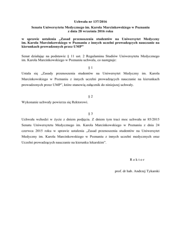 Uchwała nr 137/2016 Senatu Uniwersytetu Medycznego im. Karola Marcinkowskiego w Poznaniu z dnia 28 września 2016 roku w sprawie ustalenia „Zasad przenoszenia studentów na Uniwersytet Medyczny im. Karola Marcinkowskiego w Poznaniu z innych uczelni prowadzących nauczanie na kierunkach prowadzonych przez UMP” Senat działając na podstawie § 11 ust. 2 Regulaminu Studiów Uniwersytetu Medycznego im. Karola Marcinkowskiego w Poznaniu uchwala, co następuje: §1 Ustala się „Zasady przenoszenia studentów na Uniwersytet Medyczny im. Karola Marcinkowskiego w Poznaniu z innych uczelni prowadzących nauczanie na kierunkach prowadzonych przez UMP”, które stanowią załącznik do niniejszej uchwały. §2 Wykonanie uchwały powierza się Rektorowi. §3 Uchwała wchodzi w życie z dniem podjęcia. Z dniem tym traci moc uchwała nr 85/2015 Senatu Uniwersytetu Medycznego im. Karola Marcinkowskiego w Poznaniu z dnia 24 czerwca 2015 roku w sprawie ustalenia „Zasad przenoszenia studentów na Uniwersytet Medyczny im. Karola Marcinkowskiego w Poznaniu z innych uczelni medycznych oraz Uczelni prowadzących nauczanie na kierunku lekarskim”. Rektor prof. dr hab. Andrzej Tykarski Załącznik do uchwały nr 137/2016 z dnia 28 września 2016 roku Zasady przenoszenia studentów na Uniwersytet Medyczny im. Karola Marcinkowskiego w Poznaniu z innych uczelni prowadzących nauczanie na kierunkach prowadzonych przez UMP §1 1. Student innej uczelni może ubiegać się o przyjęcie na Uniwersytet Medyczny w Poznaniu (zwany dalej Uniwersytetem) na drodze przeniesienia, jeżeli wypełni wszystkie wymogi wynikające z przepisów obowiązujących w Uczelni macierzystej i przyjmującej. 2. O przeniesienie, o którym mowa w ust. 1, może starać się student, który zaliczył co najmniej pierwszy rok studiów. Przeniesienie może nastąpić jedynie z początkiem nowego roku akademickiego. 3. Możliwość przeniesienia studenta z innej uczelni medycznej istnieje tylko w obrębie tego samego kierunku i trybu studiów. §2 1. Student innej Uczelni, który zamierza przenieść się na Uniwersytet zobowiązany jest złożyć w Dziekanacie Wydziału, na który ma nastąpić przeniesienie: a. podanie do Dziekana, b. zgodę Dziekana macierzystego Wydziału na przeniesienie, c. zaświadczenie o przebiegu studiów z uwzględnieniem uzyskanych ocen i wykorzystanych punktów ECTS i średniej z zaliczonych lat studiów, d. ksero potwierdzone decyzji o przyjęciu na studia, e. kserokopię świadectwa ukończenia szkoły średniej i świadectwa dojrzałości, f. wykaz przedmiotów zaliczonych podczas dotychczasowych studiów wg wzoru ustalonego przez Dziekana właściwego Wydziału, g. oświadczenie o niekaralności dyscyplinarnej oraz że przeciwko studentowi nie toczy się postępowanie dyscyplinarne, 2. Dokumenty wymienione w punkcie 1 należy złożyć w terminie do 30 sierpnia roku akademickiego, poprzedzającego rok planowanego podjęcia studiów na Uniwersytecie Medycznym w Poznaniu. Niezłożenie kompletu dokumentów skutkuje brakiem wdrożenia postępowania. 3. Rozpatrując wniosek o przyjęcie na studia w drodze przeniesienia bierze się pod uwagę: a. możliwości finansowe i dydaktyczne Uniwersytetu Medycznego w Poznaniu, b. przebieg studiów z uwzględnieniem średniej ocen z przedmiotów kończących się egzaminem w dotychczasowej Uczelni Medycznej c. wyniki rekrutacji w dotychczasowej Uczelni Medycznej d. inne, wskazane przez Dziekana odpowiedniego wydziału. 4. Warunkiem przyjęcia na studia w drodze przeniesienia jest: a. wypełnienie wszystkich obowiązków wynikających z przepisów obowiązujących na Uczelni, którą student opuszcza, b. otrzymanie nie mniej niż 30 punktów ECTS za zaliczenie każdego z dotychczasowych semestrów, c. rozwiązanie umowy z Uczelnią, z której student się przenosi i podpisaniu umowy z Uniwersytetem Medycznym im. Karola Marcinkowskiego w Poznaniu. 5. Nie można przyjąć studenta z innej Uczelni, jeżeli: a. nie zaliczył pierwszego roku studiów, b. jest zawieszony w prawach studenta, c. prowadzone jest przeciwko studentowi postępowanie dyscyplinarne lub wcześniej został ukarany karą dyscyplinarną. §3 1. Zgodę na przeniesienie studenta wyraża Dziekan odpowiedniego Wydziału Uniwersytetu Medycznego w Poznaniu., po zasięgnięciu opinii Kolegium Dziekańskiego. Decyzja w tym przedmiocie winna być wydana do 30 września danego roku akademickiego. Decyzję wysyła się listem poleconym za potwierdzeniem odbioru. Wydana, pozytywna decyzja musi zawierać: a. rok studiów, na który student będzie przeniesiony, b. listę przedmiotów, które zostaną studentowi zaliczone wraz z uzyskanymi ocenami i punktami ECTS; student otrzymuje w Jednostce przyjmującej taką liczbę punktów ECTS jaka jest przypisana efektom kształcenia uzyskiwanym w wyniku realizacji odpowiednich zajęć i praktyk w tej Jednostce, c. informacje o stwierdzonych różnicach programowych niezbędnych do uzupełnienia wraz z wyznaczonym terminem ich uzupełnienia i kosztami tych uzupełnień, d. informacje o wysokości opłat dla studentów niestacjonarnych. 2. Od decyzji Dziekana przysługuje studentowi odwołanie do Rektora. 3. Oceny z przedmiotów zaliczonych przez studenta w Uczelni, z której student się przenosi są uznawane za oceny uzyskane na Uniwersytecie przy pełnej ich zgodności godzinowej i programowej. W innych przypadkach student jest zobowiązany do uzupełnienia różnic programowych. §4 Zasady przenoszenia studentów w ramach studiów anglojęzycznych określa odrębny regulamin. §5 Postanowienia § 2 ust.2 wchodzą w życie z dniem 30 września 2016 roku.