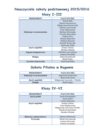 Nauczyciele szkoły podstawowej 2015/2016 klasy I-III PRZEDMIOT Edukacja wczesnoszkolna Język angielski Zajęcia komputerowe Religia Asystent nauczyciela NAUCZYCIEL Dorota Bok Żaneta Gawinowicz Małgorzata Hryniewicka Jolanta Lenczewska Irena Maksymiuk Barbara Miezianko Urszula Moczulska Izabela Pęza Renata Rajewska Elżbieta Rojecka Kamila Waszczuk Agnieszka Zajko Joanna Chmur Monika Misijuk Elżbieta Leszczyńska Joanna Zawadzka Edyta Kondraciuk Rafał Popko Julita Kamińska Szkoła Filialna w Rogowie PRZEDMIOT Edukacja wczesnoszkolna Język angielski Religia NAUCZYCIEL Agnieszka Krajewska Beata Ostrowska Małgorzata Jurczenia - Choćko Rafał Popko Klasy IV-VI PRZEDMIOT Język polski Język angielski Historia i społeczeństwo Przyroda NAUCZYCIEL Aneta Horodeńska Anna Sokół Celina Zubrycka Joanna Chmur Anna Hajduczenia Małgorzata Jurczenia-Choćko Monika Kuchcińska Monika Misijuk Dariusz Bielawski Marta Owczarczuk Justyna Wysocka Joanna Zawadzka Matematyka Zajęcia techniczne Zajęcia komputerowe Muzyka Plastyka Wychowanie fizyczne Religia Izabela Borysewicz Anna Chrapowicz Elżbieta Leszczyńska Katarzyna Leszczyńska Rafał Popko Piotr Smalak Izabela Borysewicz Katarzyna Leszczyńska Beata Cwalin Beata Cwalin Barbara Raczkowska - Bobek Bogusław Bogacewicz Marcin Dudek Jolanta Dworakowska-Dojlida Beata Guziejko Grażyna Kopaczewska Kamila Reduta-Chmielewska Tomasz Perkowski Rafał Popko Ks. Sebastian Sum Nauczyciele gimnazjum - 2015/2016 PRZEDMIOT Język polski Język angielski Język rosyjski Język niemiecki Historia, wiedza o społeczeństwie Biologia Chemia Zajęcia techniczne Geografia Informatyka Matematyka NAUCZYCIEL Chmielewska Emila Filipowicz Aneta Kościelecki Maciej Mikiewicz Małgorzata Hajduczenia Anna Horba Gabriela Jabłońska Maria Paliwoda Agnieszka Szarkowska Agnieszka Kofman Dorota Łuniewska Agnieszka Agnieszka Sławińska Beata Jabłońska Ewa Zalewska Justyna Wysocka Joanna Zawadzka Tomasz Hodun Piotr Smalak Piotr Smalak Beata Gawryluk Barbara Joka Beata Gawryluk Marek Trosko Ewa Bancerek Anna Chrapowicz Katarzyna Proszczuk Mariusz Sawicki Fizyka Wychowanie fizyczne Religia Sztuka (muzyka, plastyka) Zajęcia artystyczne Wychowanie do życia w rodzinie Edukacja medialna Edukacja dla bezpieczeństwa Mariusz Sawicki Marek Trosko Bogusław Bogacewicz Marcin Dudek Jolanta Dworakowska - Dojlida Beata Guziejko Grażyna Kopaczewska Kamila Reduta-Chmielewska Ks. Marek Burnos Tomasz Perkowski Barbara Raczkowska- Bobek Barbara Raczkowska- Bobek Beata Jabłońska Ewa Zalewska Barbara Joka Nauczyciele liceum - 2015/2016 PRZEDMIOT Język polski, wiedza o kulturze Historia, wiedza o społeczeństwie Język angielski Język rosyjski Język niemiecki Geografia Matematyka Religia Wychowanie fizyczne Wychowanie do życia w rodzinie Fotografia NAUCZYCIEL Maciej Andrzej Kościelecki Dariusz Bielawski Agnieszka Szarkowska Dorota Kofman Agnieszka Sławińska Barbara Joka Ewa Bancerek ks. Marek Burnos Marcin Dudek Kamila Reduta Chmielewska Beata Jabłońska Dariusz Bielawski Pedagog szkolny Małgorzata Czulewicz Irena Kraśnicka Psycholog szkolny Ewelina Świrydziuk Biblioteka Walentyna Litwin Irena Słomińska Marzanna Szumkowska Świetlica Elżbieta Fugiel Alicja Gniedziejko Anna Kozłowska Agnieszka Łuniewska Agnieszka Sławińska Agnieszka Tołoczko Logopeda Magdalena Rutkowska Zajęcia socjoterapeutyczne Irena Kraśnicka