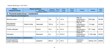 Ostatnia aktualizacja: 16.03.2010r. Nazwa miĊdzynarodowa Nazwa handlowa leki obecnie stosowane w szpitalu WielkoĞü Sym opakowania bol Cena brutto Cena brutto Postaü Dawka Kod ATC A. Przewód pokarmowy i metabolizm A 01 Preparaty stomatologiczne Biborate sodium Aphtin 10 g LP 1,00 zł Hascosept 100 ml LP 10,00 zł Choline salicylate Sachol 10 g LU 5,00 zł Solcoseryl Solcoseryl 5g LU 30,00 zł Alugastrin 250 ml LP 5,00 zł Benzydamine hydrochloride Tantum Verde Płyn do stosowania w jamie ustnej Płyn do stosowania w jamie ustnej ĩel do stosowania w jamie ustnej Pasta do stosowania w jamie ustnej 200 mg/g A01AB 1,5 mg/g A01AB 87,1 mg/g A01AD 2,125 mg/g A01AD 340mg / 5ml A02AB A 02 Leki stosowane w nadkwaĞnoĞci. Dihydroxyaluminii sodium carbonate -8- Zawiesina doustna Gelatum Aluminii Phosphorici 250 g LP 4,00 zł Altramet x 100 LP 11,00 zł Cimetidine x 10 LP 7,00 zł Ranic Ranigast 100 ml LP 3,00 zł Ranitydyna Ranigast 150 x 60 LP 3,00 zł Apo-Famo, Ulfamid Famogast x 60 LP 9,00 zł Aluminium phosphate Zawiesina doustna 45 mg/g A02AB 200 mg A02BA 200mg / 2ml A02BA 0.05g/100ml A02BA 150 mg A02BA 20mg ; 40mg A02BA 20 mg / 5 ml A02BA Leki stosowane w chorobie wrzodowej AntagoniĞci receptora H2 Cimetidine Ranitidine Famotidine Cimegast Quamatel x5 LP -9- 30,00 zł Tabletki powlekane Roztwór do wstrzykiwaĔ 16,00 zł Roztwór do wlewów i.v. Tabletki powlekane Tabletki powlekane Proszek do sporządzenia roztworu do wstrzykiwaĔ i.v. Inhibitory pompy protonowej Esomeprazole Nexium x 10 LP 210,00 zł Pantoprazole Controloc x1 LP 20,00 zł Controloc 20 40 x 28 LP 36,00 zł Omeprazole Losec Helicid x1 LP 19,00 zł Gasec, Polprazol Bioprazol, Helicid x 14 LP 13,00 zł Sucralfate 250 ml LP 11,00 zł 31,00 zł 11,00 zł Proszek do sporządzenia roztworu do wstrzykiwaĔ, infuzji Proszek do sporządzenia roztworu do wstrzykiwaĔ i.v. Tabletki powlekane 40 mg A02BC 40 mg A02BC 40 mg A02BC Liofilizat do sporządzenia roztworu do wlewu i.v. 40 mg A02BC Kapsułki 10mg ; 20mg A02BC Zawiesina doustna 1 g / 5 ml A02BX Inne Sucralfate Ulgastran - 10 - Leki p/wzdĊciom Dimethicone Esputicon Esputicon A 03 Spazmolityki,leki przeciwcholinergiczne Atropinum Atropine sulphate sulfuricum Belladonna alkaloids Bellapan 5g x 100 LU 11,00 zł LU 12,00 zł x 10 LP 9,00 zł x 20 LP 2,00 zł Trimebutine Debridat 250 ml LP 15,00 zł Debridat x 30 LP 20,00 zł NO-SPA x5 LP 3,00 zł NO-SPA Papaverinum hydrochloricum x 20 LP 5,00 zł x 10 LP 8,00 zł x 10 LP 21,00 zł Drotaverine hydrochloride Papaverine hydrochloride Fenpiverinium bromide+Metamizole sodium+Pitofenone hydrochloride Espumisan Spasmalgon - 11 - 10,00 zł Krople doustne Kapsułki 20mg/kroplĊ 50 mg Roztwór do wstrzykiwaĔ Tabletki Granulat do sporządzenia zawiesiny doustnej Tabletki 0,5 mg / ml; 1 mg / ml 0.25 mg Roztwór do wstrzykiwaĔ Tabletki Roztwór do wstrzykiwaĔ Roztwór do wstrzykiwaĔ A02DA A02DA A03BA A03BA 24 mg / 5 ml A03AA 100 mg A03AA 40 mg / 2 ml A03AD 40 mg A03AD 40 mg / 2 ml G04BE (0,02+500+2) mg / ml A03DA Oxyphenonium bromide Spasmophen x 30 LP 6,00 zł 7,00 zł Tabletki powlekane 5mg ; 10mg A03AB Gastronax x 30 LP 8,00 zł 12,00 zł Tabletki 5mg ; 10mg A03FA Metoclopramidum 0.5% x5 LP 3,00 zł Roztwór do wstrzykiwaĔ 10 mg / 2 ml A03FA Metoclopramidum x 50 LP 1,00 zł Tabletki 10 mg A03FA Atossa x5 LR 39,00 zł Tabletki powlekane 4 mg ; 8 mg A04AA Diphergan x 10 LP 9,00 zł Roztwór do wstrzykiwaĔ 50 mg / 2 ml A04AD Diphergan x 20 LP 3,00 zł DraĪetki 10mg; 25mg A04AD Diphergan 150 ml LP 6,00 zł Syrop 5 mg / 5 ml A04AD Leki pobudzające perystaltykĊ Cisapride Gasprid Metoclopramide hydrochloride A 04 Leki przeciwwymiotne i zapobiegające nudnoĞciom Ondansetron Promethazine hydrochloride Setronon - 12 - 45,00 zł 5,00 zł Chlorpromazine hydrohloride Fenactil 10 g LP 3,00 zł Krople 40 mg / g A04AD Thiethylperazine malate Torecan x 60 LP 8,00 zł Czopki doodbytnicze 6,5 mg A04AD Arginina x 60 LU 27,00 zł Kapsułki 500 mg A05BA Esseliv x 50 LP 25,00 zł Kapsułki 300 mg A05BA Hepa-Merz x 10 LR 261,00 zł Roztwór do wlewów i.v. 5 g / 10 ml A05BA Hepatil x 10 LP 42,00 zł Roztwór do wlewów i.v. 500mg / 5 ml A05BA Hepatil x 40 LP 9,00 zł Tabletki 150 mg A05BA Silymarin Sylimarol x 60 LP 5,00 zł DraĪetki 35mg ; 70mg A05BA A 06 Leki przeczyszczające Preparat złoĪony Alax x 20 LP 4,00 zł - A06AB Bisacodyl Bisacodyl x5 LP 3,00 zł 10 mg A06AB A 05 Leki stosowane w chorobach wątroby i dróg Īółciowych Arginine hydrochloride Phospholipids Essentiale forte Ornithine aspartate - 13 - 5,00 zł DraĪetki Czopki doodbytnicze Glycerol Bisacodyl x 30 LP 4,00 zł Czopki Glicerynowe x 10 LP 4,00 zł Tabletki powlekane Czopki doodbytnicze 5 mg A06AB 1,4 g A06AG Lactulol Lactulosum Lactulose MIP 500 ml LP 19,00 zł Syrop 2,5 g / 5 ml A06AD Sodium dihydrophosphate Enema Rectanal 150 ml LP 4,00 zł Płyn - A06AG A 07 Leki przeciwbiegunkowe, przeciwzakaĨne, przeciwzapalne stosowane w chorobach przewodu pokarmowego Activated charcoal Carbo medicinalis x 20 LP 4,00 zł Tabletki 300 mg A07BA Preparat złoĪony Gastrolit x 15 LU 6,00 zł 4,15 g A07CA Nifuroxazide Nifuroksazyd x 24 LP 5,00 zł 100 mg A07AX Nifuroksazyd 90 ml LP 8,00 zł Saszetki Tabletki powlekane Zawiesina doustna Nystatyna x 16 LR 6,00 zł Nystatin - 14 - DraĪetki 220mg / 5 ml A07AX 500 000 j.m. A07AA Sulfasalazine Nystatyna 24 ml LP 5,00 zł Sulfasalazin EN x 50 LP 33,00 zł Granulat do sporządzenia zawiesiny doustnej Tabletki powlekane 2 400 000 j.m. /5g A07AA 500 mg A07AB - A07FA - A07FA Leki hamujące perystaltykĊ, przywracające prawidłowa florĊ bakteryjną Lactobacillus rhamnosus Liofilizat do sporządzenia zawiesiny doustnej Liofilizat do sporządzenia zawiesiny doustnej Lakcid forte x 10 LU 11,00 zł Lakcid x 10 LU 6,00 zł Loperamide hydrochloride Loperamid x 30 LP 5,00 zł Tabletki 2 mg A07DA Smecta Smecta x 30 LU 27,00 zł Saszetki 3g A07XA Preparat złoĪony Trilac x 20 LR 12,00 zł Kapsułki - 15 - A07FA A 09 Leki poprawiające trawienie Pancreatin N