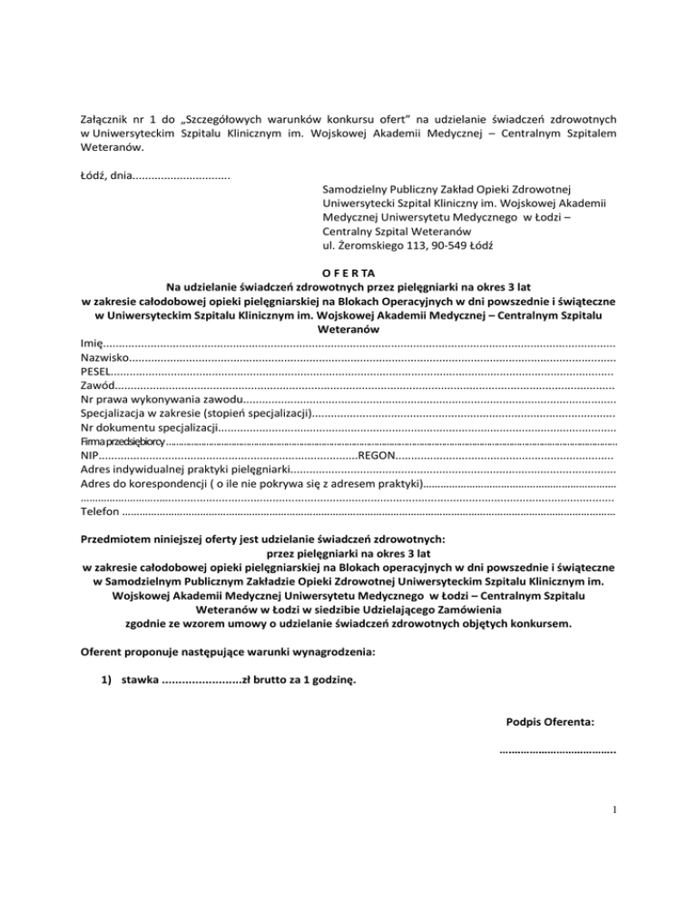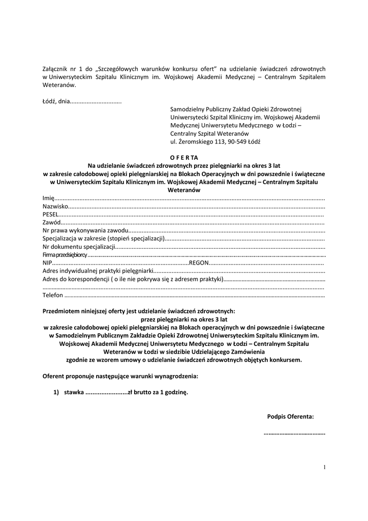 Załącznik nr 1 do „Szczegółowych warunków konkursu ofert” na udzielanie świadczeń zdrowotnych w Uniwersyteckim Szpitalu Klinicznym im. Wojskowej Akademii Medycznej – Centralnym Szpitalem Weteranów. Łódź, dnia............................... Samodzielny Publiczny Zakład Opieki Zdrowotnej Uniwersytecki Szpital Kliniczny im. Wojskowej Akademii Medycznej Uniwersytetu Medycznego w Łodzi – Centralny Szpital Weteranów ul. Żeromskiego 113, 90-549 Łódź O F E R TA Na udzielanie świadczeń zdrowotnych przez pielęgniarki na okres 3 lat w zakresie całodobowej opieki pielęgniarskiej na Blokach Operacyjnych w dni powszednie i świąteczne w Uniwersyteckim Szpitalu Klinicznym im. Wojskowej Akademii Medycznej – Centralnym Szpitalu Weteranów Imię.................................................................................................................................................................. Nazwisko.......................................................................................................................................................... PESEL............................................................................................................................................................... Zawód.............................................................................................................................................................. Nr prawa wykonywania zawodu...................................................................................................................... Specjalizacja w zakresie (stopień specjalizacji)................................................................................................ Nr dokumentu specjalizacji.............................................................................................................................. Firma przedsiębiorcy ……………………………………………………………………………………………………………………………………………………………… NIP..................................................................................REGON..................................................................... Adres indywidualnej praktyki pielęgniarki....................................................................................................... Adres do korespondencji ( o ile nie pokrywa się z adresem praktyki)……………………………………………………….… …………….………..…............................................................................................................................................. Telefon ……………………………………………………………………………………………………………………………………………………… Przedmiotem niniejszej oferty jest udzielanie świadczeń zdrowotnych: przez pielęgniarki na okres 3 lat w zakresie całodobowej opieki pielęgniarskiej na Blokach operacyjnych w dni powszednie i świąteczne w Samodzielnym Publicznym Zakładzie Opieki Zdrowotnej Uniwersyteckim Szpitalu Klinicznym im. Wojskowej Akademii Medycznej Uniwersytetu Medycznego w Łodzi – Centralnym Szpitalu Weteranów w Łodzi w siedzibie Udzielającego Zamówienia zgodnie ze wzorem umowy o udzielanie świadczeń zdrowotnych objętych konkursem. Oferent proponuje następujące warunki wynagrodzenia: 1) stawka ........................zł brutto za 1 godzinę. Podpis Oferenta: ….…………………………….. 1 OFERENT OŚWIADCZA, IŻ: 1. zapoznał się z treścią ogłoszenia o konkursie, „Szczegółowymi warunkami konkursu ofert” i nie wnosi do nich zastrzeżeń. 2. zapoznał się z warunkami umowy określonymi w załączniku nr 2 do „Szczegółowych warunków konkursu ofert” i akceptuje je bez zastrzeżeń oraz zobowiązuje się w przypadku wyboru jego oferty do zawarcia umowy w miejscu i terminie wyznaczonym przez Udzielającego Zamówienia. W przypadku uchylania się od podpisania przez wybranego Oferenta umowy, w terminie wyznaczonym przez Udzielającego Zamówienia, może to stanowić podstawę do wykluczenia od udzielania przez niego świadczeń zdrowotnych na rzecz Udzielającego zamówienie. 3. uważa się związany ofertą przez okres 30 dni od upływu terminu składania ofert. 4. wszystkie załączone dokumenty lub kserokopie są zgodne z aktualnym stanem faktycznym i prawnym. Stan prawny określony w dokumentach nie uległ zmianie na dzień złożenia oferty. 5. zapoznał się z Regulaminem Przeprowadzania Konkursu obowiązującym u Udzielającego Zamówienie. 6. świadczenia zdrowotne objęte konkursem wykonywać będzie w siedzibie Udzielającego zamówienia, w pomieszczeniach udostępnionych Przyjmującemu zamówienie na warunkach określonych przez Udzielającego zamówienia oraz przy użyciu sprzętu należącego do Udzielającego Zamówienia. 7. prowadzi Indywidualną Praktykę zarejestrowaną w rejestrze indywidualnych praktyk ……………………zgodnie z danymi wymienionym na wstępie niniejszej oferty. 8. świadczeń zdrowotnych udzielać będzie osobiście. 9. posiada aktualne ubezpieczenie od odpowiedzialności cywilnej (OC) na minimalną kwotę gwarantowaną w wysokości …………………………. zgodnie z Rozporządzeniem Ministra Finansów z dnia 22.12.2011 w sprawie obowiązkowego ubezpieczenia odpowiedzialności cywilnej podmiotu wykonującego działalności leczniczą (Dz. U. Nr 293, poz. 1729) (Zobowiązuje się do przedłożenia kopii polisy OC na równowartość …………………… na dzień podpisania umowy.) Podpis Oferenta: ..…………………………….. 2 Załącznik Nr 1 do formularza ofertowego ZAŁĄCZNIKI – odpowiednio dla OFERENTA**: 1. oryginały lub poświadczone kopie dokumentów potwierdzających kwalifikacje zawodowe i uprawnienia do wykonywania zawodu pielęgniarki, w szczególności: 1) Prawo wykonywania zawod