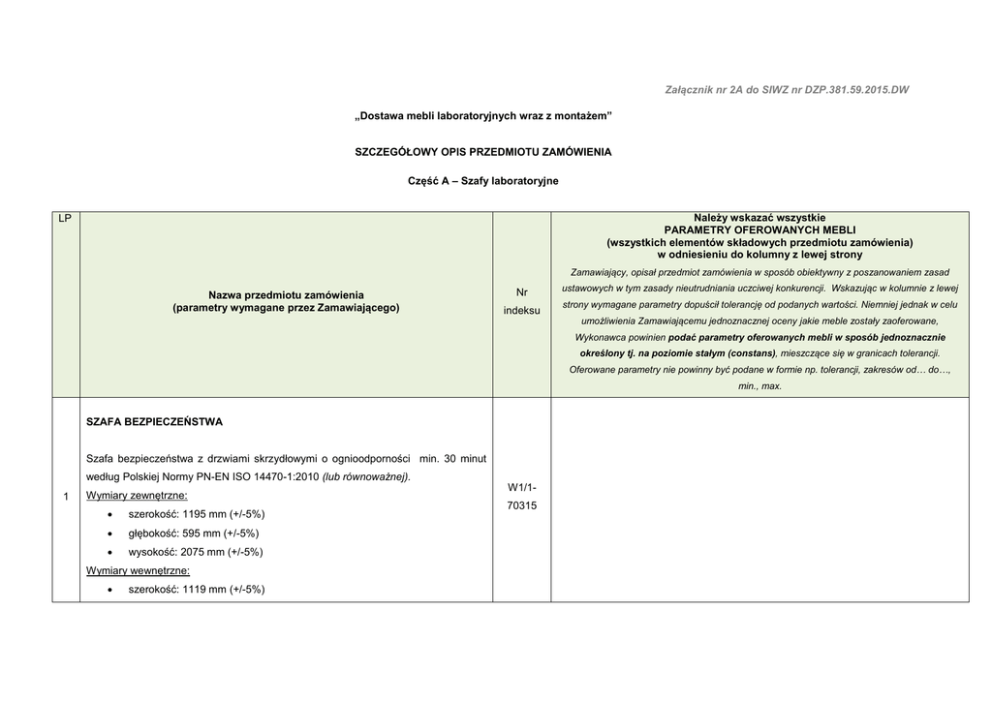 Załącznik nr 2A do SIWZ nr DZP.381.59.2015.DW „Dostawa mebli laboratoryjnych wraz z montażem” SZCZEGÓŁOWY OPIS PRZEDMIOTU ZAMÓWIENIA Część A – Szafy laboratoryjne Należy wskazać wszystkie PARAMETRY OFEROWANYCH MEBLI (wszystkich elementów składowych przedmiotu zamówienia) w odniesieniu do kolumny z lewej strony LP Zamawiający, opisał przedmiot zamówienia w sposób obiektywny z poszanowaniem zasad Nazwa przedmiotu zamówienia (parametry wymagane przez Zamawiającego) Nr indeksu ustawowych w tym zasady nieutrudniania uczciwej konkurencji. Wskazując w kolumnie z lewej strony wymagane parametry dopuścił tolerancję od podanych wartości. Niemniej jednak w celu umożliwienia Zamawiającemu jednoznacznej oceny jakie meble zostały zaoferowane, Wykonawca powinien podać parametry oferowanych mebli w sposób jednoznacznie określony tj. na poziomie stałym (constans), mieszczące się w granicach tolerancji. Oferowane parametry nie powinny być podane w formie np. tolerancji, zakresów od… do…, min., max. SZAFA BEZPIECZEŃSTWA Szafa bezpieczeństwa z drzwiami skrzydłowymi o ognioodporności min. 30 minut według Polskiej Normy PN-EN ISO 14470-1:2010 (lub równoważnej). 1 Wymiary zewnętrzne: szerokość: 1195 mm (+/-5%) głębokość: 595 mm (+/-5%) wysokość: 2075 mm (+/-5%) Wymiary wewnętrzne: szerokość: 1119 mm (+/-5%) W1/170315 głębokość: 470 mm(+/-5%) wysokość: 1600 mm (+/-5%) Wyposażenie: nóżki z możliwością regulacji poziomu, 3 półki zamontowane na stałe, 1 wanna wychwytowa, 1 pokrywa na wannę zbiorczą . Obudowa i drzwi wykonane z materiałów niepalnych w kolorze RAL 7035 (lub równoważny) malowane lakierem mikroperłowym. Drzwi mają posiadać pneumatyczne wspomaganie, nie wymagające zasilania, co ułatwia otwieranie i zamykanie. Standardowo mają zawierać system utrzymania skrzydeł drzwi w pozycji otwartej, dzięki czemu można wkładać i wyjmować pojemniki z szafy obiema rękami. Mebel ma posiadać mechanizm kontroli temperatury gwarantujący automatyczne zamknięcie i uszczelnienie drzwi w wypadku pożaru. Waga szafy: nie więcej niż 280 kg WENTYLATOR DO SZAF Panel wentylacyjny dachowy 1-wentylatorowy z termostatem montowany w płycie 2 górnej szafy. W1/2- Wyposażony w 1 wentylator i termostat, wyłącznik oraz zabezpieczenie 70315 antyprzepięciowe. Wentylatory należy zamontować do dwóch szaf bezpieczeństwa tj. na każdej szafie po 1 szt. 3 Szafa na odczynniki chemiczne W1/3- Wymiary zewnętrzne 70315 wysokość:1950mm(+/-5%) szerokość:1200mm(+/-5%) głębokość:500 mm (+/-5%) Wymiary wewnętrzne wysokość:1844mm(+/-5%) szerokość:1112mm(+/-5%) głębokość:467 mm (+/-5%) Wyposażenie szafy: 4 półki w kształcie wanien, 2 drzwi, półki w kształcie wanienki z możliwością przeniesienia w zakresie 25mm, drzwi z centralnym zamkiem cylindrycznym oraz otworami wentylacyjnymi. Wymagania : Szafa wykonana z blachy stalowej o grubości min. 1 mm. Korpus szafy zewnętrzny blacha stalowa malowana kolorem RAL 7035 (lub równoważny) Pojedyncze ściany szafy -kolor jasnoszary - każda z półek w kształcie wanienki zbiorczej o pojemności min. 20 litrów . Możliwość podłączenia do instalacji wentylacyjnej za pomocą króćca o średnicy 75 mm na dachu szafy. Waga szafy: nie więcej niż 100 kg .................................................... data i podpis osoby upoważnionej do reprezentowania Wykonawc Część B – Stoły laboratoryjne Należy wskazać wszystkie PARAMETRY OFEROWANYCH MEBLI (wszystkich elementów składowych przedmiotu zamówienia) w odniesieniu do kolumny z lewej strony LP Zamawiający, opisał przedmiot zamówienia w sposób obiektywny z poszanowaniem zasad Nazwa przedmiotu zamówienia (parametry wymagane przez Zamawiającego) Nr indeksu ustawowych w tym zasady nieutrudniania uczciwej konkurencji. Wskazując w kolumnie z lewej strony wymagane parametry dopuścił tolerancję od podanych wartości. Niemniej jednak w celu umożliwienia Zamawiającemu jednoznacznej oceny jakie meble zostały zaoferowane, Wykonawca powinien podać parametry oferowanych mebli w sposób jednoznacznie określony tj. na poziomie stałym (constans), mieszczące się w granicach tolerancji. Oferowane parametry nie powinny być podane w formie np. tolerancji, zakresów od… do…, min., max. 1 W1/1Stół aparaturowy przyścienny Wymiary: długość:1500mm (+/-5%) szerokość:.800mm(+/-5%) wysokość:700mm (+/-5%) Wymagania : Blat stołu typu postforming o grubości: min. 30 mm, na stelażach wzmacnianych typu A o profilach min. 40mm x 40mm, z nóżkami wykręcanymi umożliwiającymi poziomowanie stołu, na środku (pod spodem) stołu zamocowany wspornik zapobiegający uginaniu blatu. Kolor stelaży szary, malowany proszkowo farbą poliestrowo-epoksydową Przy stołach z prawej strony należy zamontować na stałe po jednej szafce . Stół wyposażony w: 2 szafki z 3 szufladami kolor - szary, przy każdej szafce zamontowany zamek patentowy- centralny. 71028 Wymiary szafek: głębokość: 720 mm(+/-5%) szerokość: 600 mm(+/-5%) grubość płyty laminowanej min . 18 mm. Kolor do ustalenia z Zamawiającym po zawarciu umowy. Wykonawca przedstawi Zamawiającemu paletę co najmniej ośmiu kolorów blatu w tym dwa odcienie szarego. .................................................... data i podpis osoby upoważnionej do reprezentowania Wykonawcy
