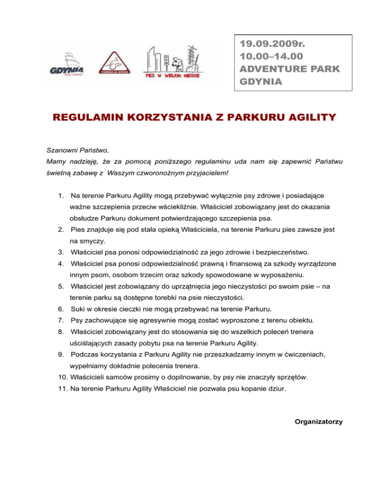 19.09.2009r. 10.00–14.00 ADVENTURE PARK GDYNIA REGULAMIN KORZYSTANIA Z PARKURU AGILITY Szanowni Państwo, Mamy nadzieję, że za pomocą poniższego regulaminu uda nam się zapewnić Państwu świetną zabawę z Waszym czworonożnym przyjacielem! 1. Na terenie Parkuru Agility mogą przebywać wyłącznie psy zdrowe i posiadające ważne szczepienia przeciw wściekliźnie. Właściciel zobowiązany jest do okazania obsłudze Parkuru dokument potwierdzającego szczepienia psa. 2. Pies znajduje się pod stała opieką Właściciela, na terenie Parkuru pies zawsze jest na smyczy. 3. Właściciel psa ponosi odpowiedzialność za jego zdrowie i bezpieczeństwo. 4. Właściciel psa ponosi odpowiedzialność prawną i finansową za szkody wyrządzone innym psom, osobom trzecim oraz szkody spowodowane w wyposażeniu. 5. Właściciel jest zobowiązany do uprzątnięcia jego nieczystości po swoim psie – na terenie parku są dostępne torebki na psie nieczystości. 6. Suki w okresie cieczki nie mogą przebywać na terenie Parkuru. 7. Psy zachowujące się agresywnie mogą zostać wyproszone z terenu obiektu. 8. Właściciel zobowiązany jest do stosowania się do wszelkich poleceń trenera uściślających zasady pobytu psa na terenie Parkuru Agility. 9. Podczas korzystania z Parkuru Agility nie przeszkadzamy innym w ćwiczeniach, wypełniamy dokładnie polecenia trenera. 10. Właścicieli samców prosimy o dopilnowanie, by psy nie znaczyły sprzętów. 11. Na terenie Parkuru Agility Właściciel nie pozwala psu kopanie dziur. Organizatorzy