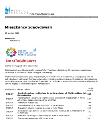 Portal Miasta Miasta Czeladź http://www.czeladz.pl/aktualnosci/index/Mieszkancy-zdecydowali/idn:447/printpdf Mieszkańcy zdecydowali 30 grudnia 2016 kategoria: Aktualności Grafika promująca Budżet Obywatelski Zakończyła się weryfikacja głosów mieszkańców. Trzecia edycja Budżetu Obywatelskiego zaskoczyła rekordową, w porównaniu do lat ubiegłych, frekwencją. W głosowaniu wzięło udział 1922 mieszkańców, oddano 1910 ważnych głosów, z czego prawie 73% za pośrednictwem platformy informacyjno-konsultacyjnej obywatelski.czeladz.pl. Czeladzianie zdecydowali, że ze środków przeznaczonych na Budżet Obywatelski w 2017 roku powstanie Grodzisko zabaw – od juniora do seniora między ul. Pieńkowskiego i ul. Kombatantów. Kod projektu Nazwa zadania Liczba głosów 8/BO/17 Grodzisko zabaw – od juniora do seniora między ul. Pieńkowskiego i ul. 562 Kombatantów 4/BO/17 Remont alejek i stworzenie stref integracji społecznych mieszkańców w Parku Alfred (plac zabaw, siłownia, strefa WorkOut) 537 5/BO/17 Remont ul. Harcerskiej 190 1/BO/17 Nowe chodniki na ul. Wyspiańskiego i ul. Orzeszkowej 169 7/BO/17 Trasa (tor) rolkowo-rowerow-biegowa w Parku Alfred 123 2/BO/17 Zwiększenie bezpieczeństwa poprzez montaż punktów świetlnych od ul. Przełajskiej do ul. Rolniczej 121 3/BO/17 Kompleks rekreacyjno-szkoleniowy dla psów w Parku Jordan 114 6/BO/17 Rowerowa trasa górska MTB na Borzesze 94