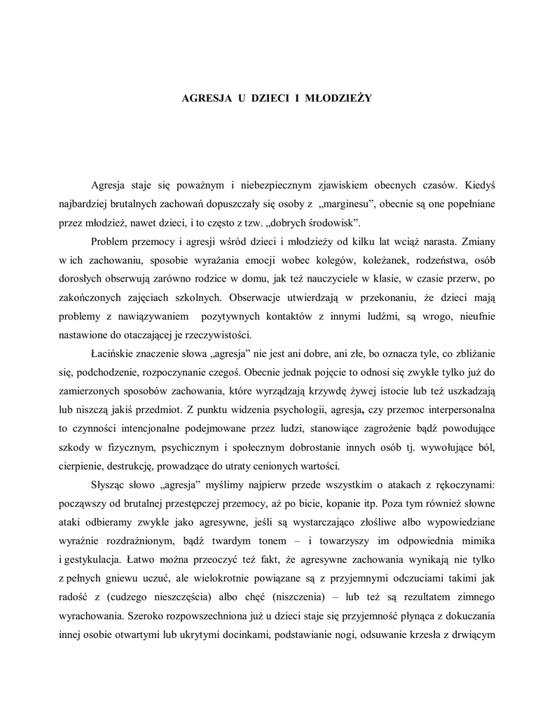 AGRESJA U DZIECI I MŁODZIEŻY Agresja staje się poważnym i niebezpiecznym zjawiskiem obecnych czasów. Kiedyś najbardziej brutalnych zachowań dopuszczały się osoby z „marginesu”, obecnie są one popełniane przez młodzież, nawet dzieci, i to często z tzw. „dobrych środowisk”. Problem przemocy i agresji wśród dzieci i młodzieży od kilku lat wciąż narasta. Zmiany w ich zachowaniu, sposobie wyrażania emocji wobec kolegów, koleżanek, rodzeństwa, osób dorosłych obserwują zarówno rodzice w domu, jak też nauczyciele w klasie, w czasie przerw, po zakończonych zajęciach szkolnych. Obserwacje utwierdzają w przekonaniu, że dzieci mają problemy z nawiązywaniem pozytywnych kontaktów z innymi ludźmi, są wrogo, nieufnie nastawione do otaczającej je rzeczywistości. Łacińskie znaczenie słowa „agresja” nie jest ani dobre, ani złe, bo oznacza tyle, co zbliżanie się, podchodzenie, rozpoczynanie czegoś. Obecnie jednak pojęcie to odnosi się zwykle tylko już do zamierzonych sposobów zachowania, które wyrządzają krzywdę żywej istocie lub też uszkadzają lub niszczą jakiś przedmiot. Z punktu widzenia psychologii, agresja, czy przemoc interpersonalna to czynności intencjonalne podejmowane przez ludzi, stanowiące zagrożenie bądź powodujące szkody w fizycznym, psychicznym i społecznym dobrostanie innych osób tj. wywołujące ból, cierpienie, destrukcję, prowadzące do utraty cenionych wartości. Słysząc słowo „agresja” myślimy najpierw przede wszystkim o atakach z rękoczynami: począwszy od brutalnej przestępczej przemocy, aż po bicie, kopanie itp. Poza tym również słowne ataki odbieramy zwykle jako agresywne, jeśli są wystarczająco złośliwe albo wypowiedziane wyraźnie rozdrażnionym, bądź twardym tonem – i towarzyszy im odpowiednia mimika i gestykulacja. Łatwo można przeoczyć też fakt, że agresywne zachowania wynikają nie tylko z pełnych gniewu uczuć, ale wielokrotnie powiązane są z przyjemnymi odczuciami takimi jak radość z (cudzego nieszczęścia) albo chęć (niszczenia) – lub też są rezultatem zimnego wyrachowania. Szeroko rozpowszechniona już u dzieci staje się przyjemność płynąca z dokuczania innej osobie otwartymi lub ukrytymi docinkami, podstawianie nogi, odsuwanie krzesła z drwiącym uśmiechem, odbieranie zabawek, aż po kradzież i oszustwa. Wszystkie te przykłady opisują sytuacje, których skutkiem jest wyrządzenie szkody. Ale o agresji można mówić również wtedy, gdy człowiek jest zupełnie pasywny, nic nie mówi, ma znudzony, albo niemiły wyraz twarzy. Przykładem będzie tu bezustanne ignorowanie życzeń i próśb innych ludzi stające się „pasywnym sprzeciwem”, który stanowi szczególny rodzaj agresji: druga osoba doprowadzona jest do wściekłości, podczas gdy własne złe zamiary można ukryć pod niewinną naiwnością. Jeszcze innym wariantem agresji jest autoagresja, mająca przede wszystkim myślowy charakter. W tym przypadku myśli o wyrządzaniu krzywdy skierowane są do własnej osoby (np. wyrzuty, depresje), a to myślowe zachowanie najczęściej tak długo niemożliwe jest do zaobserwowania, aż znajdzie ono wyraz w krzywdzie wyrządzonej sobie samemu, albo kompletnemu zniszczeniu. Aby rozpoznać ukrytą agresję, nie można skupić się jedynie na osobach, u których jest ona widoczna. Również sympatyczne i spokojne osoby mogą być w niektórych sytuacjach naładowane agresywnie. Naukowcy starają się znaleźć odpowiedź na pytania: „Dlaczego tak wielu ludzi jest „złych”, i gdzie tkwią przyczyny agresji?” Szereg z nich wierzy w tzw. „pęd ku agresji” będący skutkiem złych uwarunkowań genetycznych, który ostatecznie ma być odpowiedzialny za całe zło na świecie. Kto przekonany jest o takim charakterze agresywnych zachowań, ten postrzega np.: przejawiającą się u dzieci agresję jako niemożliwą do zmiany. Liczne badania naukowe zaprzeczają temu poglądowi i wysuwają wniosek, że przyczyn agresji musimy szukać w otoczeniu. Otoczenie jako „szkoła życia” oferuje człowiekowi niezliczone możliwości nauczenia się agresji. Gotowość do agresywnego reagowania powstanie przede wszystkim w wyniku frustracji. Im lepiej człowiek nauczy się znosić rozczarowania (tolerancja na frustracje) , tym mniejsze jest ryzyko, że frustracje siłą rzeczy pociągną za sobą agresję. Ważnym procesem nauki przy opanowywaniu agresywnych wzorców zachowania jest nauka z obserwacji albo na modelu. Szczególnie u dzieci w wieku przedszkolnym można wyraźnie zobaczyć, jak z wielką radością naśladują zachowanie swoich wzorców - czy to dorosłych, czy innych dzieci. Im młodsze dziecko, tym bardziej widoczny jest kształtujący je wpływ rodziców. Styl rozwiązywania problemów i konfliktów jakim posługują się dorośli na płaszczyźnie rodzinnej, szkolnej, lokalnej staje się punktem odniesienia do modyfikowania i tworzenia wzorców zachowań w sytuacjach zadaniowych i konfliktowych. Ale również bajki, opowiadania, filmy, programy telewizyjne, gry komputerowe pełnią role wzorców. Badania wykazują, że pełne przemocy filmy, gry komputerowe, w ogromnej mierze odpowiedzialne są za agresję w naszym społeczeństwie. Efektem zwiększającej się konsumpcji pełnych przemocy scen jest przyzwyczajenie, otępienie, „znieczulica” na tragedie ludzkie, przemoc, czy nawet śmierć. Dzieci czy młodzież żyjąca w tzw. „klimacie agresji” może uważać swoje zachowania za nieodbiegające od normy i nie odczuwać psychicznego dyskomfortu z racji tychże zachowań. Toteż powszechnym zjawiskiem stosowania przemocy wśród dzieci i młodzieży są tzw. bezpośrednie akty przemocy tj.: dokuczanie, przezywanie, wyszydzanie, zabieranie pieniędzy, przedmiotów, niszczenie rzeczy. Istnieją też bardziej zakamuflowane formy przemocy, częściej stosowane przez dziewczęta niż chłopców, do których należą intrygi, o