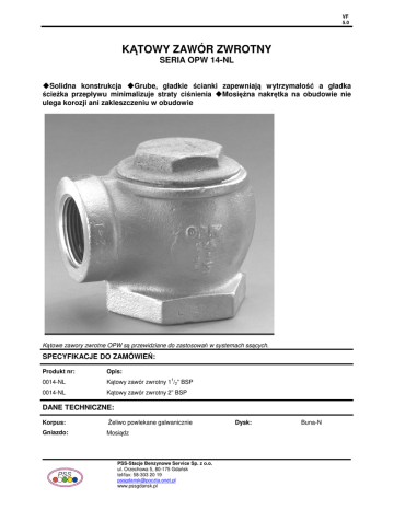 VF 5.0 KĄTOWY ZAWÓR ZWROTNY SERIA OPW 14-NL Solidna konstrukcja Grube, gładkie ścianki zapewniają wytrzymałość a gładka ścieżka przepływu minimalizuje straty ciśnienia Mosiężna nakrętka na obudowie nie ulega korozji ani zakleszczeniu w obudowie Kątowe zawory zwrotne OPW są przewidziane do zastosowań w systemach ssących. SPECYFIKACJE DO ZAMÓWIEŃ: Produkt nr: Opis: 0014-NL Kątowy zawór zwrotny 1 /2” BSP 0014-NL Kątowy zawór zwrotny 2” BSP 1 DANE TECHNICZNE: Korpus: Żeliwo powlekane galwanicznie Gniazdo: Mosiądz PSS-Stacje Benzynowe Service Sp. z o.o. ul. Orzechowa 5, 80-175 Gdańsk tel/fax: 58-303 20 19 [email protected] www.pssgdansk.pl Dysk: Buna-N VF 6.0 KĄTOWY ZAWÓR ZWROTNY SERIA OPW 14-NL 1 Zwór posiada sprężynę otwierającą go przy ciśnieniu 0.1 bara dla 14-NL 1 /2” i 0.05 bara dla 14-NL 2”. o Temperatura maksymalna 105 C WYMIARY: A B 14-NL 1.1/2” cale 1 4. /5” 1 4. /5” Mm 107 116 CZĘŚCI ZAMIENNE 14-NL 1.1/2”: Część nr: Opis: 1. H-00499-MS Gniazdo wkręcane 2. H-00489-M Sprężyna 3. H-00083-I Głowica korpusu 4. H-03363-M Podzespoły grzybka zawierającego 5. H-00045-M Grzybek zawierający 6. H-03297-RB Wrzeciono grzybka CZĘŚCI ZAMIENNE 14-NL 2”: Część nr: Opis: 1. H-00770-B Gniazdo wkręcane 2. H-00194-M Sprężyna 3. H-00295-MS Głowica korpusu 4. H-03364-M Podzespoły grzybka zawierającego 5. H-03301- Grzybek zawierający 6. H-03297-RB Wrzeciono grzybka PSS-Stacje Benzynowe Service Sp. z o.o. ul. Orzechowa 5, 80-175 Gdańsk tel/fax: 58-303 20 19 [email protected] www.pssgdansk.pl 14-NL 2” cale 9 4. /10” 4 5. /5” mm 124 148