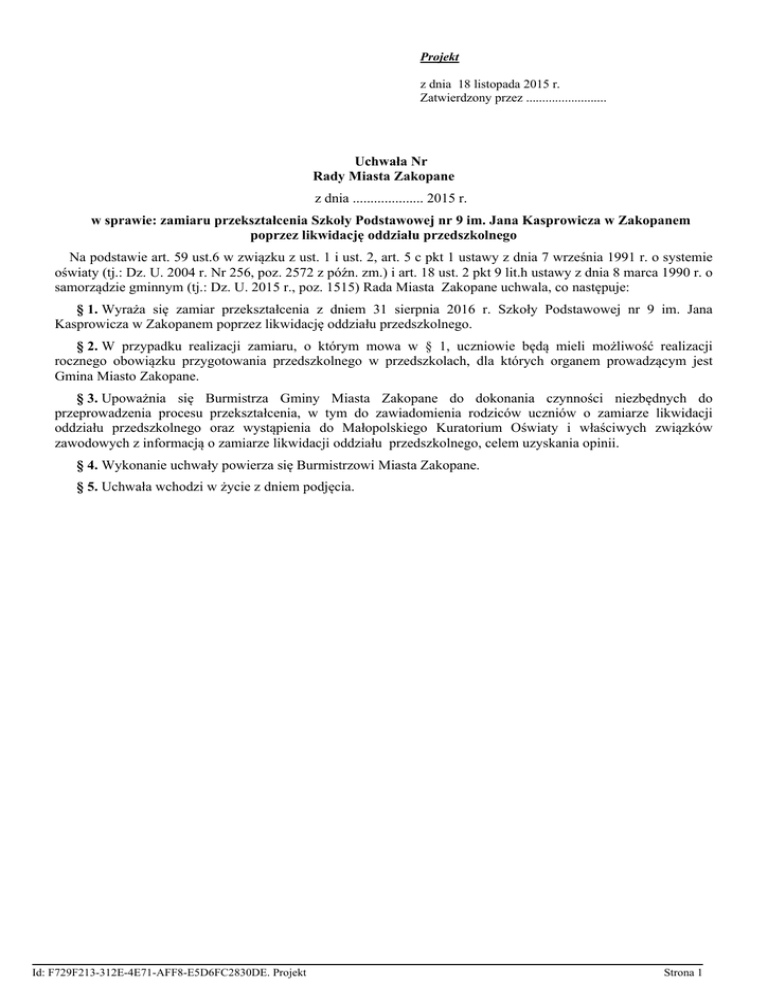 Projekt z dnia 18 listopada 2015 r. Zatwierdzony przez ......................... Uchwała Nr Rady Miasta Zakopane z dnia .................... 2015 r. w sprawie: zamiaru przekształcenia Szkoły Podstawowej nr 9 im. Jana Kasprowicza w Zakopanem poprzez likwidację oddziału przedszkolnego Na podstawie art. 59 ust.6 w związku z ust. 1 i ust. 2, art. 5 c pkt 1 ustawy z dnia 7 września 1991 r. o systemie oświaty (tj.: Dz. U. 2004 r. Nr 256, poz. 2572 z późn. zm.) i art. 18 ust. 2 pkt 9 lit.h ustawy z dnia 8 marca 1990 r. o samorządzie gminnym (tj.: Dz. U. 2015 r., poz. 1515) Rada Miasta Zakopane uchwala, co następuje: § 1. Wyraża się zamiar przekształcenia z dniem 31 sierpnia 2016 r. Szkoły Podstawowej nr 9 im. Jana Kasprowicza w Zakopanem poprzez likwidację oddziału przedszkolnego. § 2. W przypadku realizacji zamiaru, o którym mowa w § 1, uczniowie będą mieli możliwość realizacji rocznego obowiązku przygotowania przedszkolnego w przedszkolach, dla których organem prowadzącym jest Gmina Miasto Zakopane. § 3. Upoważnia się Burmistrza Gminy Miasta Zakopane do dokonania czynności niezbędnych do przeprowadzenia procesu przekształcenia, w tym do zawiadomienia rodziców uczniów o zamiarze likwidacji oddziału przedszkolnego oraz wystąpienia do Małopolskiego Kuratorium Oświaty i właściwych związków zawodowych z informacją o zamiarze likwidacji oddziału przedszkolnego, celem uzyskania opinii. § 4. Wykonanie uchwały powierza się Burmistrzowi Miasta Zakopane. § 5. Uchwała wchodzi w życie z dniem podjęcia. Id: F729F213-312E-4E71-AFF8-E5D6FC2830DE. Projekt Strona 1 UZASADNIENIE Uchwała w sprawie zamiaru przekształcenia Szkoły Podstawowej Nr 9 im. Jana Kasprowicza w Zakopanem poprzez likwidację oddziału przedszkolnego wynika ze zmian ustawy o systemie oświaty, gdzie doprecyzowano zapis o strukturze szkoły podstawowej, według którego w szkołach podstawowych mogą istnieć tylko klasy I-VI. Jeżeli przy szkole funkcjonuje oddział przedszkolny i/lub przedszkole, to placówki te od 1 września 2016 roku muszą być połączone w zespół. Zmiany te zapisano w art. 61 i 62 ustawy o systemie oświaty (Dz. U. z 2004 r. Nr 256 poz. 2572 z późn. zm.): „Art. 61.1 Struktura organizacyjna szkoły podstawowej obejmuje klasy I-VI. Art. 62.1 Organ prowadzący szkoły różnych typów lub placówki może je połączyć w zespół. Połączenie nie narusza odrębności rad pedagogicznych, rad rodziców, rad szkół lub placówek i samorządów uczniowskich poszczególnych szkół lub placówek, o ile statut zespołu nie stanowi inaczej. 1d. Organ prowadzący może połączyć w zespół prowadzoną przez siebie szkołę podstawową z prowadzonymi przez siebie przedszkolami mającymi siedzibę na obszarze objętym obwodem tej szkoły. 1e. Organ prowadzący może połączyć w zespół prowadzone przez siebie przedszkola mające siedzibę na obszarze objętym obwodem jednej szkoły podstawowej. 2. Dyrektor zespołu jest dyrektorem szkoły lub placówki w rozumieniu ustawy. 3. Utworzenie zespołu następuje w trybie art. 58, z tym że akt założycielski wymaga zaopiniowania przez rady pedagogiczne.” Jak wynika z zapisów ustawy, oddziały przedszkolne w szkołach podstawowych nie mogą być pozostawione w dotychczasowej postaci. Istnieje możliwość przekształcenia ich w zespoły lub utworzenie innych form wychowania przedszkolnego. Jednak ze względu na zapewnienie opieki przedszkolnej mieszkańcom Gminy Miasta Zakopane przez przedszkola oraz planowane utworzenie innych form wychowania przedszkolnego, dla których organem prowadzącym jest Gmina Miasto Zakopane, zasadnym jest podjęcie uchwały. Likwidacja oddziału przedszkolnego nie zmniejszy dostępności do przedszkoli dla dzieci mieszkańców Zakopanego. Id: D36C3919-BCAE-48D4-9EA6-BA51E888917E. Projekt Strona 1