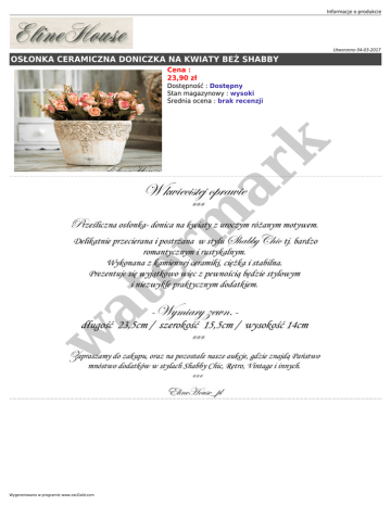 Informacje o produkcie Utworzono 04-03-2017 OSŁONKA CERAMICZNA DONICZKA NA KWIATY BEŻ SHABBY Cena : 23,90 zł w at er m ar k Dostępność : Dostępny Stan magazynowy : wysoki Średnia ocena : brak recenzji Wygenerowano w programie www.oscGold.com