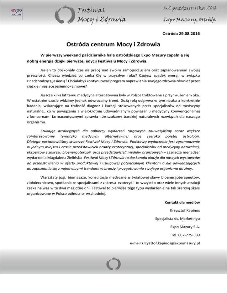 Ostróda 29.08.2016 Ostróda centrum Mocy i Zdrowia W pierwszy weekend października hale ostródzkiego Expo Mazury zapełnią się dobrą energią dzięki pierwszej edycji Festiwalu Mocy i Zdrowia. Jesień to doskonały czas na pracę nad swoim samopoczuciem oraz zaplanowaniem swojej przyszłości. Chcesz wiedzieć co czeka Cię w przyszłym roku? Czujesz spadek energii w związku z nadchodzącą jesienią? Chciałabyś kontynuować program naprawiania swojego zdrowia również przez ciężkie miesiące jesienno- zimowe? Jeszcze kilka lat temu medycyna alternatywna były w Polsce traktowane z przymrużeniem oka. W ostatnim czasie widzimy jednak odwracalny trend. Dużą rolą odgrywa w tym nauka a konkretnie badania, wskazujące na trafność diagnoz i kuracji stosowanych przez specjalistów od medycyny naturalnej, co w powiązaniu z wielokrotnie udowadnianym powiązaniu medycyny konwencjonalnej z koncernami farmaceutycznymi sprawia , że szukamy bardziej naturalnych rozwiązań dla naszego organizmu. Szukając atrakcyjnych dla odbiorcy wydarzeń targowych zauważyliśmy coraz większe zainteresowanie tematyką medycyny alternatywnej oraz szeroko pojętej astrologii. Dlatego postanowiliśmy stworzyć Festiwal Mocy i Zdrowia. Podstawą wydarzenia jest zgromadzenie w jednym miejscu i czasie przedstawicieli branży ezoterycznej, specjalistów od medycyny naturalnej, ekspertów z zakresu bioenergoterapii oraz przedstawicieli mediów branżowych – zaznacza menadżer wydarzenia Magdalena Zielińska- Festiwal Mocy i Zdrowia to doskonała okazja dla naszych wystawców do przedstawienia w oferty produktowej i usługowej potencjalnym klientom a dla odwiedzających do zapoznania się z najnowszymi trendami w branży i przygotowania swojego organizmu do zimy. Warsztaty jogi, biomasaże, konsultacje medyczne u światowej sławy bioenergoterapeutów, ziołolecznictwo, spotkania ze specjalistami z zakresu ezoteryki- to wszystko oraz wiele innych atrakcji czeka na was w te dwa magiczne dni. Festiwal to pierwsze tego typu wydarzenie na tak szeroką skale organizowane w Polsce północno- wschodniej. Kontakt dla mediów Krzysztof Kapinos Specjalista ds. Marketingu Expo Mazury S.A. Tel. 667-775-389 e-mail:[email protected]