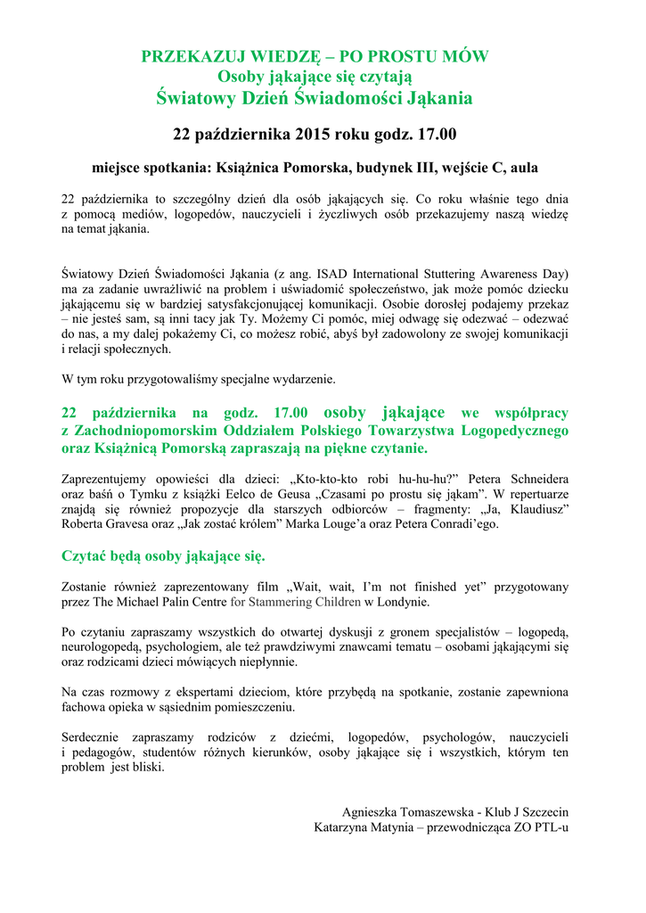 PRZEKAZUJ WIEDZĘ – PO PROSTU MÓW Osoby jąkające się czytają Światowy Dzień Świadomości Jąkania 22 października 2015 roku godz. 17.00 miejsce spotkania: Książnica Pomorska, budynek III, wejście C, aula 22 października to szczególny dzień dla osób jąkających się. Co roku właśnie tego dnia z pomocą mediów, logopedów, nauczycieli i życzliwych osób przekazujemy naszą wiedzę na temat jąkania. Światowy Dzień Świadomości Jąkania (z ang. ISAD International Stuttering Awareness Day) ma za zadanie uwrażliwić na problem i uświadomić społeczeństwo, jak może pomóc dziecku jąkającemu się w bardziej satysfakcjonującej komunikacji. Osobie dorosłej podajemy przekaz – nie jesteś sam, są inni tacy jak Ty. Możemy Ci pomóc, miej odwagę się odezwać – odezwać do nas, a my dalej pokażemy Ci, co możesz robić, abyś był zadowolony ze swojej komunikacji i relacji społecznych. W tym roku przygotowaliśmy specjalne wydarzenie. 22 października na godz. 17.00 osoby jąkające we współpracy z Zachodniopomorskim Oddziałem Polskiego Towarzystwa Logopedycznego oraz Książnicą Pomorską zapraszają na piękne czytanie. Zaprezentujemy opowieści dla dzieci: „Kto-kto-kto robi hu-hu-hu?” Petera Schneidera oraz baśń o Tymku z książki Eelco de Geusa „Czasami po prostu się jąkam”. W repertuarze znajdą się również propozycje dla starszych odbiorców – fragmenty: „Ja, Klaudiusz” Roberta Gravesa oraz „Jak zostać królem” Marka Louge’a oraz Petera Conradi’ego. Czytać będą osoby jąkające się. Zostanie również zaprezentowany film „Wait, wait, I’m not finished yet” przygotowany przez The Michael Palin Centre for Stammering Children w Londynie. Po czytaniu zapraszamy wszystkich do otwartej dyskusji z gronem specjalistów – logopedą, neurologopedą, psychologiem, ale też prawdziwymi znawcami tematu – osobami jąkającymi się oraz rodzicami dzieci mówiących niepłynnie. Na czas rozmowy z ekspertami dzieciom, które przybędą na spotkanie, zostanie zapewniona fachowa opieka w sąsiednim pomieszczeniu. Serdecznie zapraszamy rodziców z dziećmi, logopedów, psychologów, nauczycieli i pedagogów, studentów różnych kierunków, osoby jąkające się i wszystkich, którym ten problem jest bliski. Agnieszka Tomaszewska - Klub J Szczecin Katarzyna Matynia – przewodnicząca ZO PTL-u