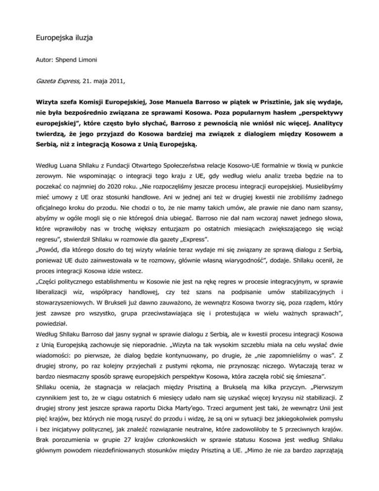 Europejska iluzja Autor: Shpend Limoni Gazeta Express, 21. maja 2011, Wizyta szefa Komisji Europejskiej, Jose Manuela Barroso w piątek w Prisztinie, jak się wydaje, nie była bezpośrednio związana ze sprawami Kosowa. Poza popularnym hasłem „perspektywy europejskiej”, które często było słychać, Barroso z pewnością nie wniósł nic więcej. Analitycy twierdzą, że jego przyjazd do Kosowa bardziej ma związek z dialogiem między Kosowem a Serbią, niż z integracją Kosowa z Unią Europejską. Według Luana Shllaku z Fundacji Otwartego Społeczeństwa relacje Kosowo-UE formalnie w tkwią w punkcie zerowym. Nie wspominając o integracji tego kraju z UE, gdy według wielu analiz trzeba będzie na to poczekać co najmniej do 2020 roku. „Nie rozpoczęliśmy jeszcze procesu integracji europejskiej. Musielibyśmy mieć umowy z UE oraz stosunki handlowe. Ani w jednej ani też w drugiej kwestii nie zrobiliśmy żadnego oficjalnego kroku do przodu. Nie chodzi o to, że nie mamy takich umów, ale prawie nie dano nam szansy, abyśmy w ogóle mogli się o nie któregoś dnia ubiegać. Barroso nie dał nam wczoraj nawet jednego słowa, które wprawiłoby nas w trochę większy entuzjazm po ostatnich miesiącach zwiększającego się wciąż regresu”, stwierdził Shllaku w rozmowie dla gazety „Express”. „Powód, dla którego doszło do tej wizyty właśnie teraz wydaje mi się związany ze sprawą dialogu z Serbią, ponieważ UE dużo zainwestowała w te rozmowy, głównie własną wiarygodność”, dodaje. Shllaku ocenił, że proces integracji Kosowa idzie wstecz. „Części politycznego establishmentu w Kosowie nie jest na rękę regres w procesie integracyjnym, w sprawie liberalizacji wiz, współpracy handlowej, czy też szans na podpisanie umów stabilizacyjnych i stowarzyszeniowych. W Brukseli już dawno zauważono, że wewnątrz Kosowa tworzy się, poza rządem, który jest zawsze pro wszystko, grupa przeciwstawiająca się i protestująca w wielu ważnych sprawach”, powiedział. Według Shllaku Barroso dał jasny sygnał w sprawie dialogu z Serbią, ale w kwestii procesu integracji Kosowa z Unią Europejską zachowuje się nieporadnie. „Wizyta na tak wysokim szczeblu miała na celu wysłać dwie wiadomości: po pierwsze, że dialog będzie kontynuowany, po drugie, że „nie zapomnieliśmy o was”. Z drugiej strony, po raz kolejny przyjechali z pustymi rękoma, nie przynosząc niczego. Wytaczają teraz w bardzo niesmaczny sposób sprawę europejskich perspektyw Kosowa, która zaczęła robić się śmieszna”. Shllaku ocenia, że stagnacja w relacjach między Prisztiną a Brukselą ma kilka przyczyn. „Pierwszym czynnikiem jest to, że w ciągu ostatnich 6 miesięcy udało nam się uzyskać więcej kryzysu niż stabilizacji. Z drugiej strony jest jeszcze sprawa raportu Dicka Marty’ego. Trzeci argument jest taki, że wewnątrz Unii jest pięć krajów, bez których nie mogą ruszyć do przodu i widzę, że są oni w sytuacji bez jakiegokolwiek pomysłu i bez inicjatywy politycznej, jak znaleźć rozwiązanie neutralne, które zadowoliłoby te 5 przeciwnych krajów. Brak porozumienia w grupie 27 krajów członkowskich w sprawie statusu Kosowa jest według Shllaku głównym powodem niezdefiniowanych stosunków między Prisztiną a UE. „Mimo że nie za bardzo zaprzątają sobie głowę Kosowem, nie mają pomysłu na to, jak kupić lepszą pozycję wśród 27 krajów, tak aby Kosowo wyszło na prostą drogę ku integracji, a potem walczyłoby dalej samo, tak jak potrafi”, mówi. Stagnacja także w sprawie wiz Częste wizyty delegacji europejskich w ostatnich dniach uświadomiły nam, że Kosowo jest bardzo daleko od procesu dialogu w sprawie zniesienia wiz. Minister Integracji Europejskiej Vlora Çitaku oczekuje, że UE bardzo szybko rozpocznie rozmowy z władzami Kosowa w sprawie zniesienia wiz oraz innych umów z Kosowem. „Z naszej strony będziemy pracować w celu spełnienia kryteriów i mamy nadzieję, że wkrótce także Komisja Europejska przybędzie z pozytywną odpowiedzią dotyczącą dialogu w sprawie wiz, oczekujemy także postępu w stosunkach handlowych oraz w innych sprawach”, powiedziała Çitaku Radiu Wolna Europa. Natomiast Przewodniczący Komisji Integracji Europejskiej Kosowa Lutfi Haziri przypomniał obietnicę premiera Thaçiego dotyczącą liberalizacji wiz, którą złożył podczas ostatniej kampanii wyborczej. „Mogę swobodnie powiedzieć, że minęło już 8 miesięcy od złożenia obietnicy przez premiera. Ale absolutnie nie chcemy wywołać w obywatelach Kosowa oczekiwania, jeśli chodzi o ten proces, gdyż nie było żadnej daty, żadnego terminu wyznaczonego dla tego procesu”, powiedział Haziri. Według Luana Shllaku winę ponosi także Wspólnota Europejska. „Jeśli chodzi o wizy, jesteśmy w takiej sytuacji, że im więcej czasu mija, im więcej kryteriów obiektywnie spełniamy, im bliżej jesteśmy celu, tym częściej się nam mówi, że nie idziemy do przodu. W międzyczasie wszystko to, co dzieje się wokół, ma wielki wpływ na nasze szanse na wejście do Europy”, powiedział. „Zniesienie wiz, zwłaszcza dla Serbii i Macedonii, kiedy jednocześnie duża część również Albańczyków zaczęła nadużywać tego przywileju, w pewien sposób opóźnia ten proces. Coraz dalej jesteśmy od tej szansy, tak aby w ciągu dwóch-trzech lat móc rozpocząć prace nad zniesieniem wiz”, ocenił Shllaku. Tłum. i red. K.D.
