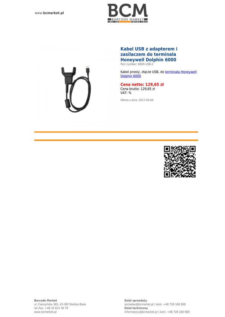 www.bcmarket.pl Kabel USB z adapterem i zasilaczem do terminala Honeywell Dolphin 6000 Part number: 6000-USB-2 Kabel prosty, złącze USB, do terminala Honeywell Dolphin 6000 Cena netto: 129,65 zł Cena brutto: 129,65 zł VAT: % Oferta z dnia: 2017-03-04 Barcode Market ul. Cieszyńska 365, 43-382 Bielsko-Biała tel./fax: +48 33 812 30 79 www.bcmarket.pl Dział sprzedaży [email protected] | kom. +48 726 160 800 Dział techniczny [email protected] | kom. +48 726 160 900