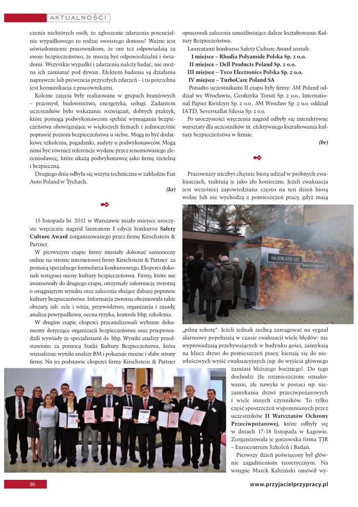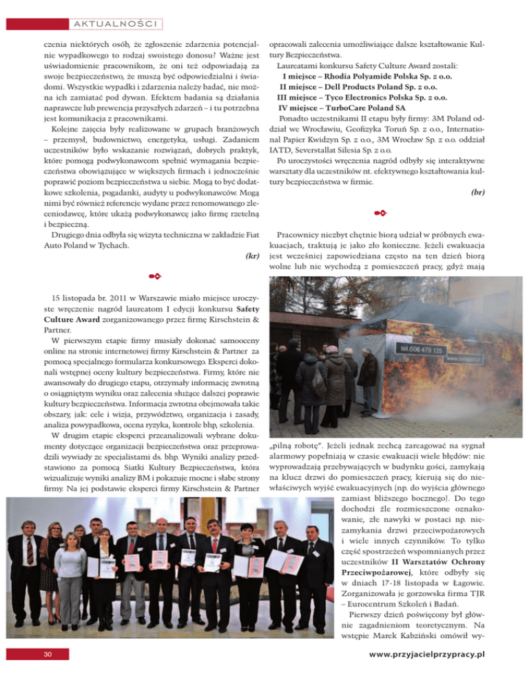 !"# $%&'() czenia niektórych osób, że zgłoszenie zdarzenia potencjal- opracowali zalecenia umożliwiające dalsze kształtowanie Kul- nie wypadkowego to rodzaj swoistego donosu? Ważne jest tury Bezpieczeństwa. uświadomienie pracownikom, że oni też odpowiadają za swoje bezpieczeństwo, że muszą być odpowiedzialni iświadomi. Wszystkie wypadki izdarzenia należy badać, nie moż- Laureatami konkursu Safety Culture Award zostali: Imiejsce – Rhodia Polyamide Polska Sp. zo.o. II miejsce – Dell Products Poland Sp. zo.o. na ich zamiatać pod dywan. Efektem badania są działania III miejsce – Tyco Electronics Polska Sp. zo.o. naprawcze lub prewencja przyszłych zdarzeń – itu potrzebna IV miejsce – TurboCare Poland SA Ponadto uczestnikami II etapu były firmy: 3M Poland od- jest komunikacja zpracownikami. Kolejne zajęcia były realizowane w grupach branżowych dział we Wrocławiu, Geofizyka Toruń Sp. z o.o., Internatio- – przemysł, budownictwo, energetyka, usługi. Zadaniem nal Papier Kwidzyn Sp. zo.o., 3M Wrocław Sp. zo.o. oddział uczestników było wskazanie rozwiązań, dobrych praktyk, IATD, Severstallat Silesia Sp. zo.o. które pomogą podwykonawcom spełnić wymagania bezpie- Po uroczystości wręczenia nagród odbyły się interaktywne czeństwa obowiązujące w większych firmach i jednocześnie warsztaty dla uczestników nt. efektywnego kształtowania kul- poprawić poziom bezpieczeństwa usiebie. Mogą to być dodat- tury bezpieczeństwa wfirmie. kowe szkolenia, pogadanki, audyty upodwykonawców. Mogą (br) nimi być również referencje wydane przez renomowanego zleceniodawcę, które ukażą podwykonawcę jako firmę rzetelną 2 ibezpieczną. Drugiego dnia odbyła się wizyta techniczna wzakładzie Fiat Auto Poland wTychach. Pracownicy niezbyt chętnie biorą udział wpróbnych ewakuacjach, traktują je jako zło konieczne. Jeżeli ewakuacja (kr) jest wcześniej zapowiedziana często na ten dzień biorą wolne lub nie wychodzą z pomieszczeń pracy, gdyż mają 2 15 listopada br. 2011 wWarszawie miało miejsce uroczyste wręczenie nagród laureatom I edycji konkursu Safety Culture Award zorganizowanego przez firmę Kirschstein & Partner. W pierwszym etapie firmy musiały dokonać samooceny online na stronie internetowej firmy Kirschstein & Partner za pomocą specjalnego formularza konkursowego. Eksperci dokonali wstępnej oceny kultury bezpieczeństwa. Firmy, które nie awansowały do drugiego etapu, otrzymały informację zwrotną oosiągniętym wyniku oraz zalecenia służące dalszej poprawie kultury bezpieczeństwa. Informacja zwrotna obejmowała takie obszary, jak: cele i wizja, przywództwo, organizacja i zasady, analiza powypadkowa, ocena ryzyka, kontrole bhp, szkolenia. W drugim etapie eksperci przeanalizowali wybrane dokumenty dotyczące organizacji bezpieczeństwa oraz przeprowa- „pilną robotę”. Jeżeli jednak zechcą zareagować na sygnał dzili wywiady ze specjalistami ds. bhp. Wyniki analizy przed- alarmowy popełniają wczasie ewakuacji wiele błędów: nie stawiono za pomocą Siatki Kultury Bezpieczeństwa, która wyprowadzają przebywających wbudynku gości, zamykają wizualizuje wyniki analizy BM ipokazuje mocne isłabe strony na klucz drzwi do pomieszczeń pracy, kierują się do nie- firmy. Na jej podstawie eksperci firmy Kirschstein & Partner właściwych wyjść ewakuacyjnych (np. do wyjścia głównego zamiast bliższego bocznego). Do tego dochodzi źle rozmieszczone oznakowanie, złe nawyki w postaci np. niezamykania drzwi przeciwpożarowych i wiele innych czynników. To tylko część spostrzeżeń wspomnianych przez uczestników II Warsztatów Ochrony Przeciwpożarowej, które odbyły się w dniach 17-18 listopada w Łagowie. Zorganizowała je gorzowska firma TJR – Eurocentrum Szkoleń iBadań. Pierwszy dzień poświęcony był głównie zagadnieniom teoretycznym. Na wstępie Marek Kabziński omówił wy- 30 www.przyjacielprzypracy.pl %&*&'()+,-. magania prawne wobec inspektora ochrony ppoż. Kolejny wykład nt. odstępstw dopuszczalnych w praktyce ochrony ppoż. wygłosił Mariusz Przysiecki. Następnie Leszek Fijałkowski przedstawił zagadnienia dotyczące metodyki izakresu przeglądów urządzeń przeciwpożarowych oraz przegląd wymagań z zakresu ewakuacji, aBogdan Krukar – wymagania wzakresie oceny zagrożenia wybuchem. Drugiego dnia odbyła się część praktyczna – na początku dobre praktyki i spostrzeżenia z przeprowadzanych ewakuacji. O systemie wykrywania pożaru LIST (Linear Sensing of Temperature – Liniowy Pomiar Temperatury) opowiedział Adam Bartkowski reprezentujący firmę K-Bausysteme. Następnie wykład wprowadzający do ćwiczeń praktycznych wygłosił Tomasz Maciejewicz zfirmy BeHaPoż. Po nim uczestnicy warsztatów udali się na ćwiczenia w tunelu ewakuacyjnym. Naocznie mogli się przekonać jak słaba jest widoczność i utrudniona ewakuacja (mimo zgodnego z przepisami oznakowania) w zadymionym pomieszczeniu. Ćwiczenie to pokazało jak ważne są próbne ewakuacje, znajomość miejsca pracy i wyjść ewakuacyjnych – w innym przypadku przy dużym zadymieniu pozostaje już tylko liczyć na szczęście. SPIDERMASK firmy DELTA PLUS Nowa maska SPIDERMASK składa się z uformowanej siatki z TPE wielokrotnego użytku, inspirowanej pajęczą siecią i wymiennych jednorazowych filtrów. Po 8 godzinach pracy możliwa jest wymiana wkładu filtrującego, zachowując przy tym do ponownego użytku siatkę, zawór oraz gumkę podtrzymującą. Jednorazowy wkład filtrujący połączony jest zsiatką za pomocą odkręcanego zaworu. Do maski dołączonych jest 20 wymiennych wkładów filtrujących FFP2 lub FFP3. Dzięki systemowi umożliwiającemu wielokrotne wykorzystanie siatki, koszt SPIDERMASK może być nawet o40% niższy od tradycyjnej, formowanej maski krótkiego użytkowania. Maska jest wygodna wnoszeniu, posiada regulowane paski oraz mocowanie tylne na zatrzask, co umożliwia dostosowanie j