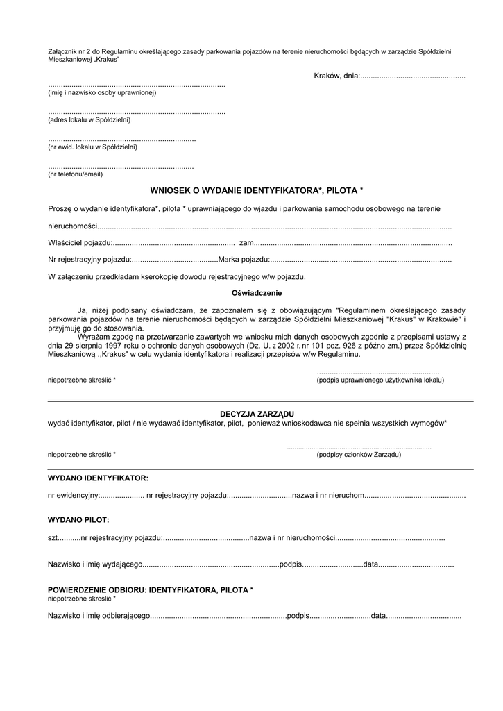 Załącznik nr 2 do Regulaminu określającego zasady parkowania pojazdów na terenie nieruchomości będących w zarządzie Spółdzielni Mieszkaniowej „Krakus” Kraków, dnia:.................................................. .................................................................................... (imię i nazwisko osoby uprawnionej) .................................................................................... (adres lokalu w Spółdzielni) ...................................................................... (nr ewid. lokalu w Spółdzielni) ..................................................................... (nr telefonu/email) WNIOSEK O WYDANIE IDENTYFIKATORA*, PILOTA * Proszę o wydanie identyfikatora*, pilota * uprawniającego do wjazdu i parkowania samochodu osobowego na terenie nieruchomości........................................................................................................................................................................ Właściciel pojazdu:.......................................................... zam.............................................................................................. Nr rejestracyjny pojazdu:.........................................Marka pojazdu:...................................................................................... W załączeniu przedkładam kserokopię dowodu rejestracyjnego w/w pojazdu. Oświadczenie Ja, niżej podpisany oświadczam, że zapoznałem się z obowiązującym "Regulaminem określającego zasady parkowania pojazdów na terenie nieruchomości będących w zarządzie Spółdzielni Mieszkaniowej "Krakus" w Krakowie" i przyjmuję go do stosowania. Wyrażam zgodę na przetwarzanie zawartych we wniosku mich danych osobowych zgodnie z przepisami ustawy z dnia 29 sierpnia 1997 roku o ochronie danych osobowych (Dz. U. z 2002 r. nr 101 poz. 926 z późno zm.) przez Spółdzielnię Mieszkaniową .,Krakus" w celu wydania identyfikatora i realizacji przepisów w/w Regulaminu. .......................................................... niepotrzebne skreślić * (podpis uprawnionego użytkownika lokalu) DECYZJA ZARZĄDU wydać identyfikator, pilot / nie wydawać identyfikator, pilot, ponieważ wnioskodawca nie spełnia wszystkich wymogów* niepotrzebne skreślić * ............................................................................. (podpisy członków Zarządu) WYDANO IDENTYFIKATOR: nr ewidencyjny:..................... nr rejestracyjny pojazdu:..............................nazwa i nr nieruchom................................................ WYDANO PILOT: szt...........nr rejestracyjny pojazdu:.........................................nazwa i nr nieruchomości.................................................... Nazwisko i imię wydającego.................................................................podpis.............................data.................................... POWIERDZENIE ODBIORU: IDENTYFIKATORA, PILOTA * niepotrzebne skreślić * Nazwisko i imię odbierającego.................................................................podpis.............................data....................................