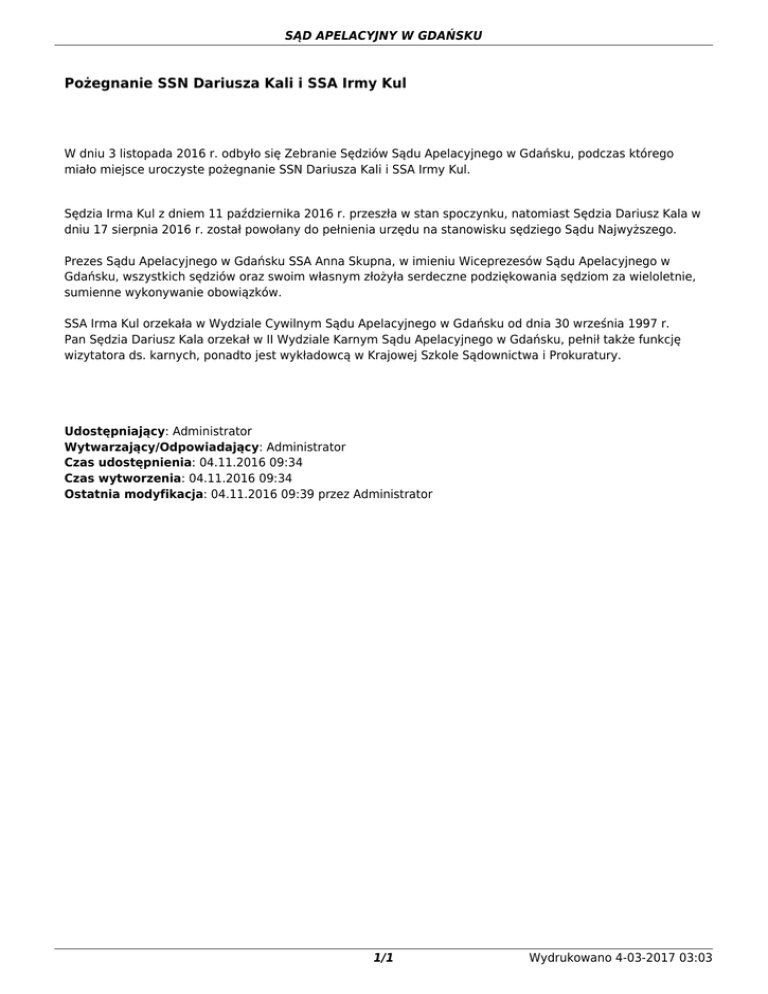 SĄD APELACYJNY W GDAŃSKU Pożegnanie SSN Dariusza Kali i SSA Irmy Kul W dniu 3 listopada 2016 r. odbyło się Zebranie Sędziów Sądu Apelacyjnego w Gdańsku, podczas którego miało miejsce uroczyste pożegnanie SSN Dariusza Kali i SSA Irmy Kul. Sędzia Irma Kul z dniem 11 października 2016 r. przeszła w stan spoczynku, natomiast Sędzia Dariusz Kala w dniu 17 sierpnia 2016 r. został powołany do pełnienia urzędu na stanowisku sędziego Sądu Najwyższego. Prezes Sądu Apelacyjnego w Gdańsku SSA Anna Skupna, w imieniu Wiceprezesów Sądu Apelacyjnego w Gdańsku, wszystkich sędziów oraz swoim własnym złożyła serdeczne podziękowania sędziom za wieloletnie, sumienne wykonywanie obowiązków. SSA Irma Kul orzekała w Wydziale Cywilnym Sądu Apelacyjnego w Gdańsku od dnia 30 września 1997 r. Pan Sędzia Dariusz Kala orzekał w II Wydziale Karnym Sądu Apelacyjnego w Gdańsku, pełnił także funkcję wizytatora ds. karnych, ponadto jest wykładowcą w Krajowej Szkole Sądownictwa i Prokuratury. Udostępniający: Administrator Wytwarzający/Odpowiadający: Administrator Czas udostępnienia: 04.11.2016 09:34 Czas wytworzenia: 04.11.2016 09:34 Ostatnia modyfikacja: 04.11.2016 09:39 przez Administrator 1/1 Wydrukowano 4-03-2017 03:03