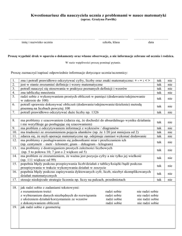 Kwestionariusz dla nauczyciela ucznia z problemami w nauce matematyki (oprac. Grażyna Pawlik) ……..……………………………………………………… imię i nazwisko ucznia …………………… szkoła, klasa ………………………. data Proszę wypełnić druk w oparciu o dokumenty oraz własne obserwacje, a nie informacje zebrane od ucznia i rodzica. W razie wątpliwości proszę pominąć pytanie. Proszę zaznaczyć/zapisać odpowiednie informacje dotyczące ucznia/uczennicy: 1. 2. 3. 4. 5. 6. 7. 8. 9. 10. 11. 12. 13. 14. 15. 16. 17. 18. 19. zna i potrafi prawidłowo odczytywać cyfry, liczby oraz znaki matematyczne: + - = : < > jest w stanie zrozumieć definicje i wzory matematyczne potrafi nauczyć się stosowania w praktyce poznanych definicji i wzorów zna tabliczkę mnożenia radzi sobie z wykonywaniem prostych obliczeń w pamięci (dodawanie/odejmowanie w zakresie do 100) potrafi sprawnie dokonywać obliczeń (dodawanie/odejmowanie/dzielenie) metodą pisemną na liczbach powyżej 100 potrafi prawidłowo odczytywać duże liczby np. 1326 ma problemy z szacowaniem (zdarza się, że dochodzi do absurdalnego wyniku działania i nie weryfikuje go posługując się szacowaniem) ma problem z odczytywaniem informacji z wykresów / diagramów ma trudności ze zrozumieniem pojęcia ułamków (np. że 1/20 jest mniejsza od 2) zdarza się, że myli operacje matematyczne np. odejmuje zamiast wykonać dodawanie ma problemy z posługiwaniem się jednostkami miar i przeliczaniem ich (np. centymetr – metr - kilometr; gram – dekagram - kilogram) ma problemy z dostrzeganiem prostych zależności liczbowych (np. 5 to połowa 10; 7 jest o 2 większe od 5) ma problem ze zrozumieniem, że ważna jest pozycja cyfry a nie tylko jej wielkość (np. 111 większe od 99) popełnia błędy podczas przepisywania liczb/działań z tablicy/książki bądź podczas przepisywania w trakcie wykonywania działań w zeszycie popełnia błędy podczas zapisywania dyktowanych cyfr, liczb, niezbyt skomplikowanych działań matematycznych stosuje niedojrzałe strategie liczenia np. liczy na palcach, przedmiotach jak radzi sobie z zadaniami tekstowymi: z rozumieniem treści z wybieraniem danych niezbędnych do rozwiązania z ułożeniem działań/korzystaniem ze wzorów z dokonywaniem obliczeń jak radzi sobie z geometrią: radzi sobie radzi sobie radzi sobie radzi sobie tak tak tak tak nie nie nie nie tak nie tak nie tak nie tak nie tak tak tak nie nie nie tak nie tak nie tak nie tak nie tak nie tak nie nie radzi sobie nie radzi sobie nie radzi sobie nie radzi sobie 20. 21. 22. 23. 24. 25. 26. jest systematycznie obecny na zajęciach z matematyki prowadzi zeszyt uważa podczas zajęć pyta jeśli czegoś nie rozumie zgłasza się do odpowiedzi odrabia prace domowe oceny z matematyki ma wyraźnie gorsze od ocen z innych przedmiotów wykazuje motywację do nauki: wysoką przeciętną obniżoną podczas zajęć koncentracja jest: bardzo dobra przeciętna obniżona tempo pracy jest: szybkie przeciętne wolne tak nie tak nie tak nie tak nie tak nie tak nie tak nie brak motywacji brak koncentracji bardzo wolne ma problemy w nauce matematyki od klasy ……..... szkoły podstawowej / gimnazjum oceny z matematyki: w bieżącym roku ……………. w poprzednim roku ………….. na koniec poprzedniego etapu edukacyjnego …………….. pracuje nad pokonywaniem trudności: uczestnicząc w zajęciach wyrównawczych z matematyki (jak często, od kiedy)……………………. pracując w domu pod kierunkiem nauczyciela – jak? w inny sposób – jaki? 27. w nauce matematyki najlepiej radzi sobie z: 28. w nauce matematyki najgorzej radzi sobie z: 29. z czego, zdaniem nauczyciela, wynikają problemy w nauce matematyki: 30. inne ważne informacje: pieczęć szkoły podpis nauczyciela