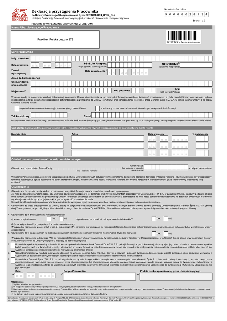 Nr wniosku/Nr polisy Deklaracja przystąpienia Pracownika 9 0 0 0 0 0 2 8 1 3 4 do Umowy Grupowego Ubezpieczenia na Życie CERTUM (DP4_C/CM_GL) Niniejszą Deklarację Pracownik zobowiązany jest przekazać niezwłocznie Ubezpieczającemu. Strona 1 z 2 PROSIMY O WYPEŁNIANIE DRUKOWANYMI LITERAMI Nazwa Ubezpieczającego/Pracodawcy Praktiker Polska Leszno 373 Dane Pracownika Imię i nazwisko Data urodzenia D D M M PESEL/nr Paszportu R R R R Obywatelstwo (w przypadku obcokrajowców) Zawód wykonywany Data zatrudnienia 3) 2) (jeśli inne niż polskie) D D M M R R R R Adres do korespondencji Ulica, nr domu, nr mieszkania Kod pocztowy Miejscowość Kraj - (jeśli inny niż Polska) Wyrażam zgodę na doręczenie wszelkiej dokumentacji związanej z Umową ubezpieczenia, w tym rocznych informacji o wysokości świadczeń przysługujących z tytułu zawartej Umowy oraz wartości wykupu ubezpieczenia, a także dokumentu ubezpieczenia potwierdzającego przystąpienie do Umowy (certyfikatu) oraz korespondencji kierowanej przez Generali Życie T.U. S.A. w trakcie trwania Umowy, o ile zapisy OWU nie stanowią inaczej: za pośrednictwem serwisu informacyjno-transakcyjnego Konto Klienta Tel. komórkowy na wskazany przeze mnie adres e-mail lub na innym trwałym nośniku informacji E-mail Podany numer telefonu komórkowego służy do wysłania w formie SMS informacji dotyczących obsługiwanych umów ubezpieczenia np. klucza aktywacyjnego niezbędnego do zarejestrowania się w Koncie Klienta. Uposażeni (łączna wartość powinna wynosić 100%) - Uposażonych można również wskazać/zmienić za pośrednictwem Konta Klienta Adres Nazwisko i Imię % świadczenia Data urodzenia D D M M R R R R D D M M R R R R D D M M R R R R Oświadczenie o pozostawaniu w związku nieformalnym numer PESEL Data urodzenia (w przypadku Oświadczam, że pozostaję z Panem/Panią………………………………………………………………………………………………………….. ( Imię i Nazwisko Partnera) w związku nieformalnym. obcokrajowców) Wskazanie Partnera oznacza, że ochroną ubezpieczeniową z tytułu Umów Dodatkowych dotyczących Współmałżonka będą objęte zdarzenia dotyczące wyłącznie Partnera – również wówczas, gdy Ubezpieczony formalnie pozostaje lub będzie pozostawał na dzień zdarzenia w związku małżeńskim z inną osobą. Wskazanie Partnera jest możliwe wyłącznie w przypadku umów, gdzie strony Umowy przewidziały taką możliwość. Oświadczenia 1. Oświadczam, że zgodnie z moją wiedzą i przekonaniem wszystkie informacje zawarte powyżej są prawdziwe i wyczerpujące. Ja, niżej podpisana(y) wyrażam zgodę, aby wszystkie oświadczenia złożone w tej deklaracji oraz innych dokumentach przedłożonych Generali Życie T.U. S.A. w związku z Umową, stanowiły podstawę objęcia mnie ochroną ubezpieczeniową na podstawie tej Umowy. Podpisując deklarację, oświadczam, że chcę skorzystać z zastrzeżenia na moją rzecz ochrony ubezpieczeniowej na zasadach określonych w Umowie i wyrażam jednocześnie zgodę na jej warunki, w tym na wysokość sumy ubezpieczenia. Upoważniam Ubezpieczającego do wyrażania w moim imieniu wymaganej zgody na zmianę warunków zastrzeżonej na moją rzecz ochrony ubezpieczeniowej. 2. Oświadczam, że przed przystąpieniem do Umowy zostały mi doręczone oraz zapoznałam(em) się z warunkami, o których stanowi Umowa zawarta pomiędzy Ubezpieczającym a Generali Życie T.U. S.A. (zwaną dalej Towarzystwem), w tym z Ogólnymi Warunkami Grupowego Ubezpieczenia na Życie CERTUM, Skorowidzem, zakresem ochrony oraz wysokością sum ubezpieczenia wynikających z Umowy. 3. Oświadczam, że w dniu wypełniania niniejszej Deklaracji: a) jestem hospitalizowany TAK NIE b) przebywam na ponad 14- dniowym zwolnieniu lekarskim4) TAK NIE Dotyczy wyłącznie osób przystępujących w dacie zawarcia Umowy. W przypadku zaznaczenia w pkt. a) lub w pkt. b) odpowiedzi TAK, konieczne jest dołączenie do niniejszej Deklaracji dokumentacji potwierdzającej okres i warunki objęcia ochroną z tytułu wcześniejszej umowy ubezpieczenia. 4. Oświadczam, że w ciągu ostatnich 12 miesięcy przebywałem na zwolnieniu lekarskim trwającym nieprzerwanie 4 tygodnie lub więcej TAK NIE W przypadku zaznaczenia odpowiedzi TAK, do niniejszej Deklaracji należy dołączyć wypełniony Kwestionariusz medyczny (dostępny u Ubezpieczajacego, w oddziałach lub na stronie www.generali.pl). Dotyczy osób przystępujących do Umowy po upływie 3 miesięcy od daty nabycia prawa 5. 6. 7. Upoważniam podmioty prowadzące działalność leczniczą do udzielenia na wniosek Generali Życie T.U. S.A., pełnej informacji, w tym dokumentacji, dotyczącej mojego stanu zdrowia – z wyłączeniem wyników badań genetycznych - w tym historii choroby, jak również przyczyny śmierci, w celu dokonania oceny ryzyka lub prowadzenia postępowania celem ustalenia odpowiedzialności zakładu ubezpieczeń lub wysokości świadczenia; niniejsze upoważnienie nie wygasa z dniem mojej śmierci. Upoważniam Narodowy Fundusz Zdrowia do udzielenia na wniosek Generali Życie T.U. S.A., danych o nazwach i adresach świadczeniodawców, którzy udzielili świadczeń opieki zdrowotnej w związku z wypadkiem lub zdarzeniem losowym będącym podstawą ustalenia odpowiedzialności oraz wysokości odszkodowania lub świadczenia. Upoważniam Generali Życie T.U. S.A. do udostępnienia na żądanie innego zakładu ubezpieczeń przetwarzanych przez Generali Życie T.U. S.A. moich danych osobowych, w celu oceny ryzyka ubezpieczeniowego i weryfikacji danych podanych przez Ubezpieczającego lub Ubezpieczonego lub osobę na rzecz której ma zostać zawarta Umowa, ustalenia prawa do świadczenia z tytułu Umowy i wysokości tego świadczenia, a także do udzielenia posiadanych informacji o przyczynie śmierci lub informacji niezbędnych do ustalenia prawa uprawnionego do świadczenia z tytułu umowy ubezpieczenia 