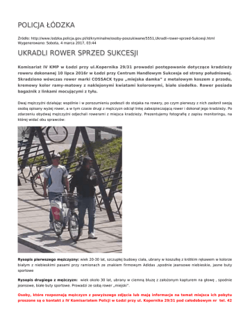 POLICJA ŁÓDZKA Źródło: http://www.lodzka.policja.gov.pl/ld/kryminalne/osoby-poszukiwane/5551,Ukradli-rower-sprzed-Sukcesji.html Wygenerowano: Sobota, 4 marca 2017, 03:44 UKRADLI ROWER SPRZED SUKCESJI Komisariat IV KMP w Łodzi przy ul.Kopernika 29/31 prowadzi postępowanie dotyczące kradzieży roweru dokonanej 10 lipca 2016r w Łodzi przy Centrum Handlowym Sukcesja od strony południowej. Skradziono wówczas rower marki COSSACK typu „miejska damka” z metalowym koszem z przodu, kremowy kolor ramy-matowy z naklejonymi kwiatami kolorowymi, białe siodełko. Rower posiada bagażnik z linkami mocującymi z tyłu. Dwaj mężczyźni działając wspólnie i w porozumieniu podeszli do stojaka na rowery, po czym pierwszy z nich zasłonił swoją osobą opisany wyżej rower, a w tym czasie drugi z mężczyzn odciął linkę zabezpieczającą rower i dokonał jego kradzieży. Po zdarzeniu obydwaj mężczyźni odjechali rowerami z miejsca kradzieży. Prezentujemy fotografię z zapisu monitoringu, na której widać obu sprawców: Rysopis pierwszego mężczyzny: wiek 20-30 lat, szczupłej budowy ciała, ubrany w koszulkę z krótkim rękawem w kolorze białym z niebieskimi pasami przy ramionach ze znakiem firmowym Adidas ,spodnie jeansowe niebieskie, jasne buty sportowe Rysopis drugiego z mężczyzn: wiek około 30 lat, ubrany w ciemną bluzę z założonym kapturem na głowę , spodnie jeansowe, białe buty sportowe. Prowadzi ze sobą rower „miejski”. Osoby, które rozpoznają mężczyzn z powyższego zdjęcia lub mają informacje na temat miejsca ich pobytu proszone są o kontakt z IV Komisariatem Policji w Łodzi przy ul. Kopernika 29/31 pod całodobowym nr tel. 42 665 23 00 lub 42 665 23 01 lub prowadzącym postępowanie asp.szt. Pawłem Kusowskim tel 042 6652377 w godz.8-16. Ocena: 0/5 (0) Tweetnij poszukiwany