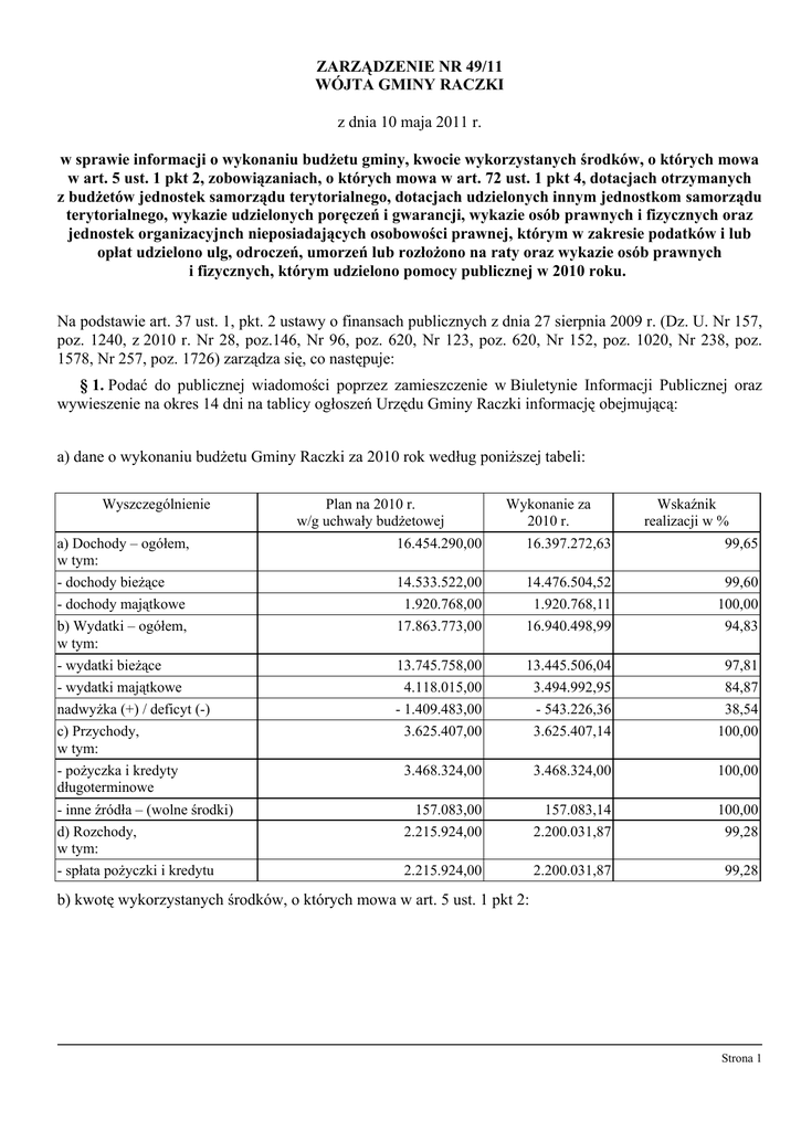 ZARZĄDZENIE NR 49/11 WÓJTA GMINY RACZKI z dnia 10 maja 2011 r. w sprawie informacji o wykonaniu budżetu gminy, kwocie wykorzystanych środków, o których mowa w art. 5 ust. 1 pkt 2, zobowiązaniach, o których mowa w art. 72 ust. 1 pkt 4, dotacjach otrzymanych z budżetów jednostek samorządu terytorialnego, dotacjach udzielonych innym jednostkom samorządu terytorialnego, wykazie udzielonych poręczeń i gwarancji, wykazie osób prawnych i fizycznych oraz jednostek organizacyjnch nieposiadających osobowości prawnej, którym w zakresie podatków i lub opłat udzielono ulg, odroczeń, umorzeń lub rozłożono na raty oraz wykazie osób prawnych i fizycznych, którym udzielono pomocy publicznej w 2010 roku. Na podstawie art. 37 ust. 1, pkt. 2 ustawy o finansach publicznych z dnia 27 sierpnia 2009 r. (Dz. U. Nr 157, poz. 1240, z 2010 r. Nr 28, poz.146, Nr 96, poz. 620, Nr 123, poz. 620, Nr 152, poz. 1020, Nr 238, poz. 1578, Nr 257, poz. 1726) zarządza się, co następuje: § 1. Podać do publicznej wiadomości poprzez zamieszczenie w Biuletynie Informacji Publicznej oraz wywieszenie na okres 14 dni na tablicy ogłoszeń Urzędu Gminy Raczki informację obejmującą: a) dane o wykonaniu budżetu Gminy Raczki za 2010 rok według poniższej tabeli: Wyszczególnienie a) Dochody – ogółem, w tym: - dochody bieżące - dochody majątkowe b) Wydatki – ogółem, w tym: - wydatki bieżące - wydatki majątkowe nadwyżka (+) / deficyt (-) c) Przychody, w tym: - pożyczka i kredyty długoterminowe - inne źródła – (wolne środki) d) Rozchody, w tym: - spłata pożyczki i kredytu Plan na 2010 r. w/g uchwały budżetowej 16.454.290,00 Wykonanie za 2010 r. 16.397.272,63 Wskaźnik realizacji w % 99,65 14.533.522,00 1.920.768,00 17.863.773,00 14.476.504,52 1.920.768,11 16.940.498,99 99,60 100,00 94,83 13.745.758,00 4.118.015,00 - 1.409.483,00 3.625.407,00 13.445.506,04 3.494.992,95 - 543.226,36 3.625.407,14 97,81 84,87 38,54 100,00 3.468.324,00 3.468.324,00 100,00 157.083,00 2.215.924,00 157.083,14 2.200.031,87 100,00 99,28 2.215.924,00 2.200.031,87 99,28 b) kwotę wykorzystanych środków, o których mowa w art. 5 ust. 1 pkt 2: Strona 1 Lp. Projekt Dz. Rozdz. § Planowane wydatki w okresie realizacji projektu Ogółem(7 + 8 + 9) 1. 2. 1. Nazwa programu Priorytet Działanie Nazwa projektu 2010 rok 2. 3. 4. środki z budżetu gminy 3. 4. 5. 6. 7. Program Operacyjny Innowacyjna Gospodarka środki dotacja celowa z budżetu z budżetu UE krajowego 8. 9. Społeczeństwo informacyjne – zwiększenie innowacyjności gospodarki 8.3 Przeciwdziałanie wykluczeniu cyfrowemu – e-Inclusion „Suwalski internet równych szans” 750 75095 6058, 9.208,36 1.381,25 7.827,11 0,00 6059 2011 rok 750 75095 6058, 339.450,15 50.917,52 288.532,63 0,00 6059 2012 rok 750 75095 6058, 128.641,79 19.296,27 109.345,52 0,00 6059 Razem planowane wydatki 477.300,30 71.595,05 405.705,25 0,00 Nazwa Regionalny Program Operacyjny Województwa Podlaskiego programu Priorytet Rozwój Infrastruktury Ochrony Środowiska Działanie 5.2 Rozwój Lokalnej Infrastruktury Ochrony Środowiska. Projekty z zakresu Ochrony Przyrody Nazwa Zintegrowany projekt ochrony przyrody na obszarach chronionych Pojezierza projektu Suwalsko – Augustowskiego poprzez zakup sprzętu ratowniczego 2010 rok 754 75412 6649 4.000,00 4.000,00 0,00 0,00 2011 rok 754 75412 6648, 275.184,00 41.278,00 233.906,00 0,00 6649 Razem planowane wydatki 279.184,00 45.278,00 233.906,00 0,00 Nazwa Program Operacyjny Kapitał Ludzki programu Priorytet Rozwój wykształcenia i kompetencji w regionach Działanie 9.5 Oddolne inicjatywy edukacyjne na obszarach wiejskich Nazwa „Edukacja to droga w przyszłość” projektu 2010 rok 853 85395 wydatki 49.610,00 0,00 42.168,50 7.441,50 bieżące Nazwa Program Operacyjny Kapitał Ludzki programu Priorytet Wysoka jakość sysytemu oświaty Działanie 3.3 Poprawa jakości kształcenia Nazwa „Mały Archimedes” projektu 2010 rok 801 80195 wydatki 63.460,00 0,00 53.941,00 9.519,00 bieżące 2011 rok 801 80195 wydatki 59.160,00 0,00 50.286,00 8.874,00 bieżące Wykonanie % wykonania planu 10. 11. x x x x x x x x 0,00 0,00 x x x x 0,00 x 0,00 x x x x x x x 4.000,00 x 100,00 x 4.000,00 x 1,43 x x x x x x x 49.609,97 100,00 x x x x x x x x 60.914,42 95.99 x x Strona 2 5. 6. 2012 rok 801 80195 wydatki 26.020,00 0,00 22.117,00 3.903,00 x bieżące 2013 rok 801 80195 wydatki 15.620,00 0,00 13.277,00 2.343,00 x bieżące Razem planowane wydatki 164.260,00 0,00 139.621,00 24.639,00 60.914,42 Nazwa Program Rozwoju Obszarów Wiejskich 2007 - 2013 x programu Priorytet x Działanie 4.1 Wdrażanie lokalnych strategii rozwoju x Nazwa „Rospuda off road music” – warsztaty muzyczne nad Rospudą x projektu 2010 rok 921 92195 wydatki 44.430,00 19.545,00 24.885,00 0,00 43.465,49 bieżące Nazwa Program Operacyjny Kapitał Ludzki x programu Priorytet Rozwój wykształcenia i kompetencji w regionach x Działanie Wyrównywanie szans edukacyjnych i zapewnienie wysokiej jakości usług x edukacyjnych świadczonych w sysytemie oświaty Nazwa „Lepszy start – Lepsze Jutro” x projektu 2010 rok 853 85395 wydatki 31.150,00 0,00 26.477,50 4.672,50 31.067,50 bieżące 2011 rok 853 85395 wydatki 54.100,00 0,00 45.985,00 8.115,00 x bieżące Razem planowane wydatki 85.250,00 0,00 72.462,50 12.787,50 31.067,50 Ogółem: 1.100.034,30 136.418,05 918.748,25 44.868,00 189.057,38 x x 37,08 x x x x 97,83 x x x x 99,74 x 36,44 17,19 c) zobowiązania, o których mowa w art. 72 ust.1 pkt 4 ustawy: Zobowiązania wymagalne na dzień 31 grudnia 2010 roku w gminie nie wystąpiły, d) kwoty dotacji otrzymanych z budżetu jednostek samorządu terytorialnego oraz kwoty dotacji udzielonych innym jednostkom samorządu terytorialnego: Gmina otrzymała następujące dotacje z budżetu jednostek samorządu terytorialnego: a) na zadania zlecone, w tym: - z Podlaskiego Urzędu Wojewódzkiego w Białymstoku w następującym zakresie: ● Administracji publicznej - 68.000,00 zł