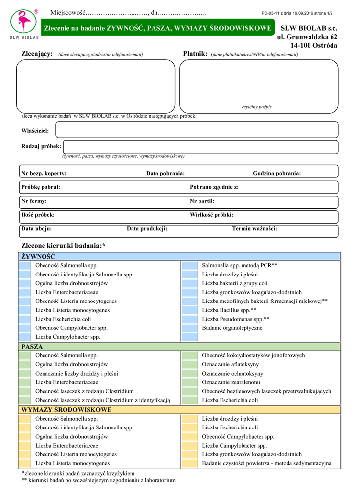 Miejscowość…………………..……, dn.…………………. PO-03-11 z dnia 19.09.2016 strona 1/2 Zlecenie na badanie ŻYWNOŚĆ, PASZA, WYMAZY ŚRODOWISKOWE Zlecający: Płatnik: (dane zlecającego/adres/nr telefonu/e-mail) SLW BIOLAB s.c. ul. Grunwaldzka 62 14-100 Ostróda (dane płatnika/adres/NIP/nr telefonu/e-mail) czytelny podpis zleca wykonanie badań w SLW BIOLAB s.c. w Ostródzie następujących próbek: Właściciel: Rodzaj próbek: (żywność, pasza, wymazy czystościowe, wymazy środowiskowe) Nr bezp. koperty: Data pobrania: Godzina pobrania: Próbkę pobrał: Pobrano zgodnie z: Nr fermy: Nr partii: Ilość próbek: Wielkość próbki: Data uboju: Data produkcji: Termin ważności: Zlecone kierunki badania:* ŻYWNOŚĆ Obecność Salmonella spp. Salmonella spp. metodą PCR** Obecność i identyfikacja Salmonella spp. Liczba drożdży i pleśni Ogólna liczba drobnoustrojów Liczba bakterii z grupy coli Liczba Enterobacteriaceae Liczba gronkowców koagulazo-dodatnich Obecność Listeria monocytogenes Liczba mezofilnych bakterii fermentacji mlekowej** Liczba Listeria monocytogenes Liczba Bacillus spp.** Liczba Escherichia coli Liczba Pseudomonas spp.** Obecność Campylobacter spp. Badanie organoleptyczne Liczba Campylobacter spp. PASZA Obecność Salmonella spp. Obecność kokcydiostatyków jonoforowych Ogólna liczba drobnoustrojów Oznaczanie aflatoksyny Oznaczanie liczby drożdży i pleśni Oznaczanie ochratoksyny Liczba Enterobacteriaceae Oznaczanie zearalenonu Obecność laseczek z rodzaju Clostridium Obecność beztlenowych laseczek przetrwalnikujących Obecność laseczek z rodzaju Clostridium z identyfikacją Liczba Escherichia coli WYMAZY ŚRODOWISKOWE Obecność Salmonella spp. Liczba drożdży i pleśni Obecność i identyfikacja Salmonella spp. Liczba Escherichia coli Ogólna liczba drobnoustrojów Obecność Campylobacter spp. Liczba Enterobacteriaceae Liczba Campylobacter spp. Obecność Listeria monocytogenes Liczba gronkowców koagulazo-dodatnich Liczba Listeria monocytogenes Badanie czystości powietrza - metoda sedymentacyjna *zlecone kierunki badań zaznaczyć krzyżykiem ** kierunki badań po wcześniejszym uzgodnieniu z laboratorium PO-03-11 z dnia 19.09.2016 strona 2/2 Inne kierunki badań: (po uzgodnieniu z laboratorium)………………………………………………….... Dodatkowe informacje: …………………………………………………………………………. (badanie przechowalnicze, nr zlecenia na badanie) Sposób przekazania sprawozdania: telefonicznie, poczta, fax, e-mail, osobiście Osoby upoważnione do uzyskania bieżących informacji z badania: Osoby upoważnione do otrzymania sprawozdania z badania: Laboratorium zobowiązuje się do przeprowadzenia badań według obowiązujących w laboratorium procedur i instrukcji badawczych. Laboratorium zobowiązuje się do zachowania poufności wyników badań i praw własności klienta, o ile przepisy nie stanowią inaczej i archiwizowanie ich przez okres 3 lat. Klientowi lub osobie przez niego upoważnionej przysługuje prawo do wglądu do dokumentacji dotyczącej jego badań, uzyskiwania bieżących informacji i uczestnictwa w badaniu na każdym jego etapie oraz złożenia skargi do Kierownika Laboratorium, wg obowiązującej w Laboratorium procedury. Płatnik zobowiązuje się do zapłaty należności za badania w ciągu 14 dni od dnia otrzymania Faktury na konto Wykonawcy PKO BP 34 1020 3613 0000 6102 0033 6297 wg cennika obowiązującego w laboratorium. W sprawach nieuregulowanych niniejszą umową mają zastosowanie przepisy Kodeksu Cywilnego. ..…………………………………….. Podpis zlecającego UWAGA! Za prawidłowe pobranie i dostarczenie do badania próbek odpowiada zleceniodawca. Przy kontaktowaniu się z zapytaniem o wyniki badania prosimy powoływać się na numer zlecenia nadany przez Laboratorium lub nazwisko klienta. Uwagi …………… ………………………………………………………………………………………………………………. …………………………………………………………………………………………………………………………………….